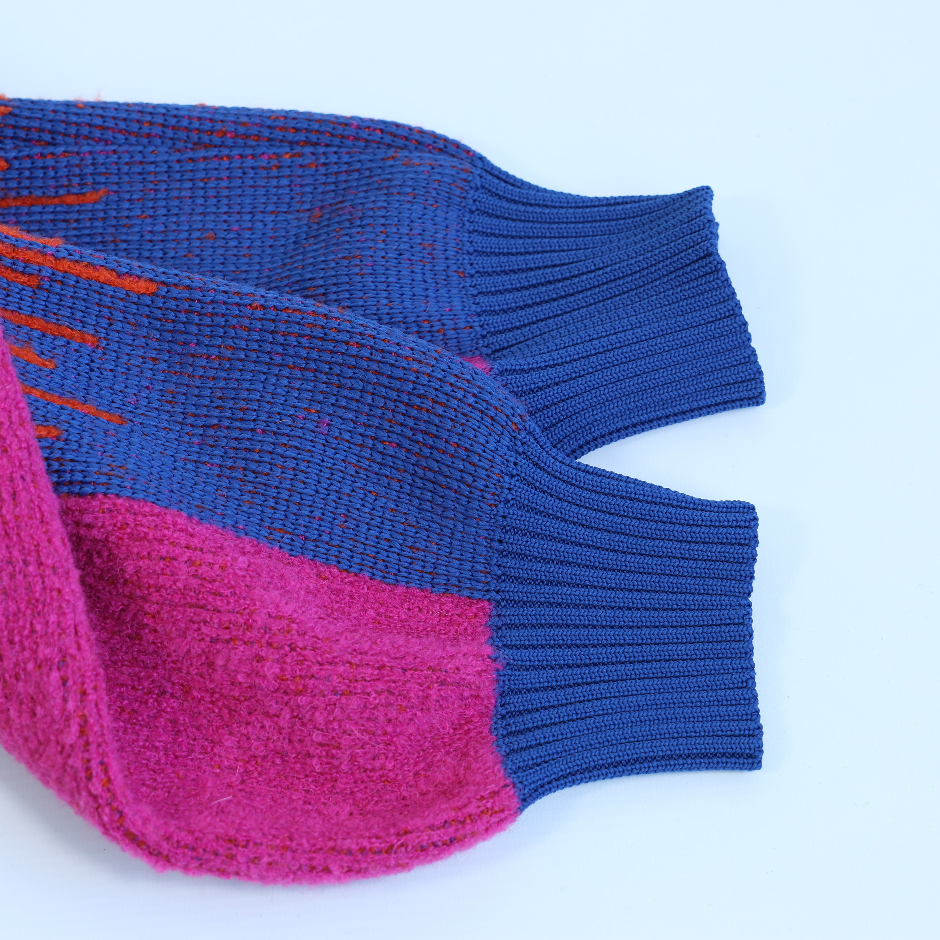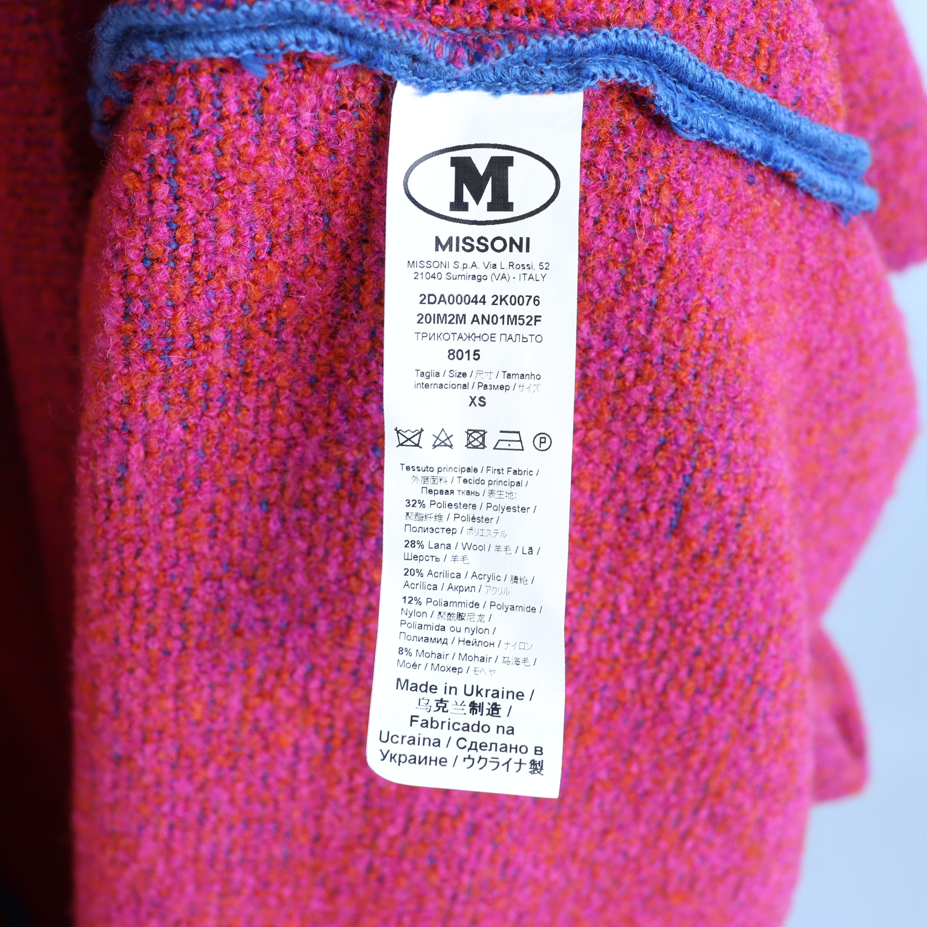 Missoni long wool blend knit cardigan in vibrant pink, orange, and blue. This XS statement piece features bold color blocking, front buttons, and practical patch pockets — a luxurious layer with signature Missoni flair.Brand: MissoniSize: XSLength: 143 cm Shoulder width: 62 cmBust width: 42 cmSleeve lenght: 57 cmCondition: Never worn, with tagCondition Details: -Main colour: PurpleColours: Blue, PinkMaterial: Wool, PolyesterComes With: Brand tag