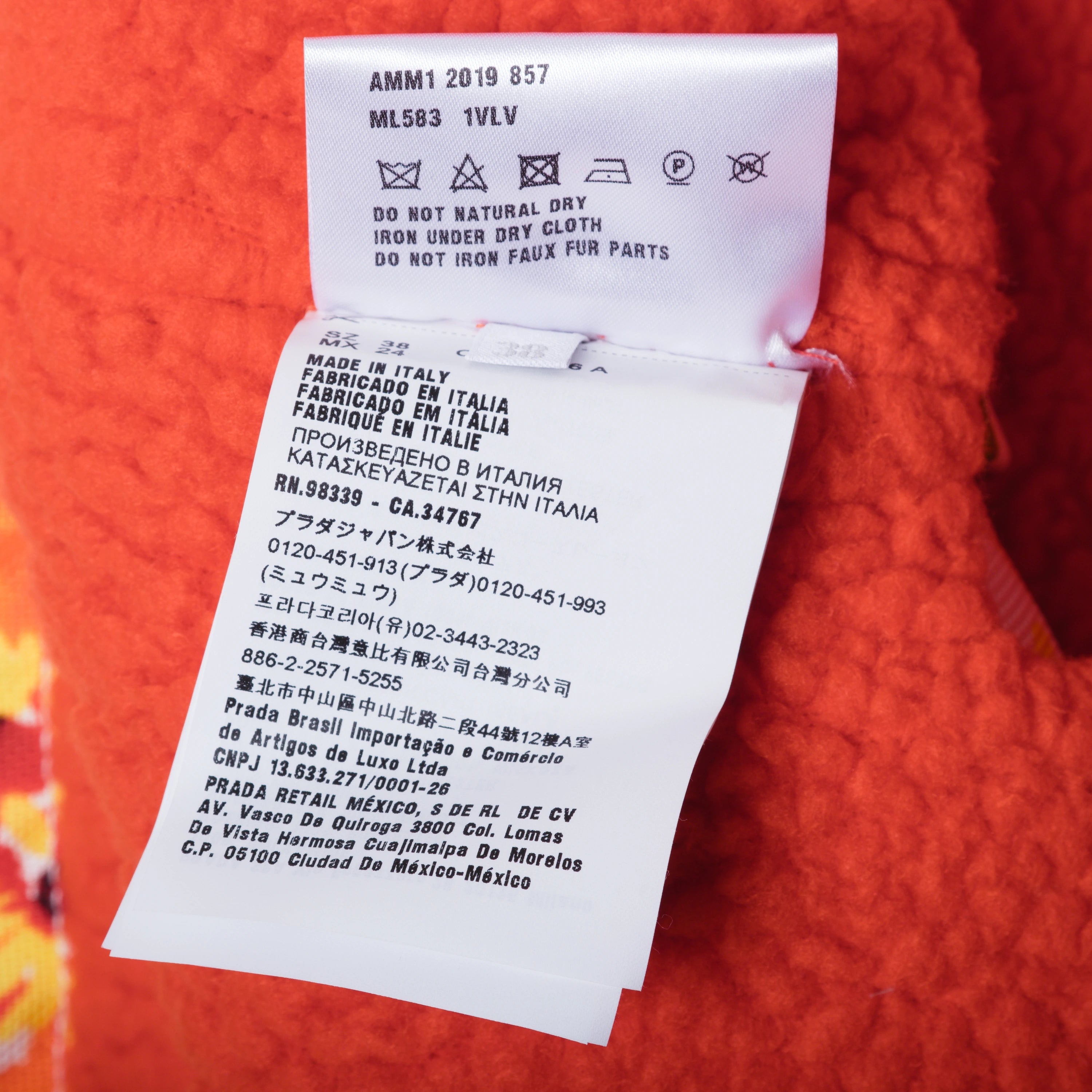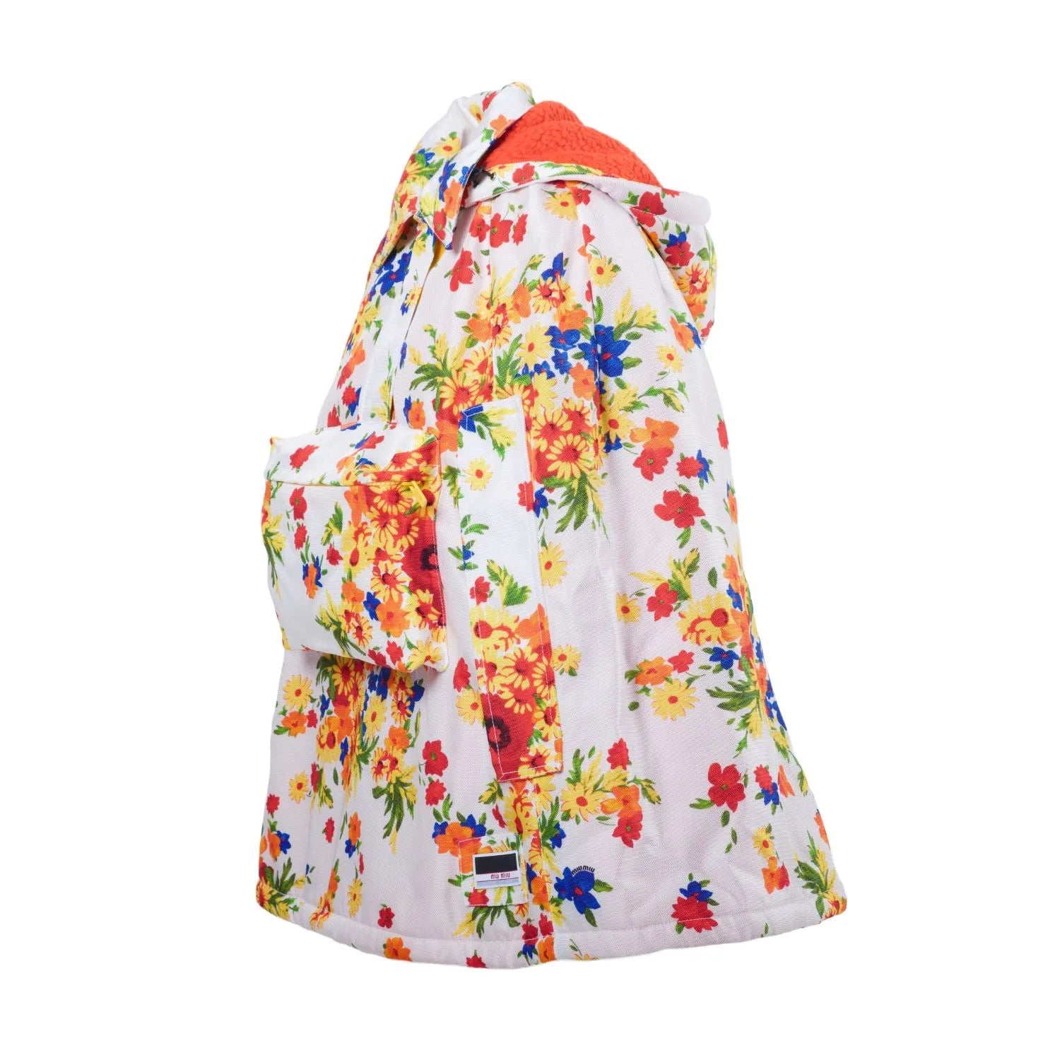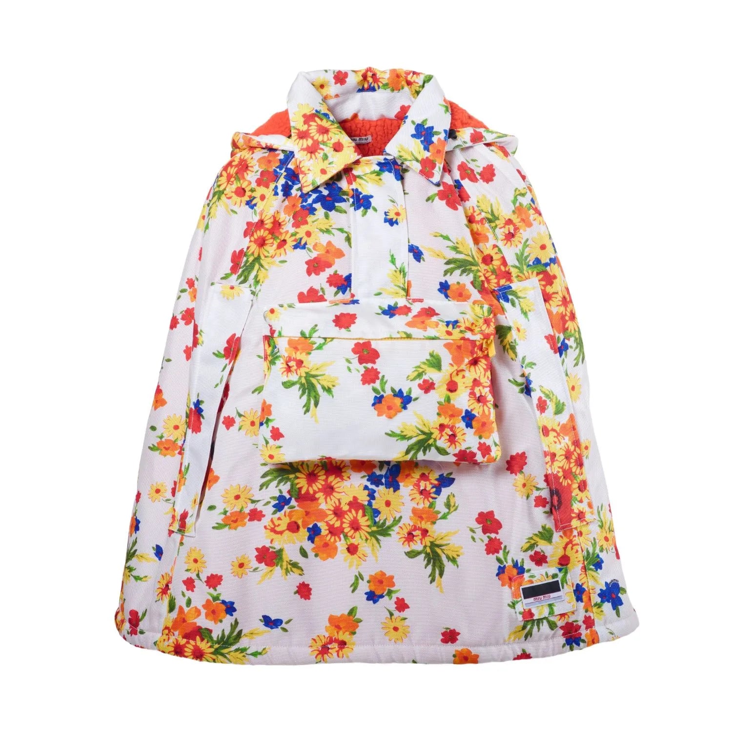 This Miu Miu cape from the Fall–Winter 2019/2020 collection reinterprets functional outerwear through a refined, feminine lens. Crafted from technical fabric, it features a vibrant all-over floral print with subtle logo detailing, balancing practicality with bold visual impact.