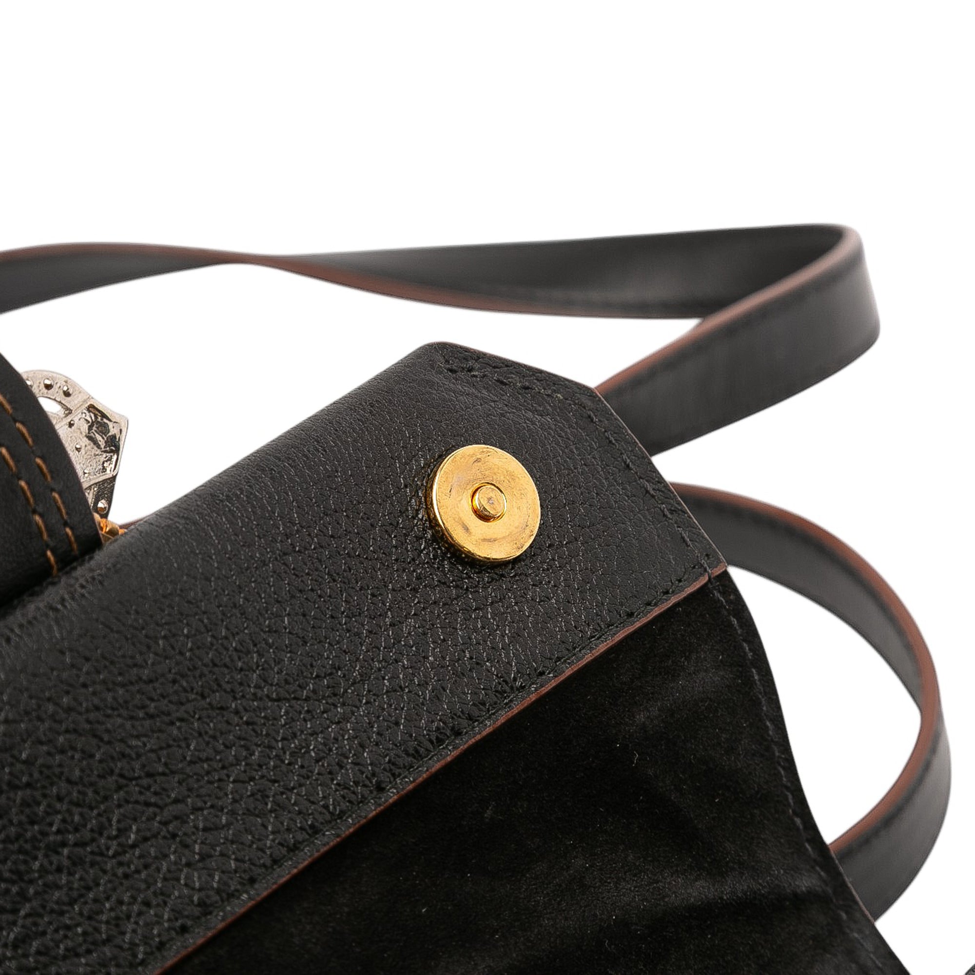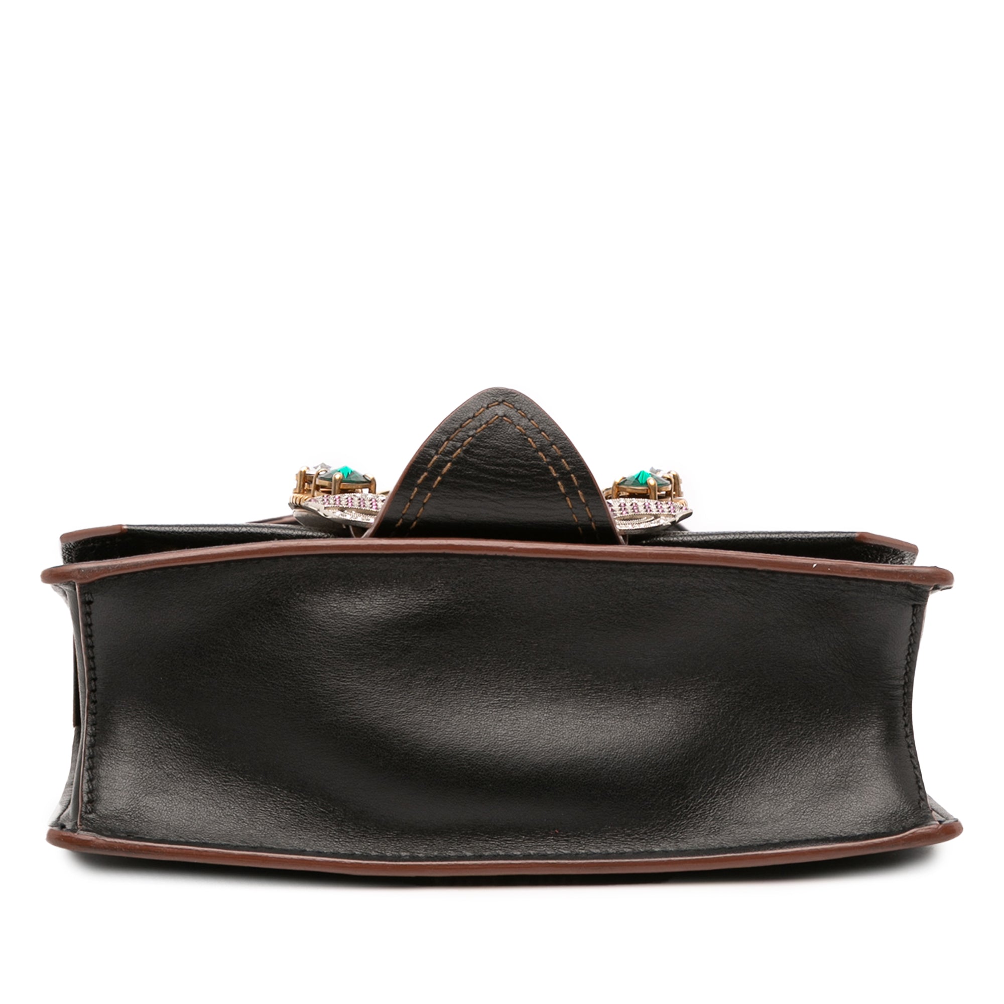 This crossobdy features a leather body with crystal embellishments, an adjustable flat leather strap, a front flap with magnetic closure, and interior zip and slip pockets. Retail Price: 1005.00