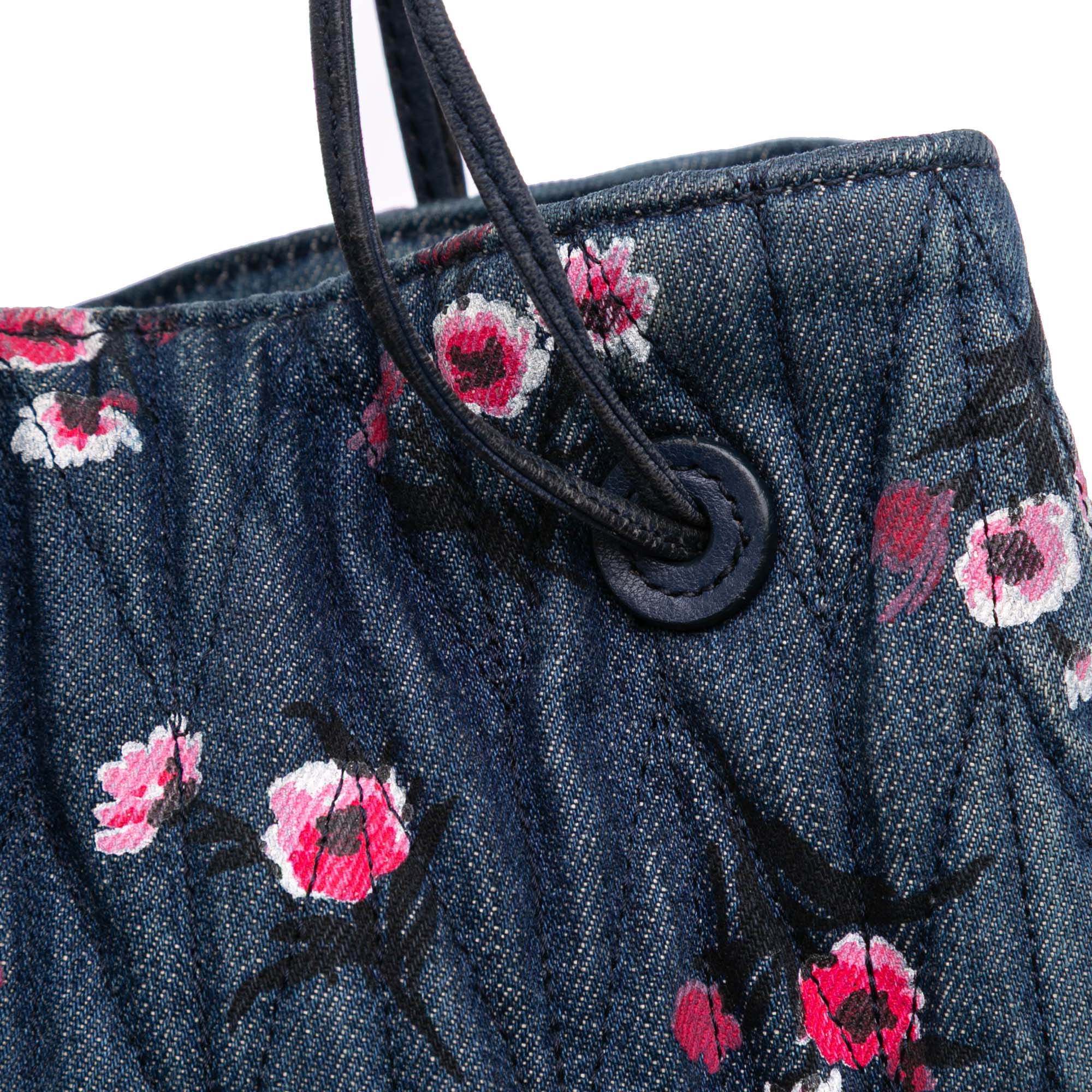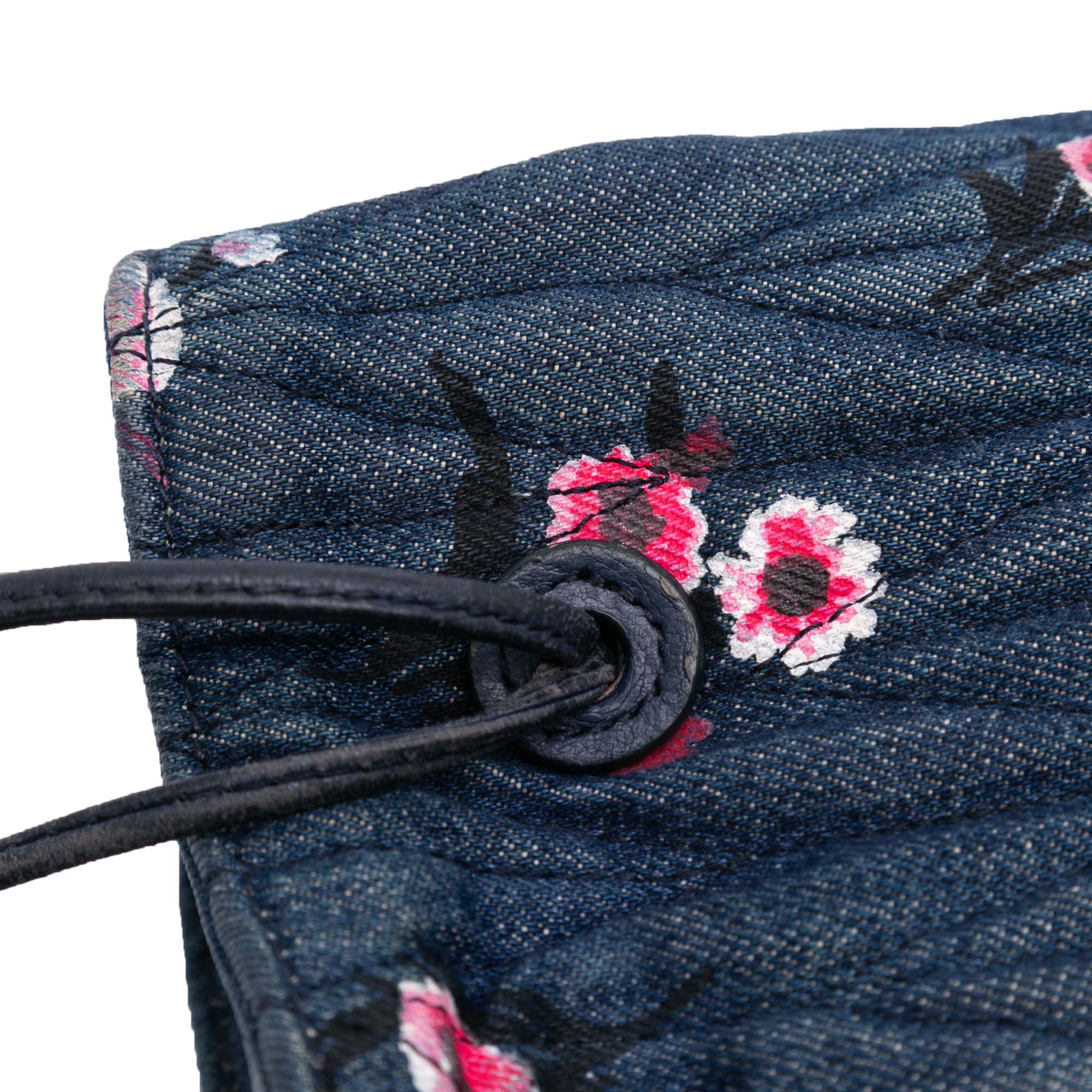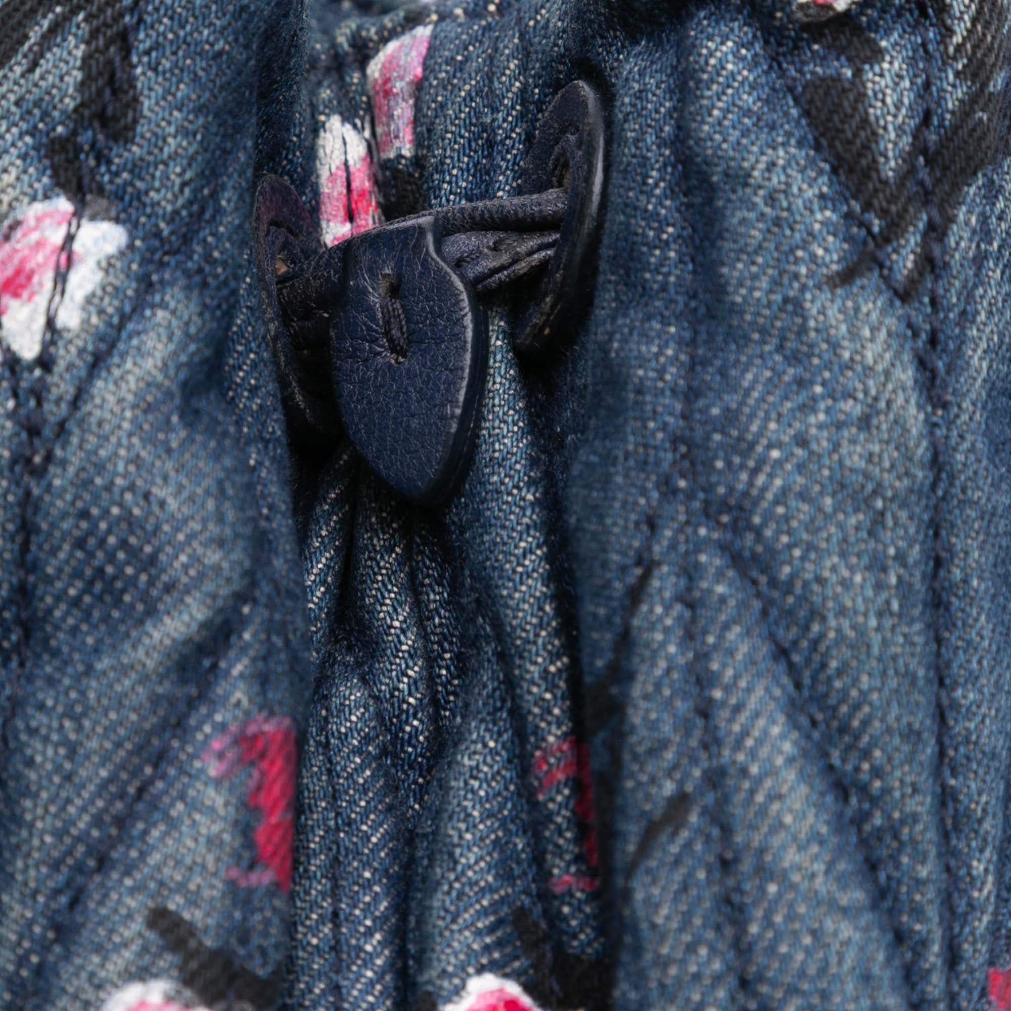 This shoulder bag features a quilted denim body with floral embroidery, flat handles, an open top, and an interior slip pocket. Retail Price: 1295.00