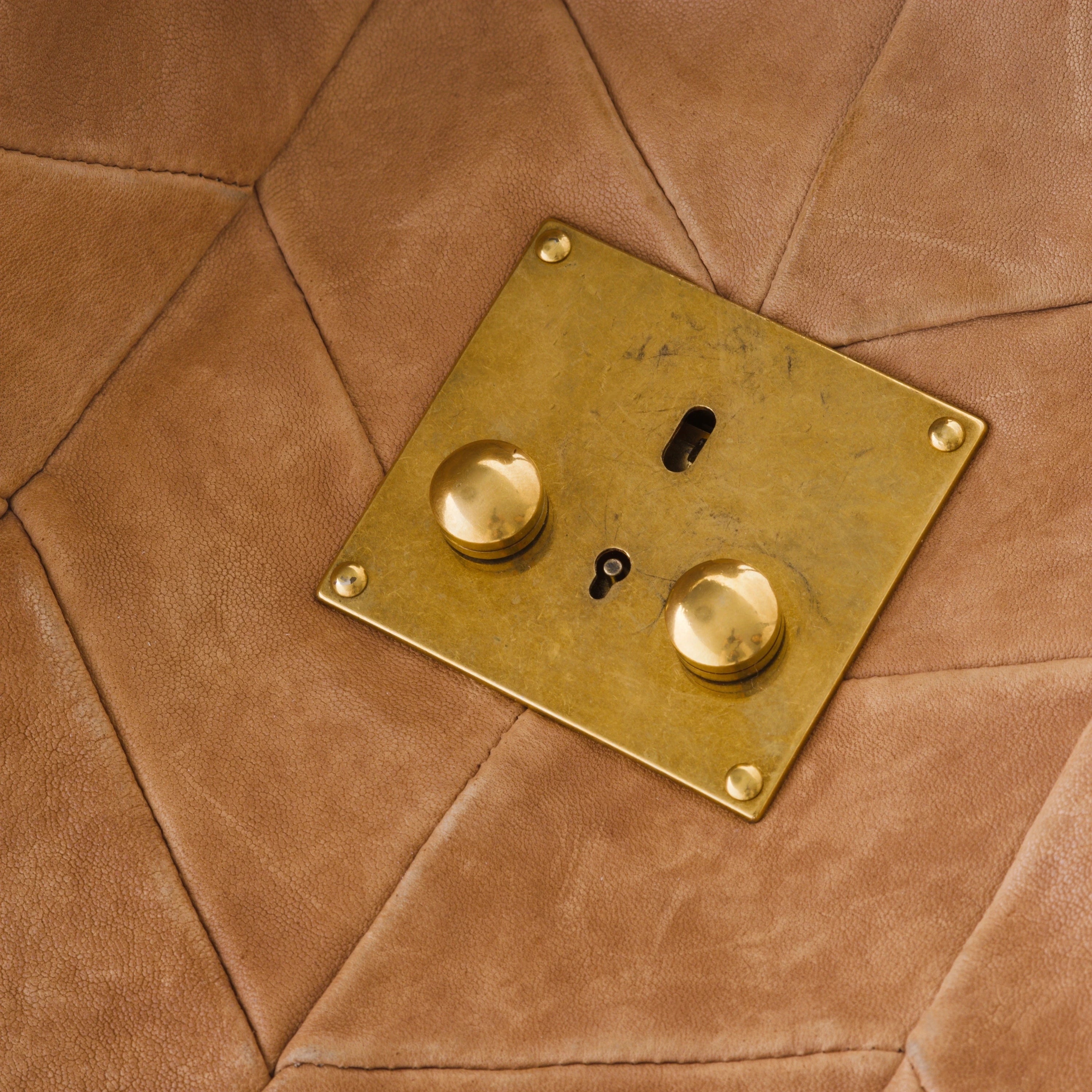 The leather handle with decorative studs adds a distinctive detail, while the gold-tone hardware gives the design a sophisticated and iconic touch.