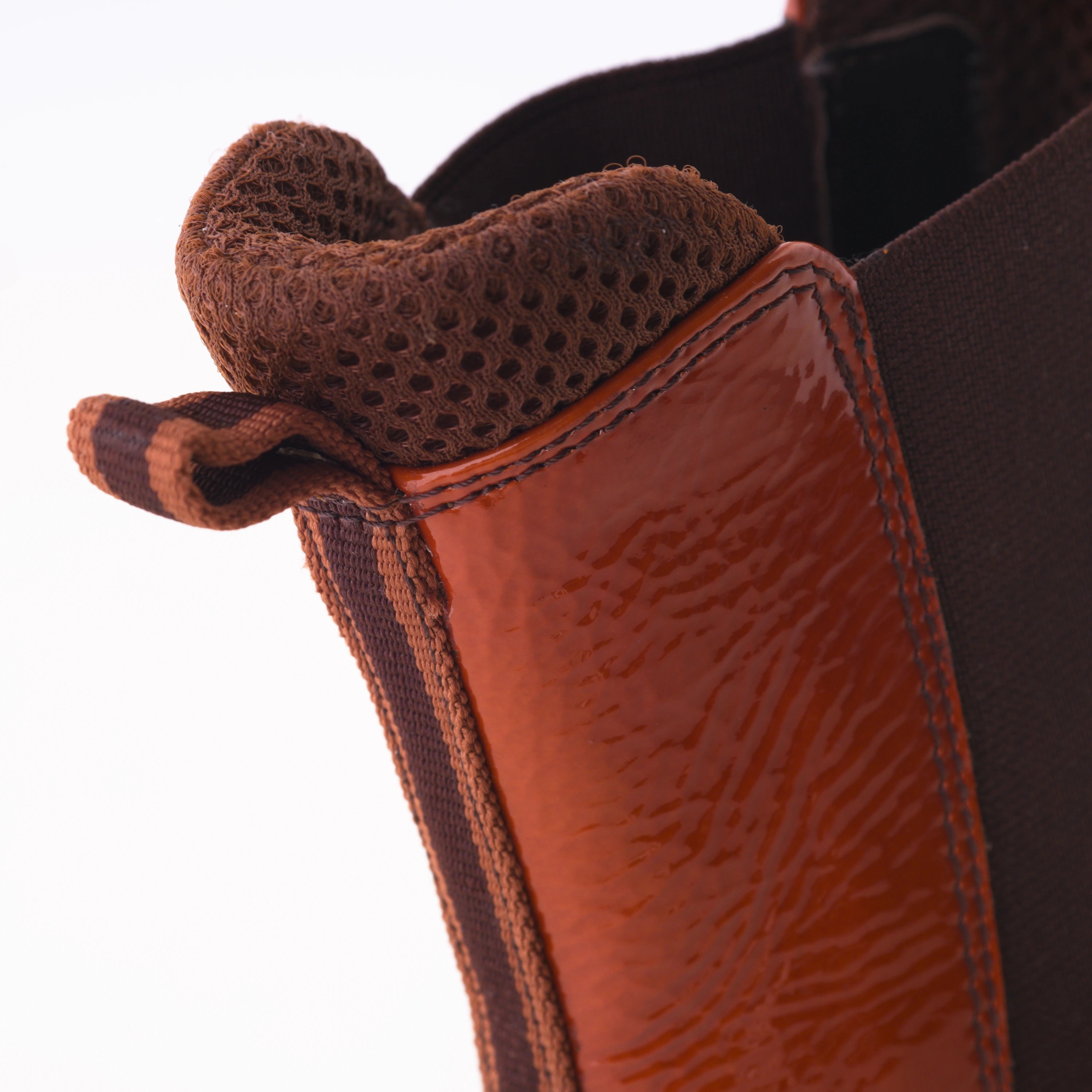Striking Miu Miu patent leather ankle boots (1999) crafted in glossy orange-brick leather, a bold yet sophisticated shade emblematic of the era. Featuring elastic side panels for a snug, comfortable fit, decorative brogue-style perforations, and a sculptural black rubber sole that adds a modern, architectural edge. A distinctive vintage silhouette that captures Miu Miu’s playful yet refined aesthetic.
