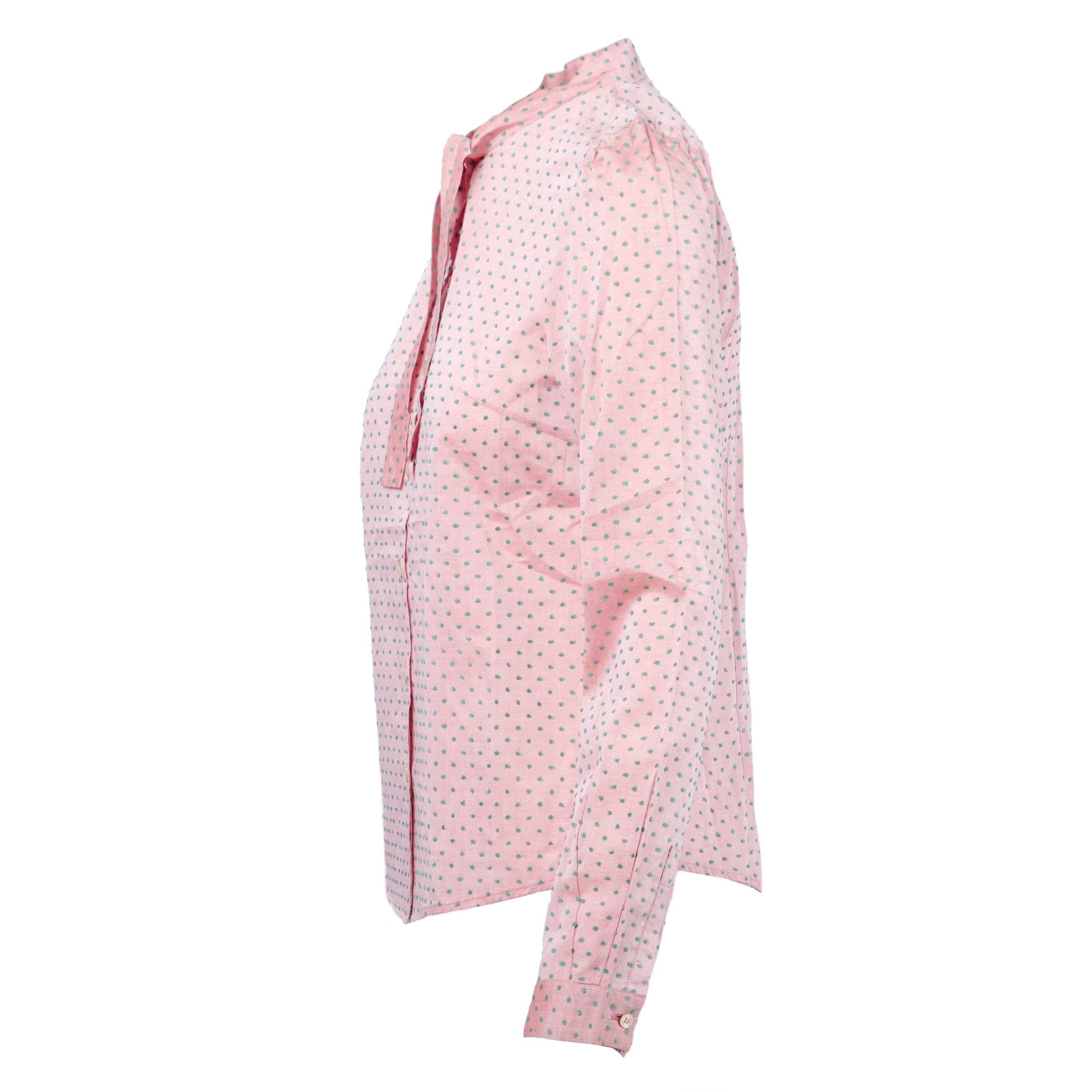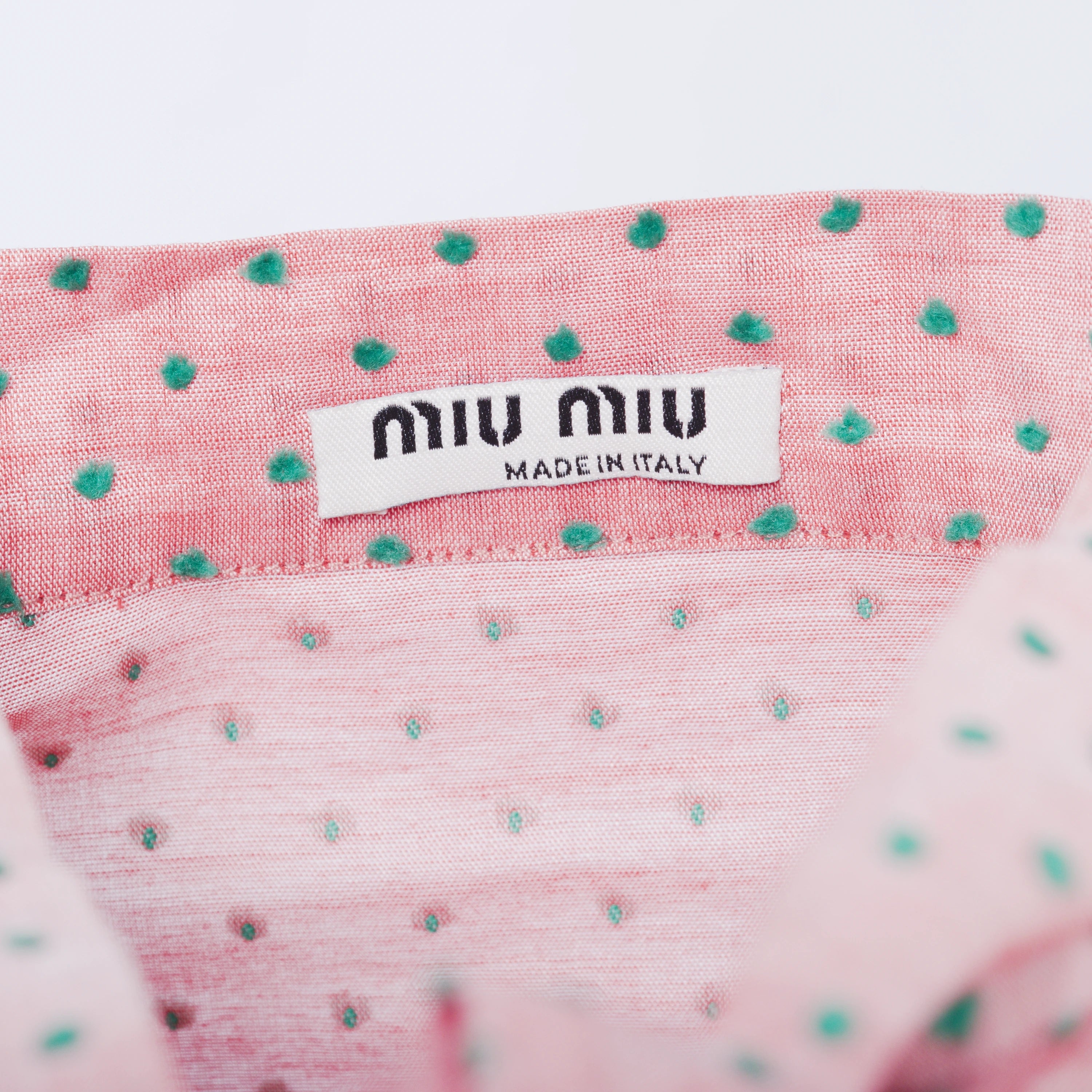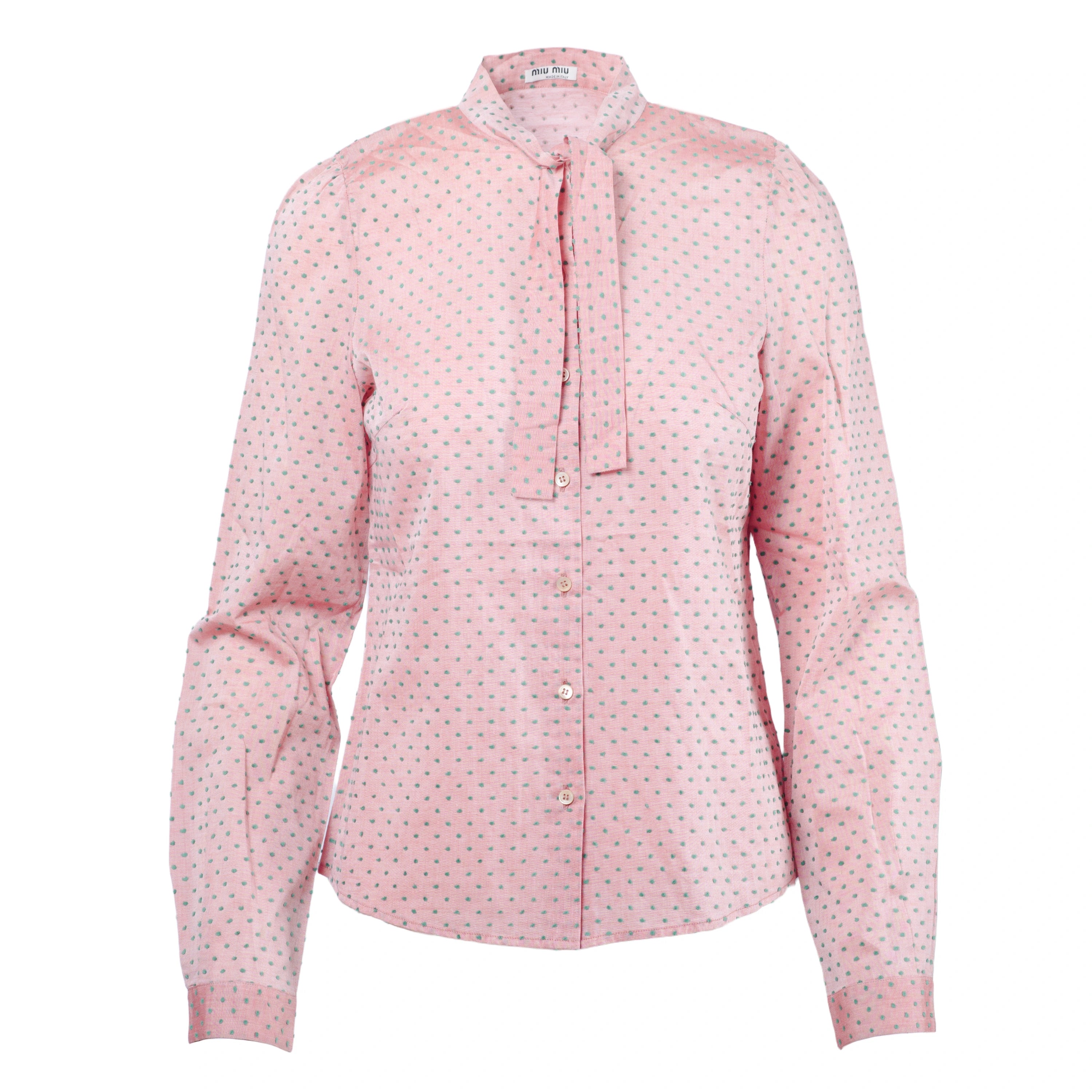 This Miu Miu light pink blouse features a delicate green polka dot pattern and a refined neck tie detail, adding a touch of femininity and style to any look. Made with high-quality materials, it offers a comfortable and lightweight fit.