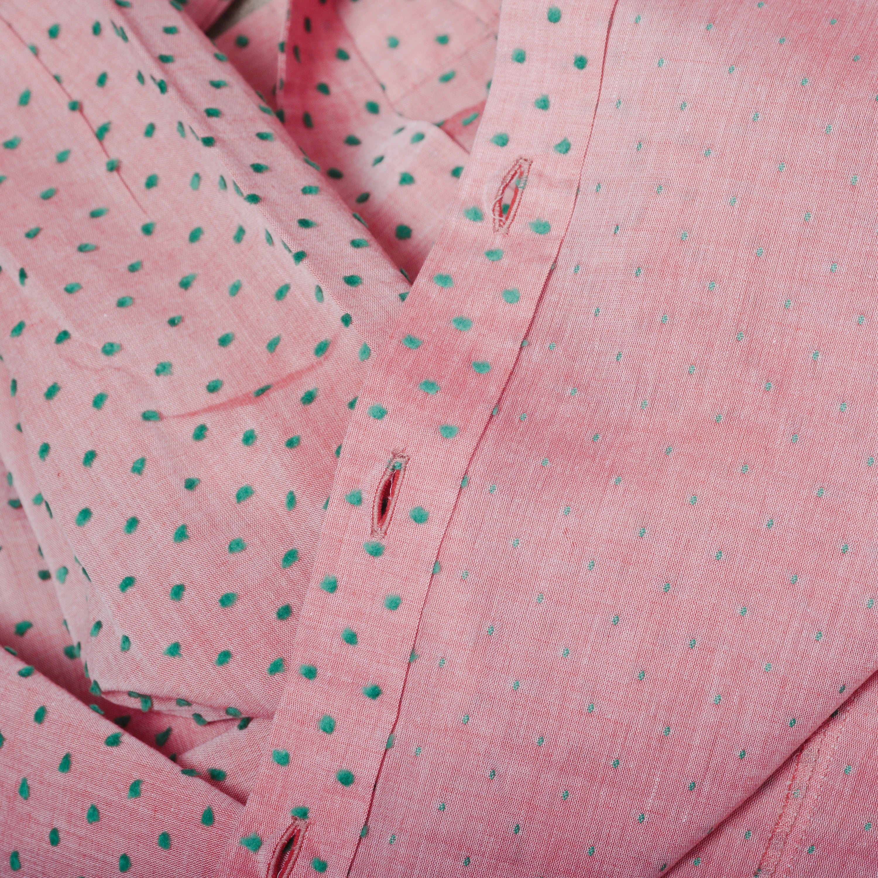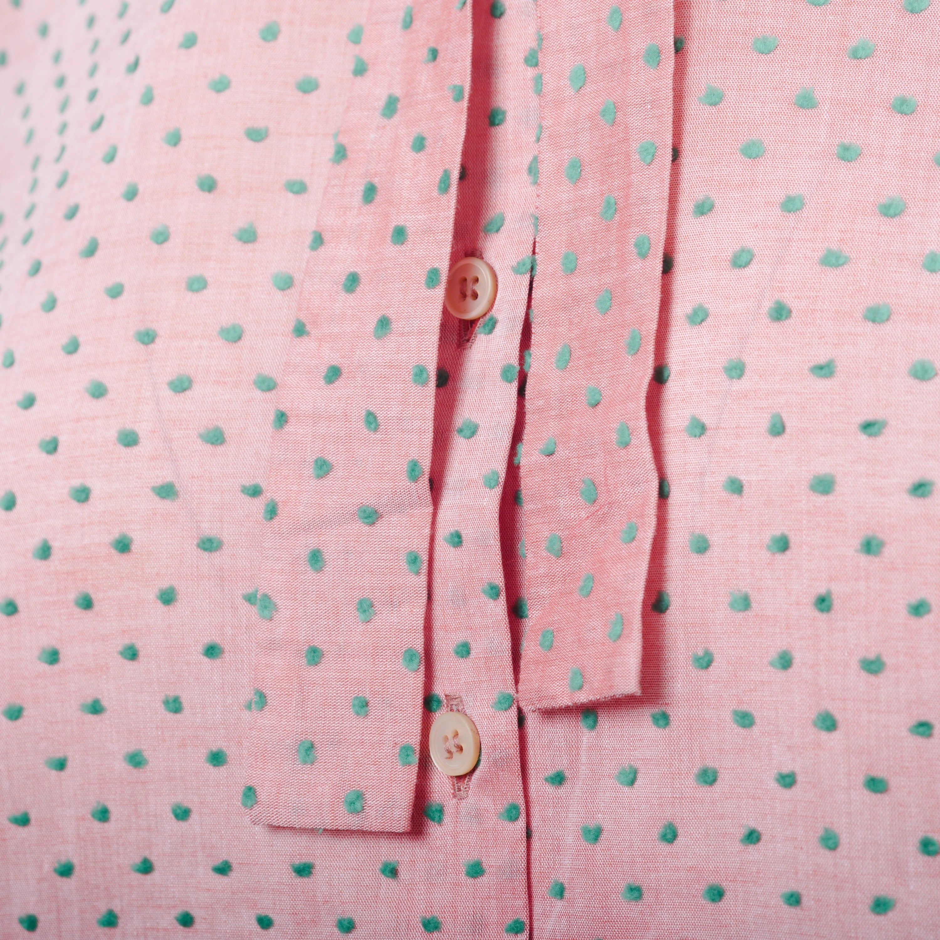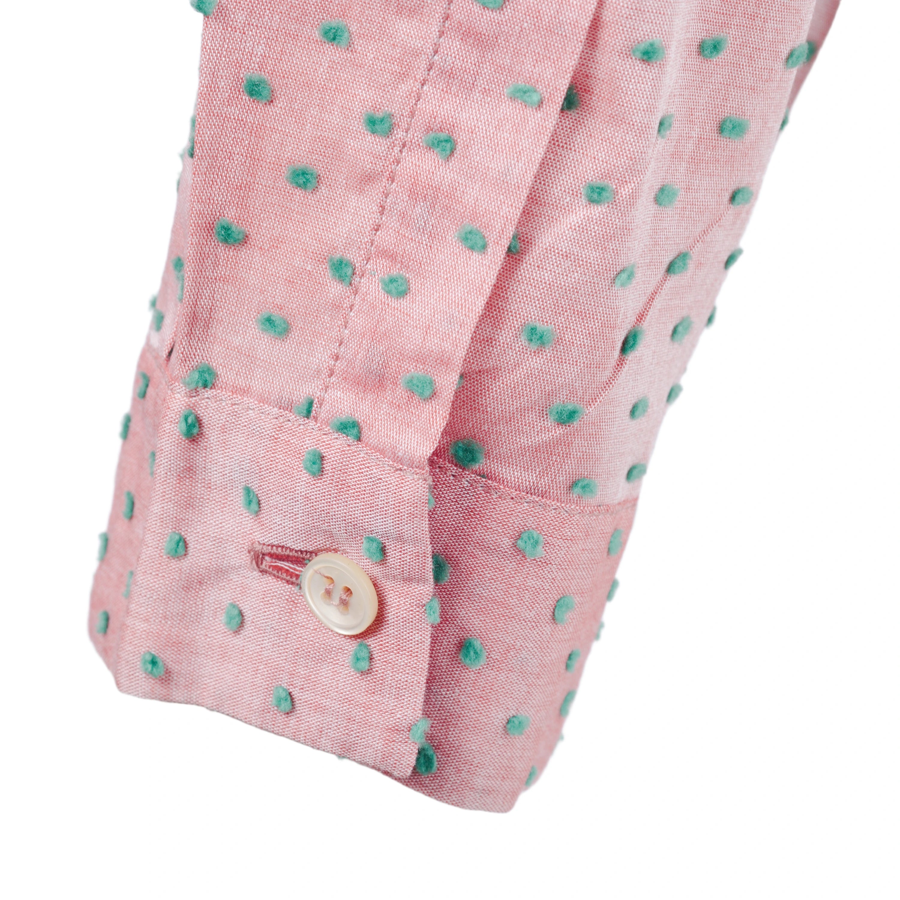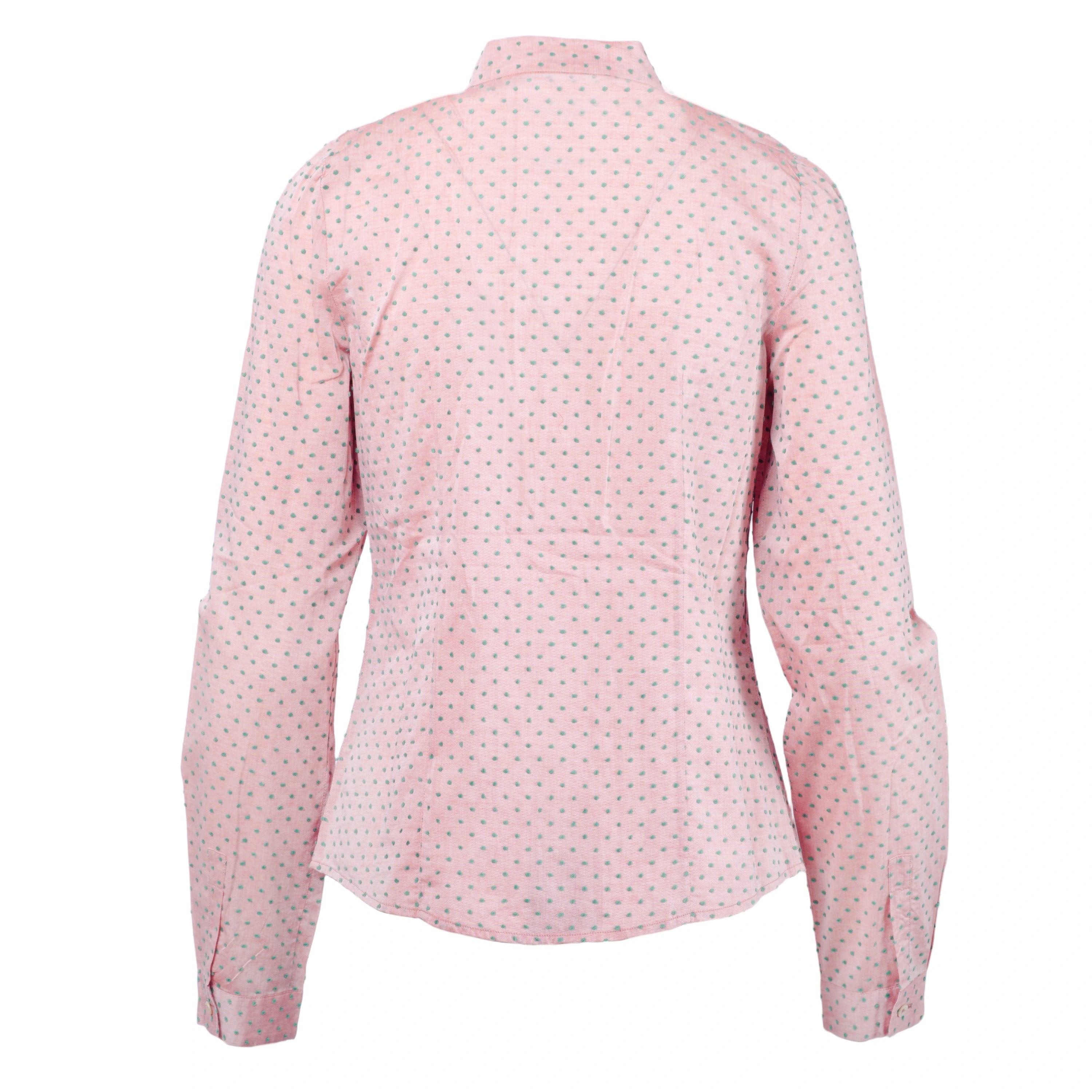 This Miu Miu light pink blouse features a delicate green polka dot pattern and a refined neck tie detail, adding a touch of femininity and style to any look. Made with high-quality materials, it offers a comfortable and lightweight fit.