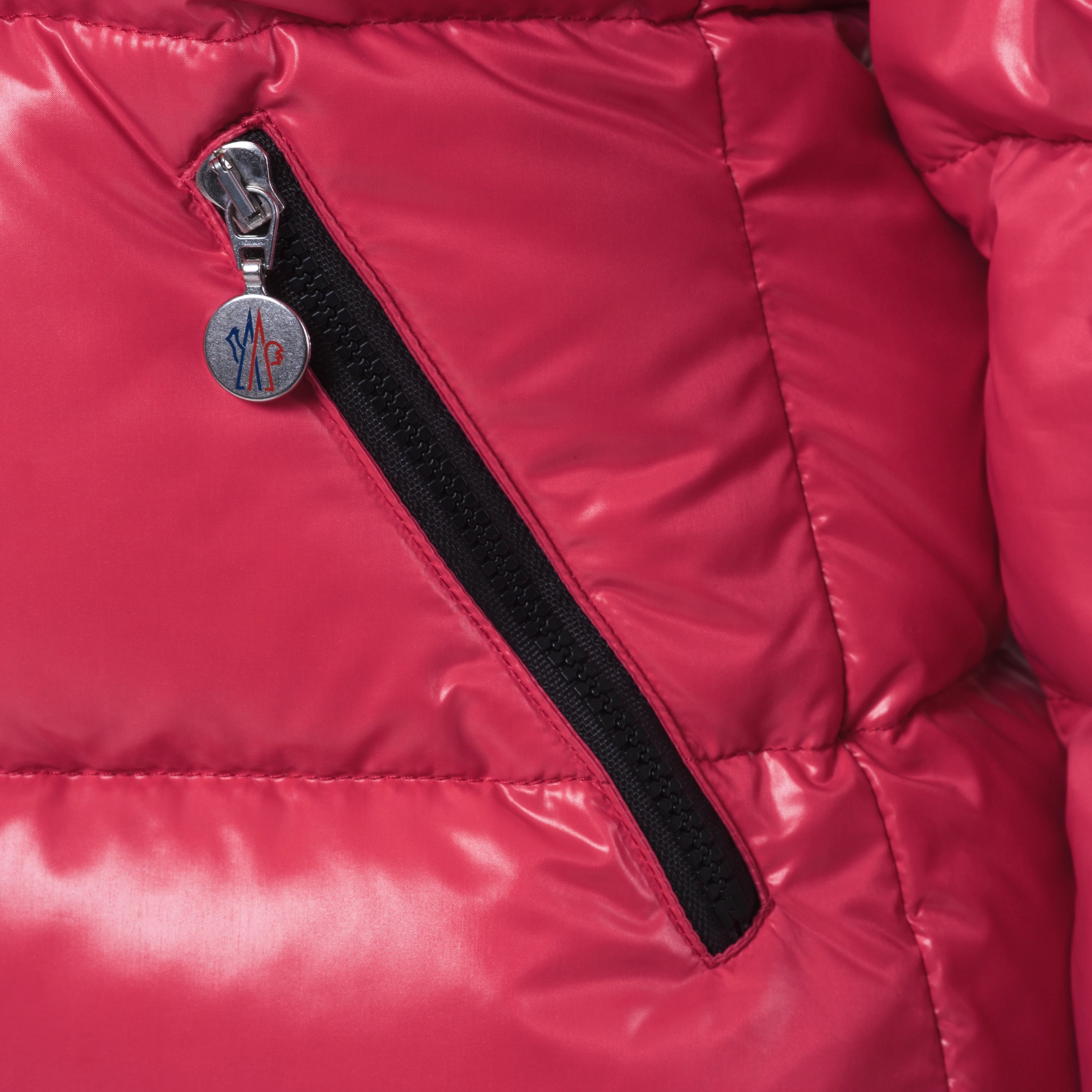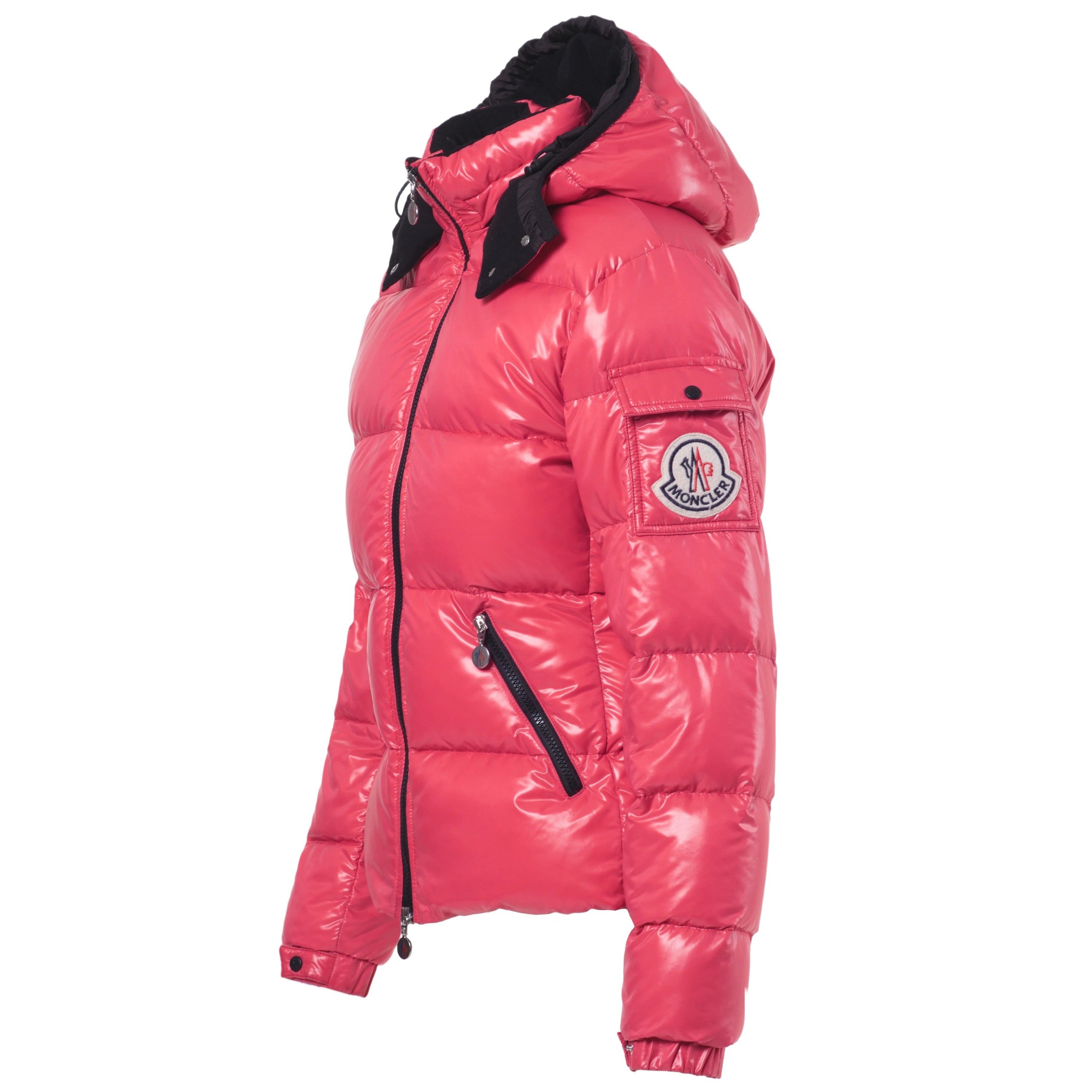 This Moncler women’s glossy down jacket is crafted in a shiny pink fabric and features a padded construction. The front zip closure and hood complete the design, offering practicality and comfort for everyday wear.