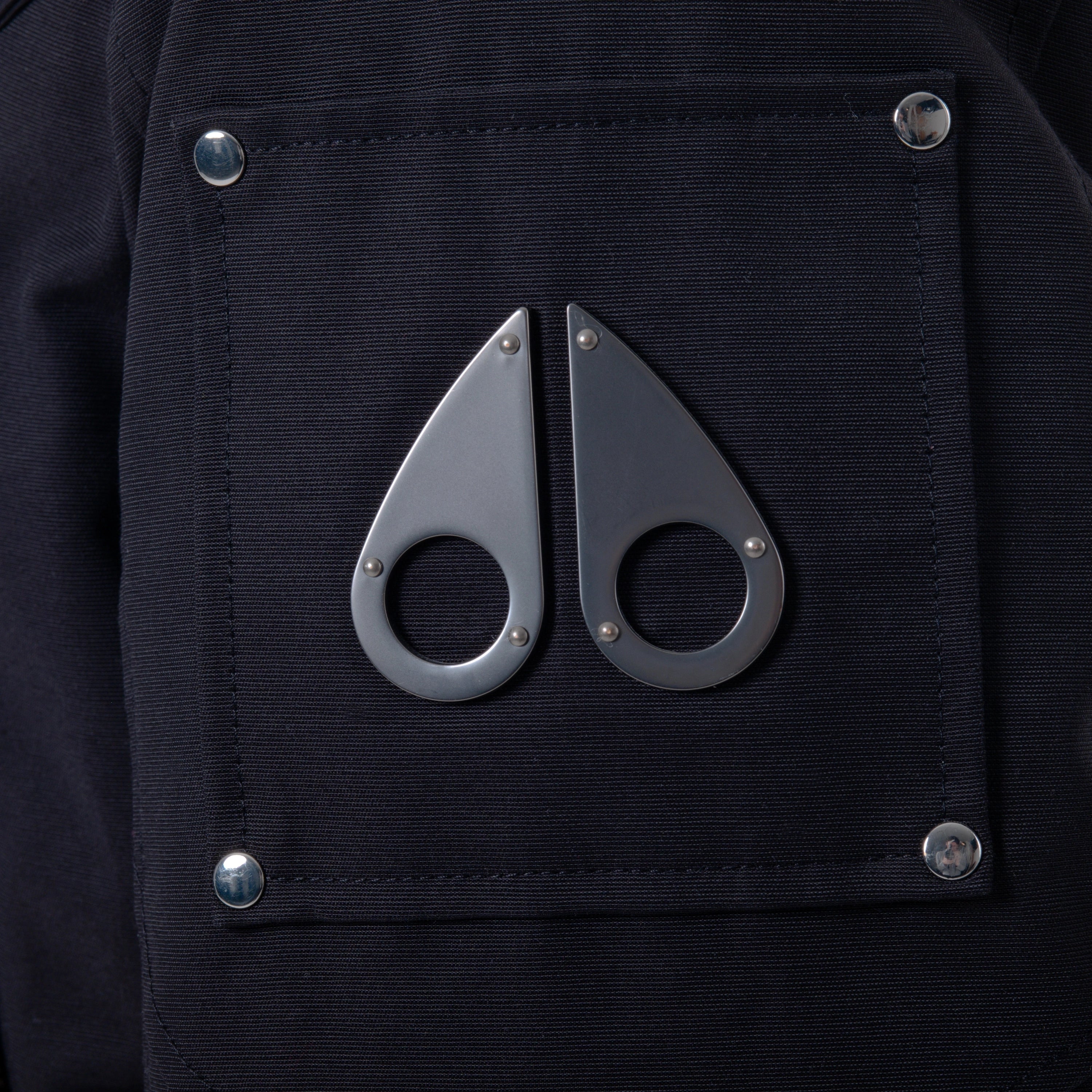 A classic black down parka by Moose Knuckles, designed for warmth and durability. The shell is made from a cotton-nylon blend, with a full nylon lining and an 80/20 down and waterfowl feather fill for insulation. It features a double-zip front closure, multiple pockets, and the brand’s signature metal logo on the sleeve. The hood is adjustable and includes a metal ring detail.