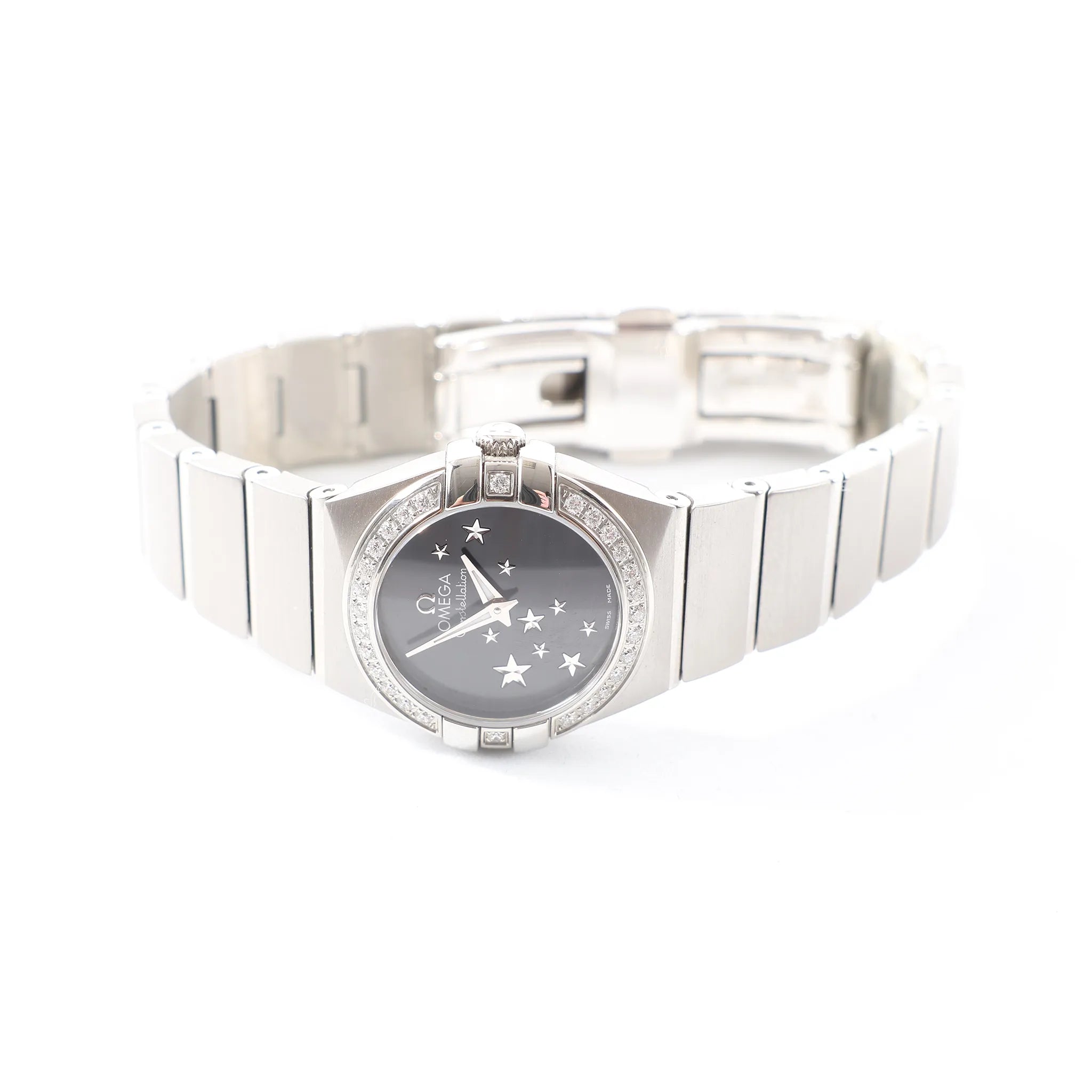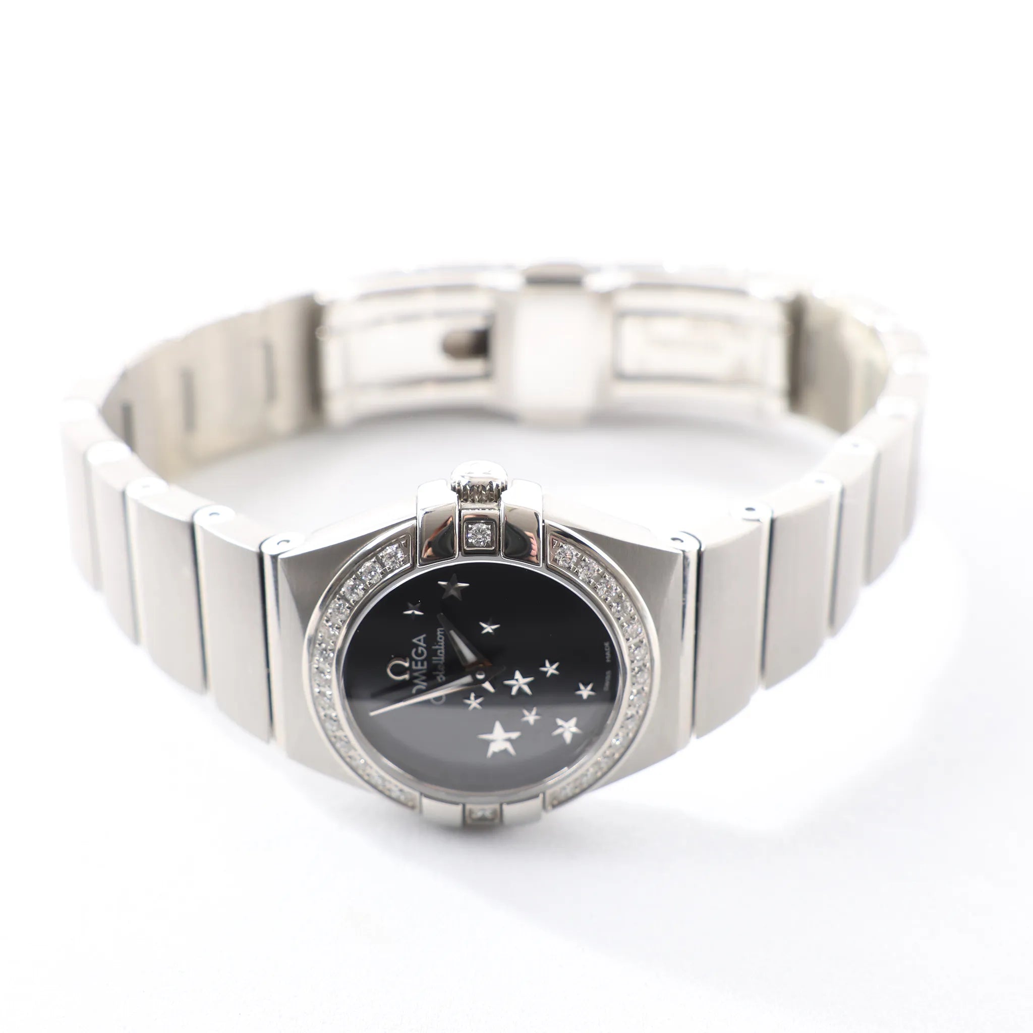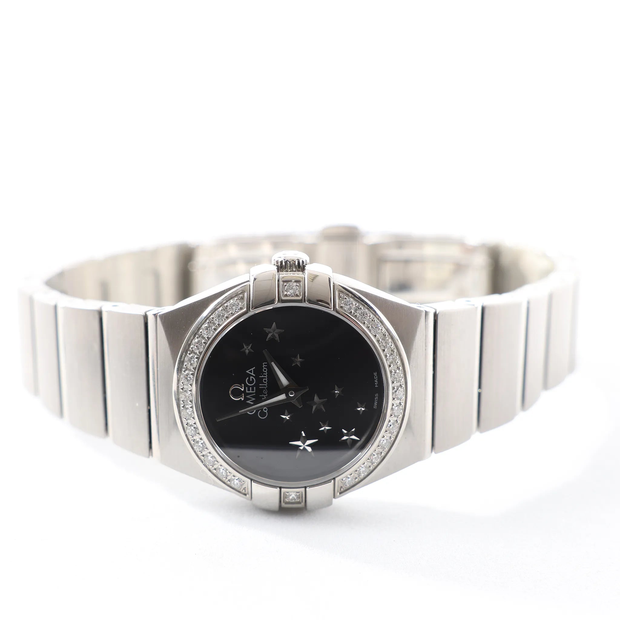 Omega Constellation 123.15.24.60.01.001 stainless steel quartz watch—sleek black dial with star motif, diamond-set bezel, and iconic Constellation case for refined everyday sparkle.