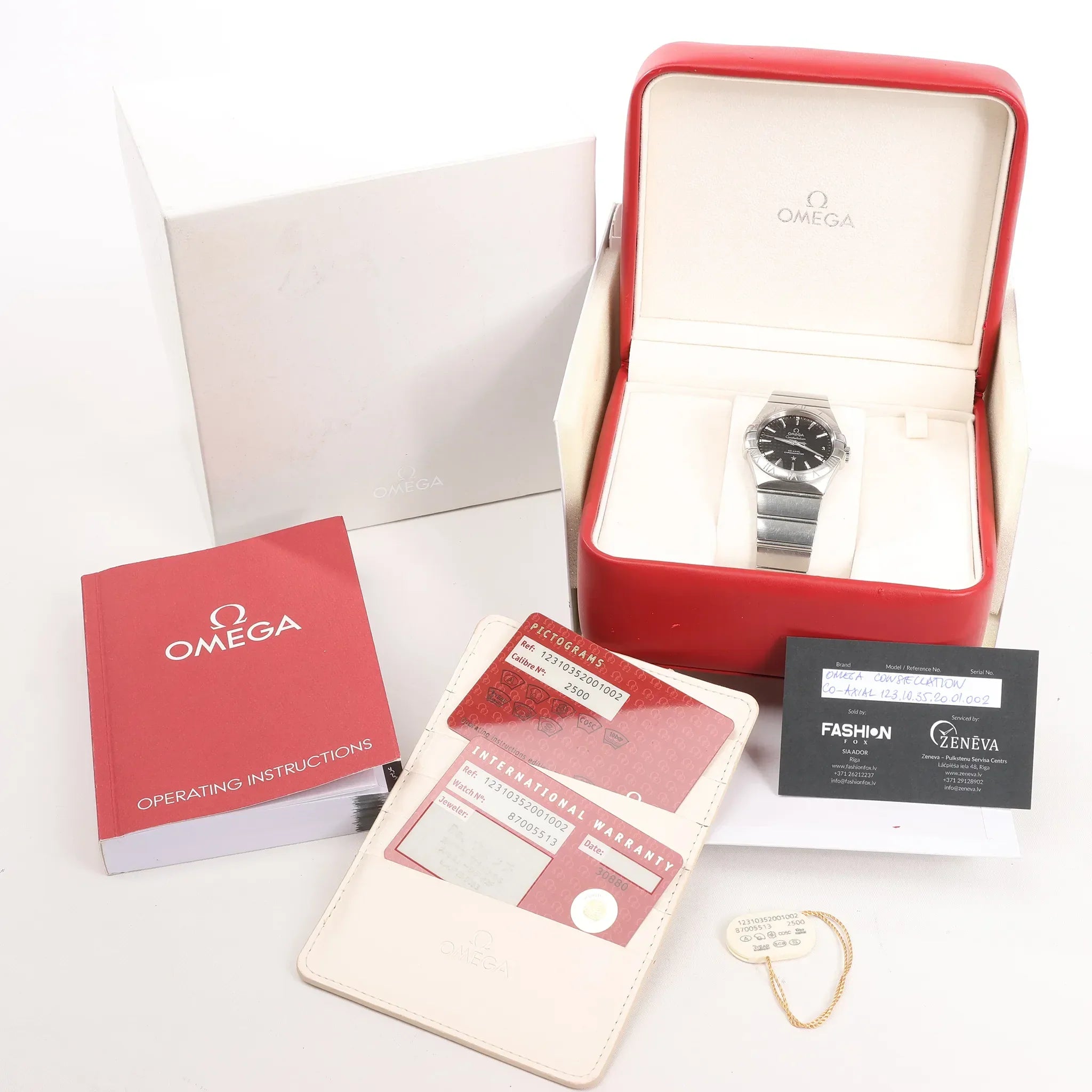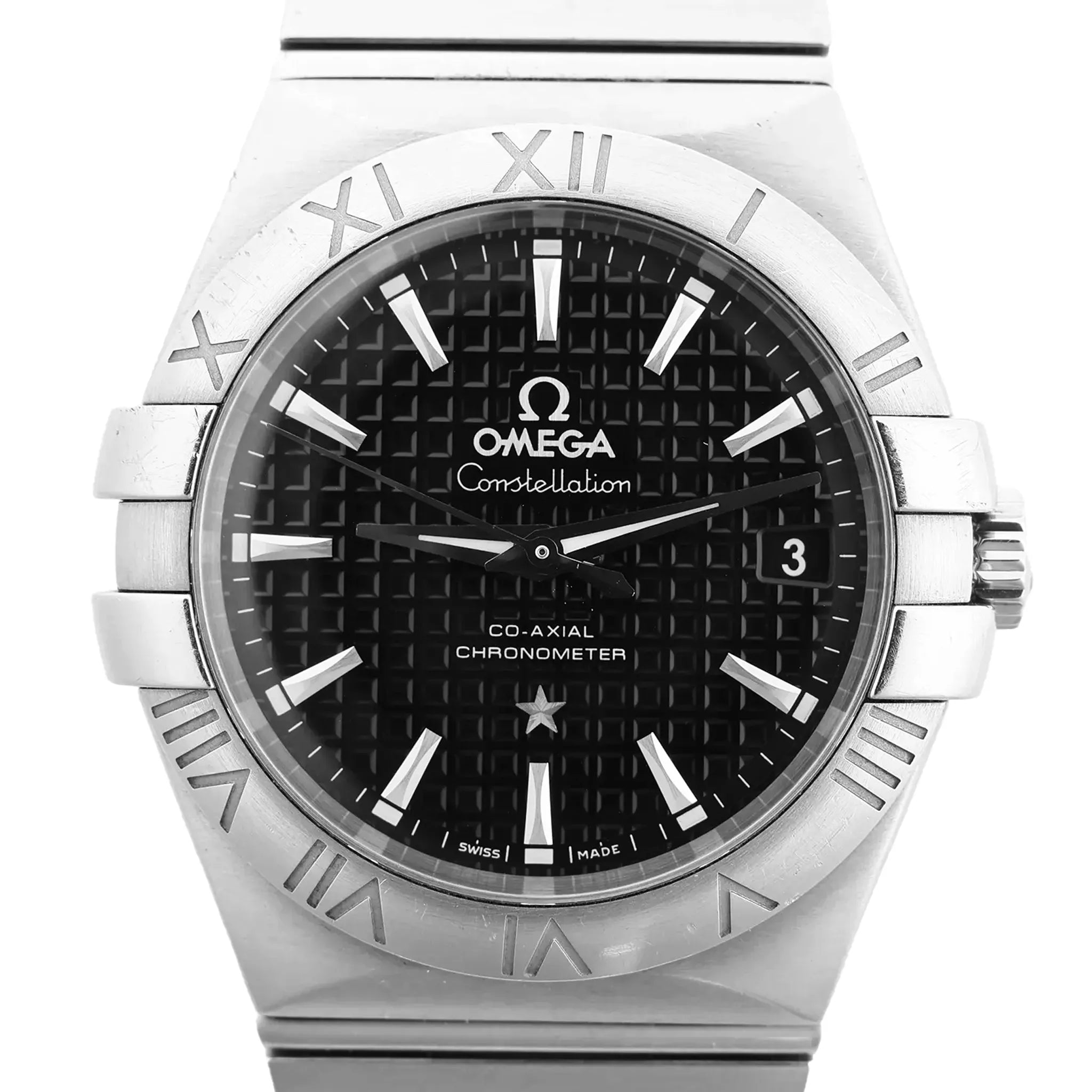 Brand: OmegaModel: ConstellationReference: 123.10.35.20.01.002 Serial No.: 87005513Condition: ExcellentCondition Details: Light signs of use, including subtle surface marks barely visible to the eye. Please see photos for the exact condition. A preventive service may be required.Dial Colour: BlackCase Material: SteelStrap Colour: SilverStrap material: SteelMovement: AutomaticFace Diameter: 34 mmApprox. max circumference: 19.5 cmComes With: Box, certificates, Service card, booklet