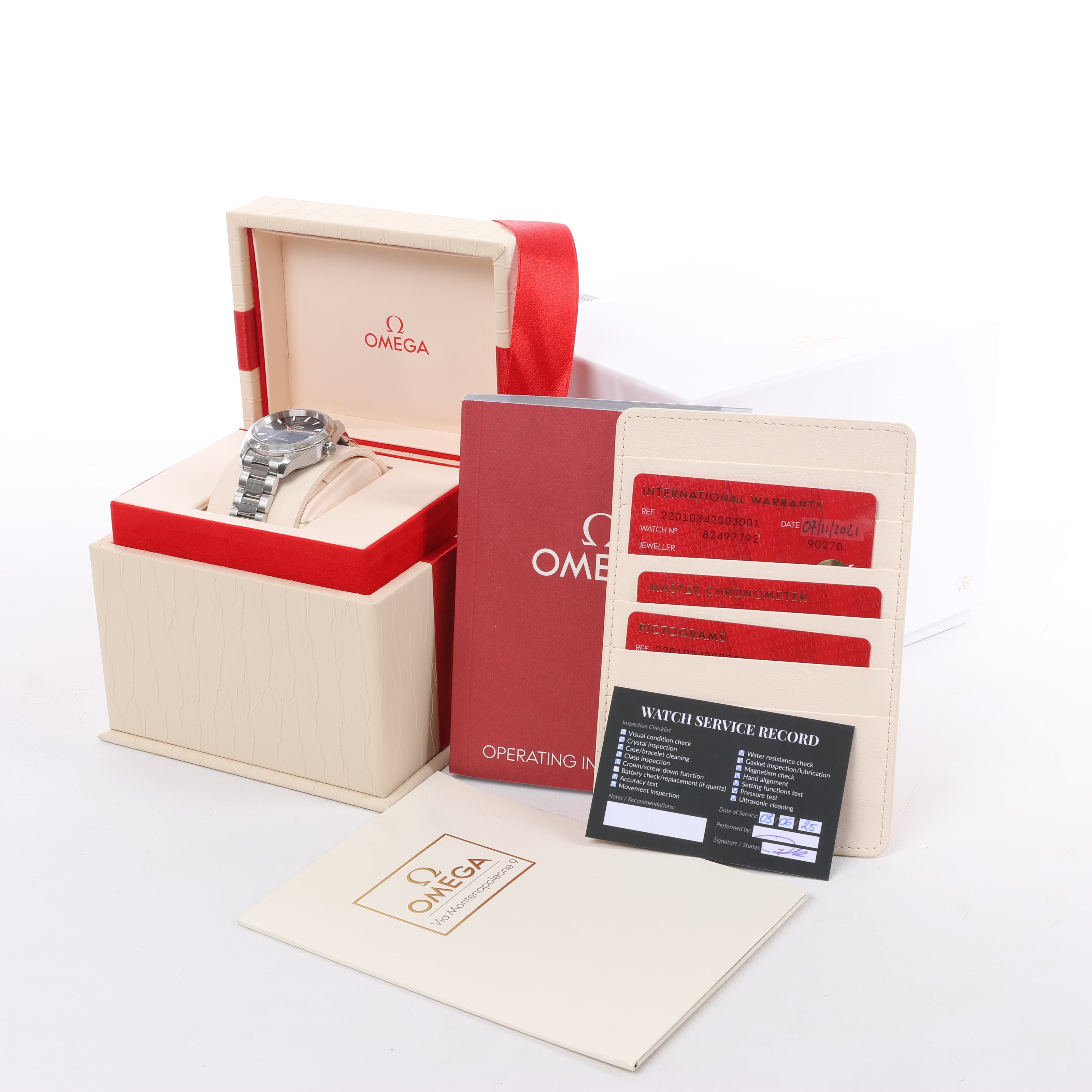 Brand: OmegaModel: Seamaster AquaterraReference: 220.10.34.20.03Condition: ExcellentCondition Details: Visible signs of use, such as surface marks and light abrasions. Overall in good condition - see photos for exact appearance.Dial Colour: Navy BlueCase Material: Stainless steelStarp Colour: SilverStrap material: Stainless steelMovement: AutomaticCase diameter: 34 mm Approx. max circumference: 15.4 cmComes With: Box, Certificates, Book, Receipt, Service card