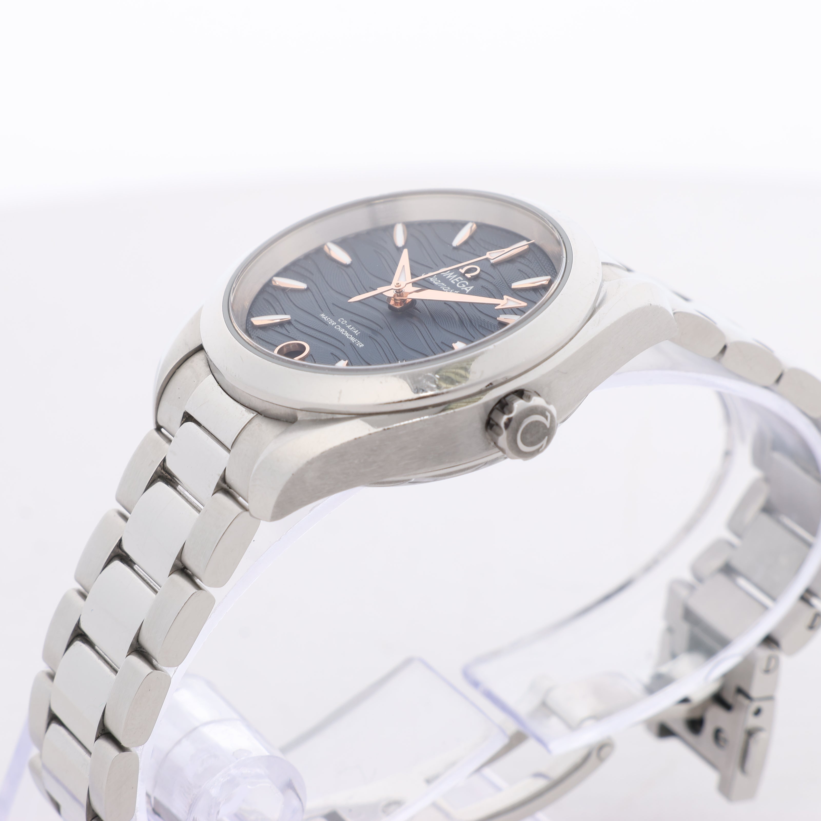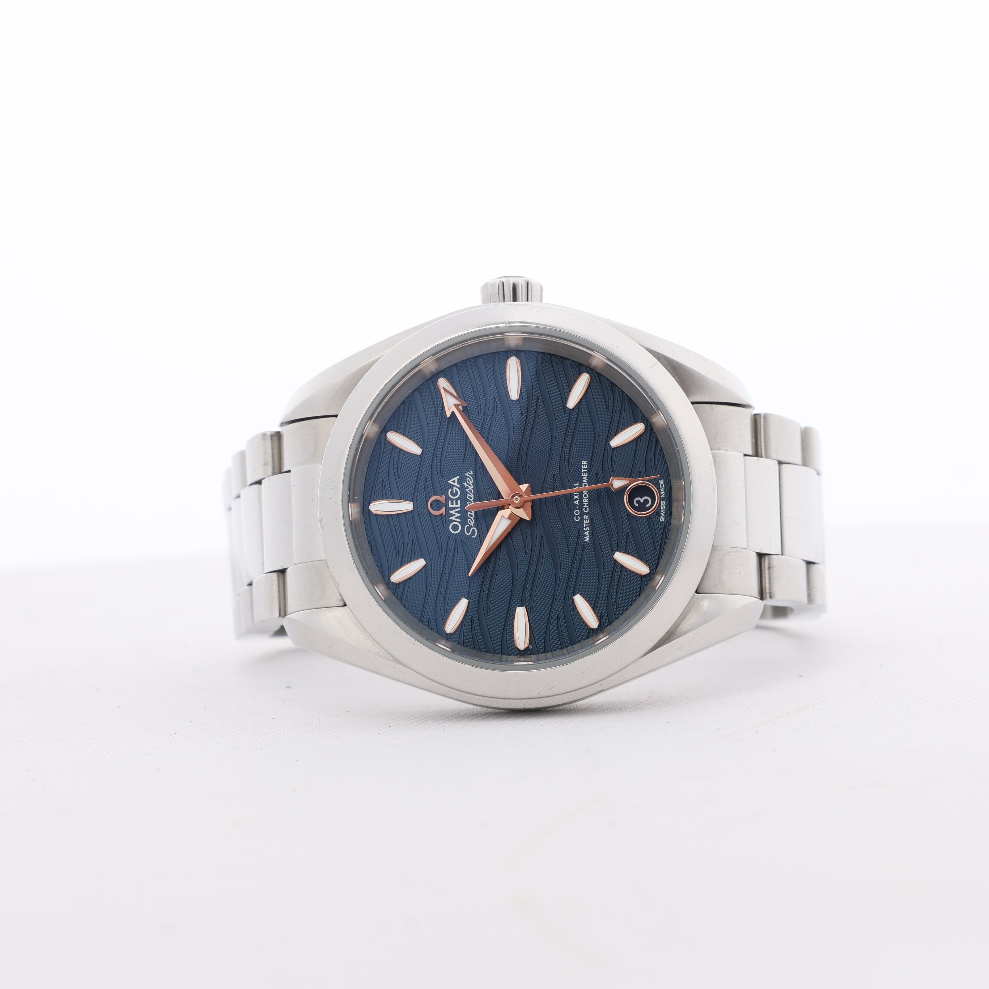 Omega Seamaster Aqua Terra Chronometer 220.10.34.20.03 features a navy blue wave-pattern dial, rose gold accents, and stainless steel bracelet. A masterful blend of elegance and precision for refined everyday wear.