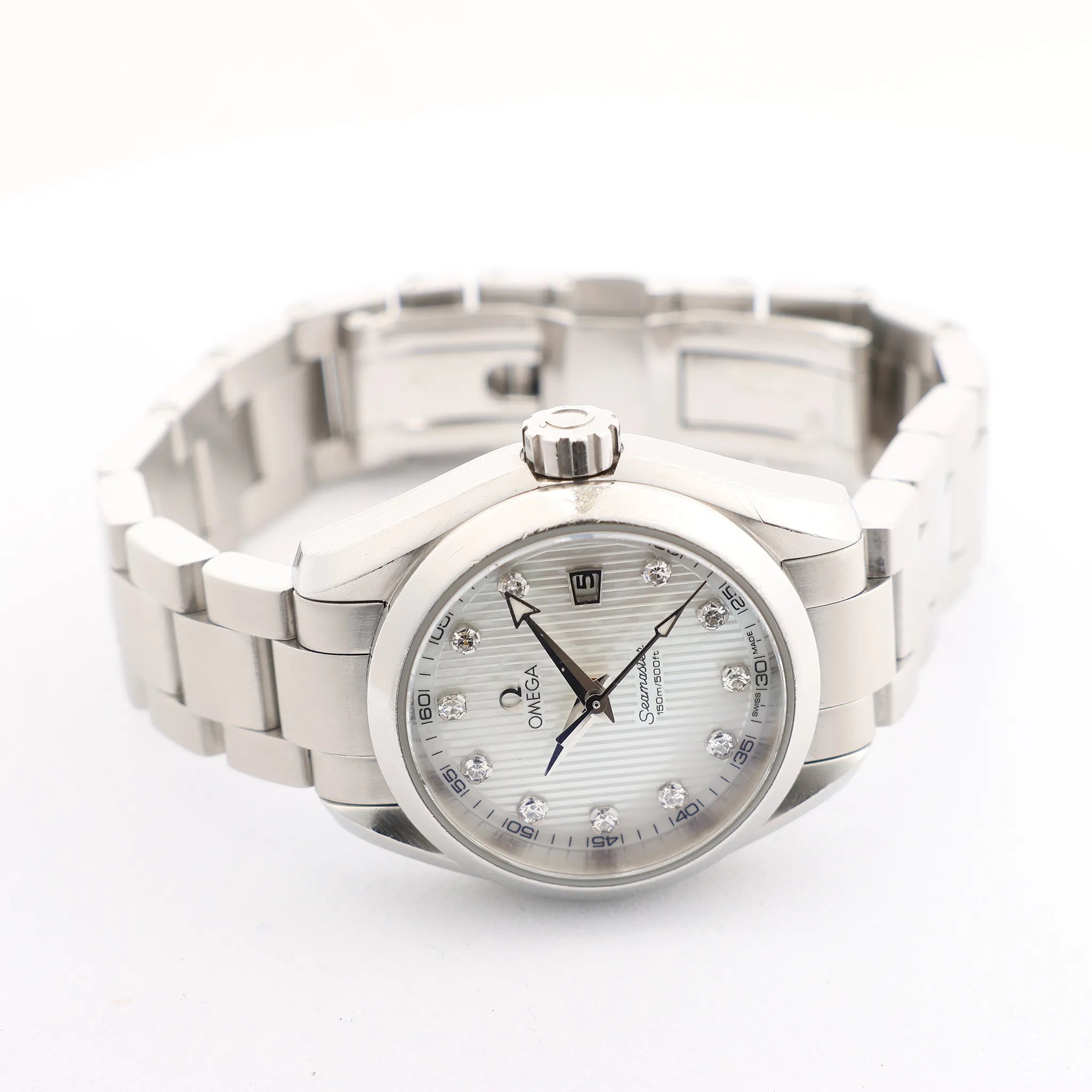 The Omega Seamaster Aqua Terra 231.10.30.60.55.001 dazzles with a mother-of-pearl dial and diamond hour markers. Housed in stainless steel with quartz precision, it's a luxurious and sporty timepiece built for elegance and performance.