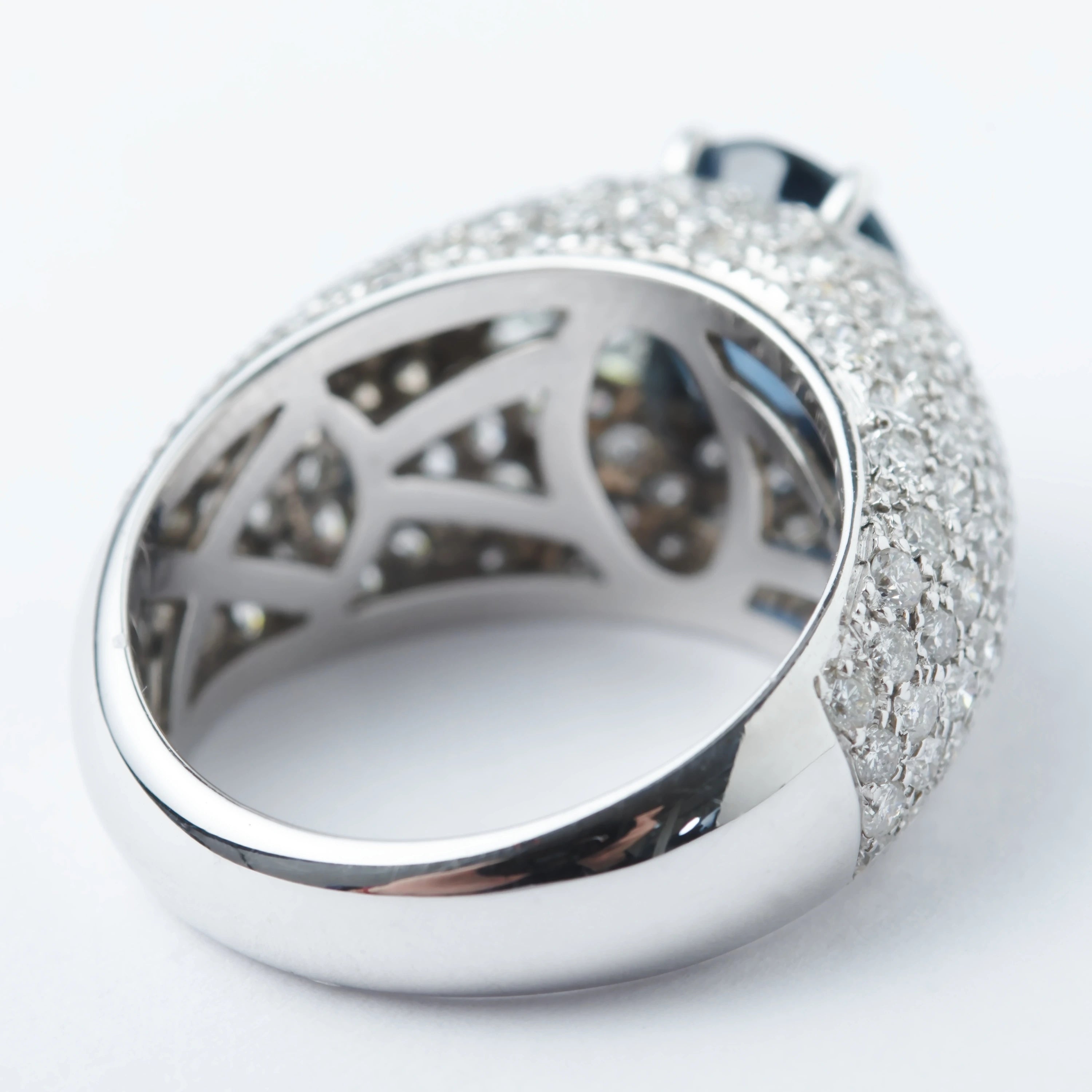A refined and sculptural sapphire and diamond ring from the 1990s, crafted in white gold and set with a striking oval-cut blue sapphire of deep, luminous colour. The sapphire is elegantly framed by two tapered triangular diamonds, creating a strong architectural composition that enhances the presence of the central stone. The band is entirely adorned with a dense pavé of brilliant-cut diamonds, lending the ring exceptional brilliance and a bold, luxurious profile.