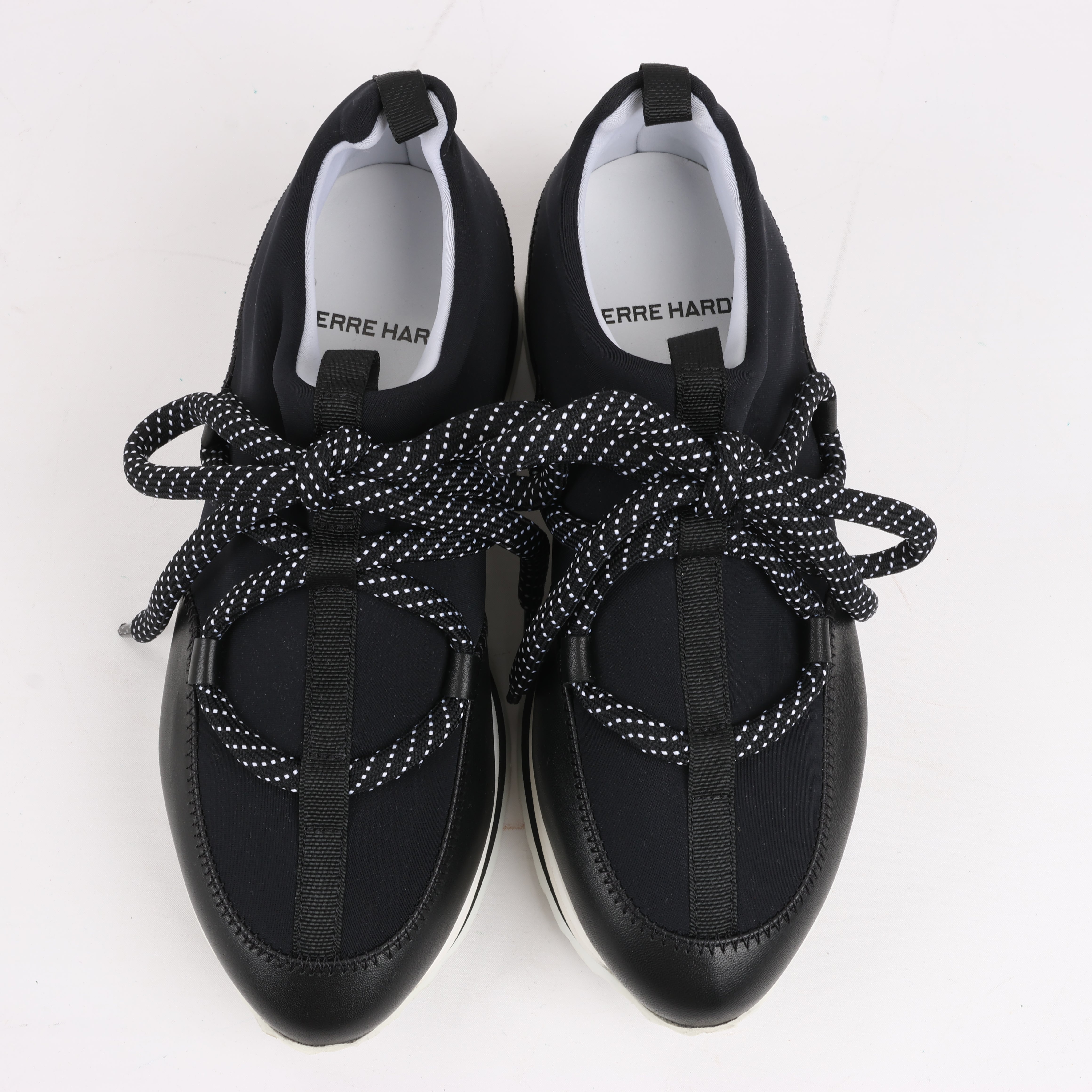 Pierre Hardy leather and fabric sneakers in black and navy, size 37 EU. A bold fusion of style and comfort, featuring oversized laces, a sleek silhouette, and a dynamic sole. Perfect for elevating casual looks with a modern, sporty edge.