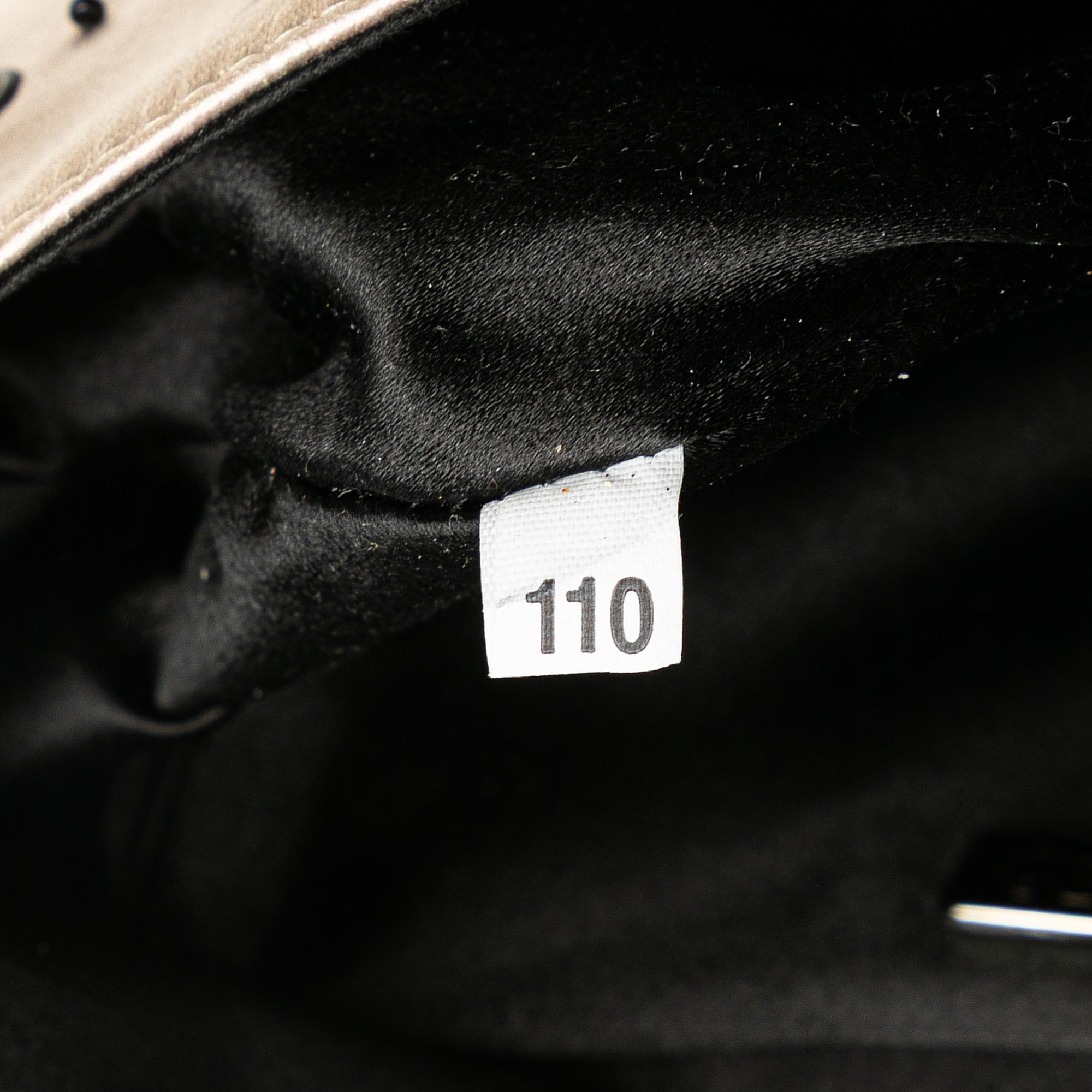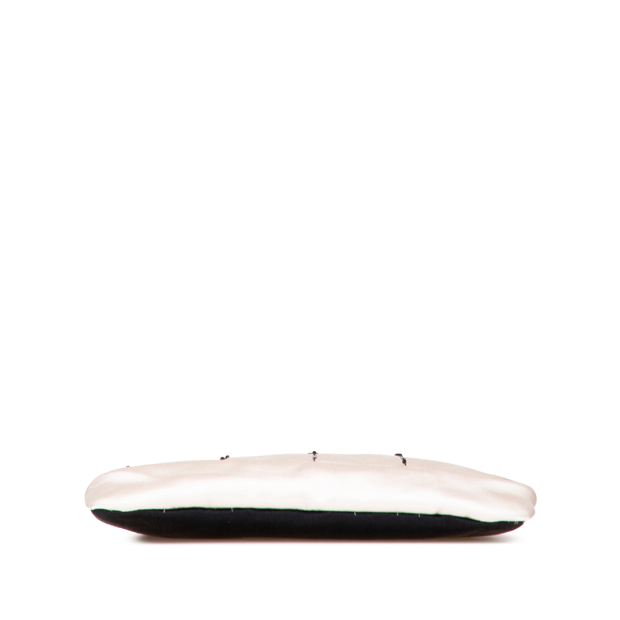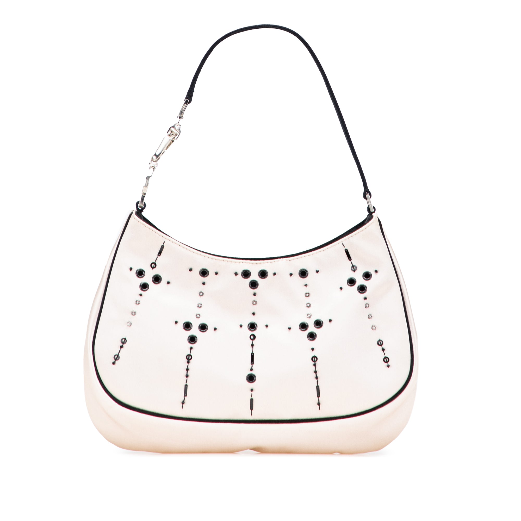 The Cleo shoulder bag features a beaded satin body, a flat leather strap, and a top magnetic snap closure. Retail Price: 1234.00