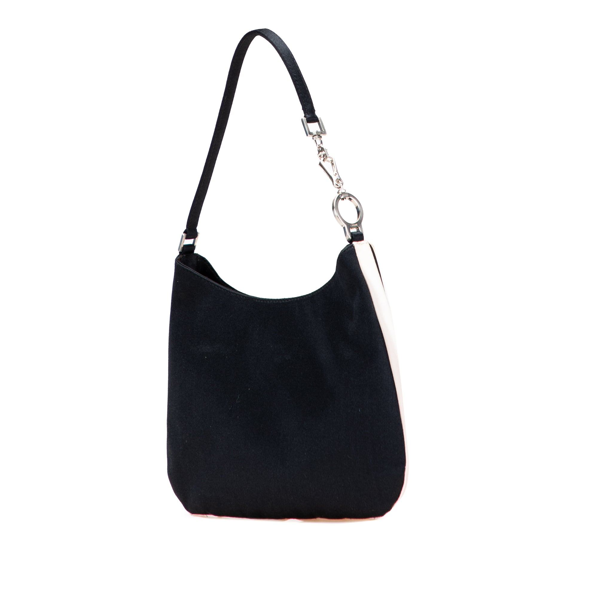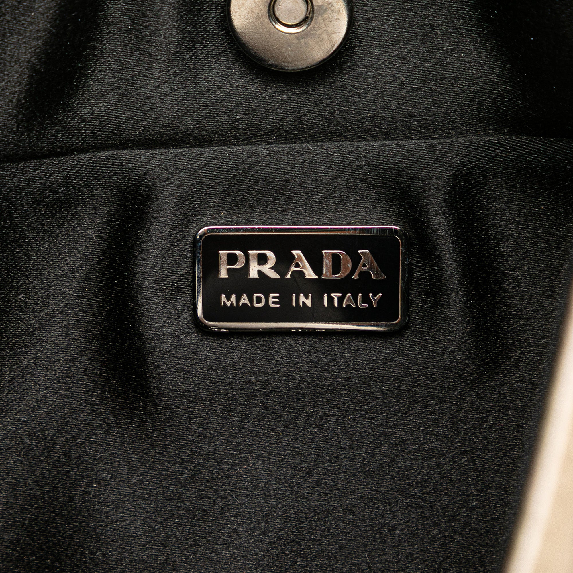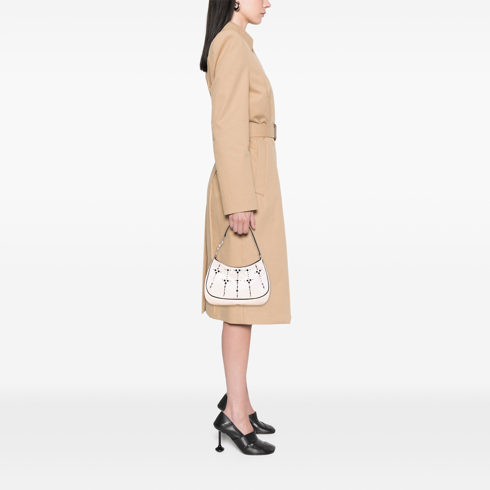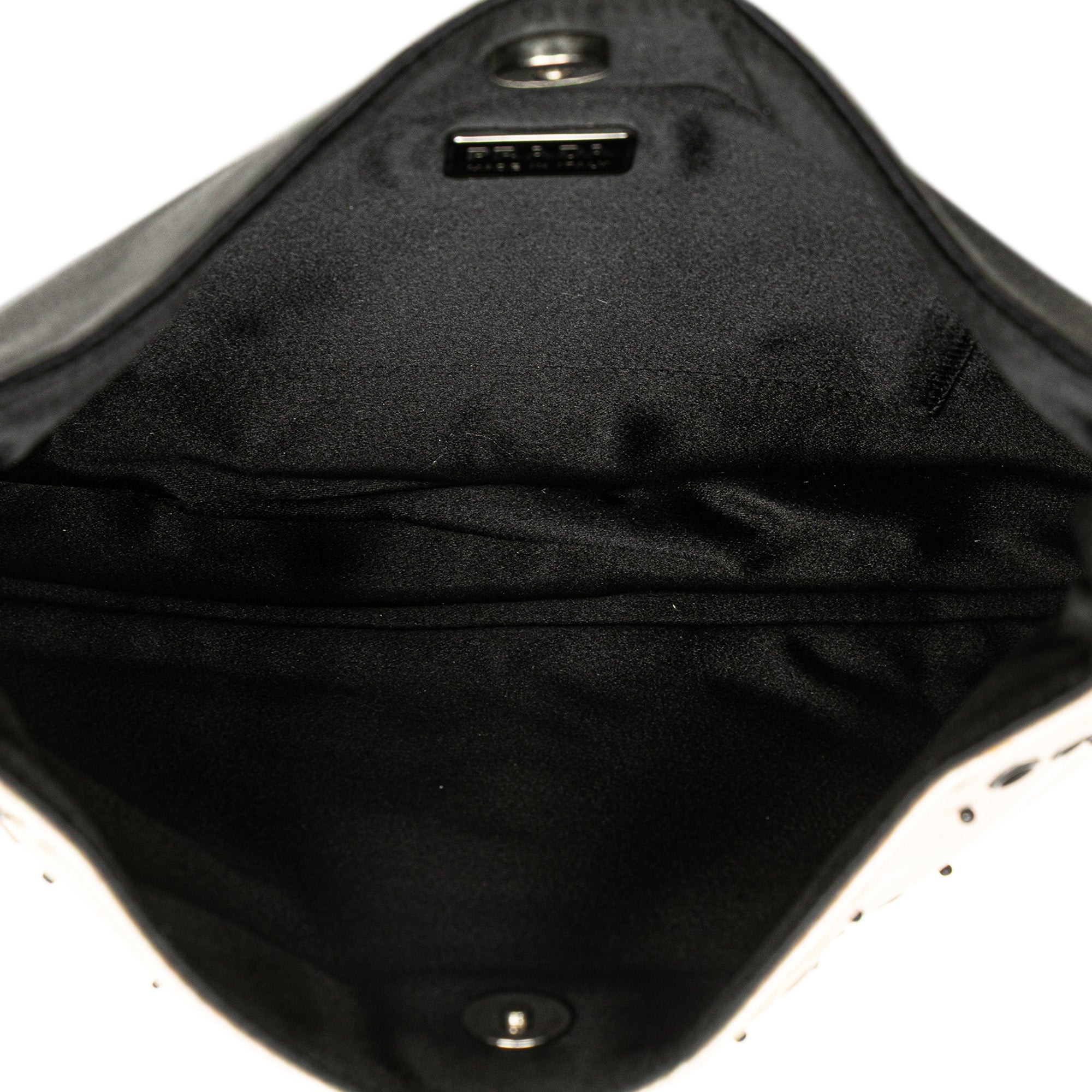 The Cleo shoulder bag features a beaded satin body, a flat leather strap, and a top magnetic snap closure. Retail Price: 1234.00