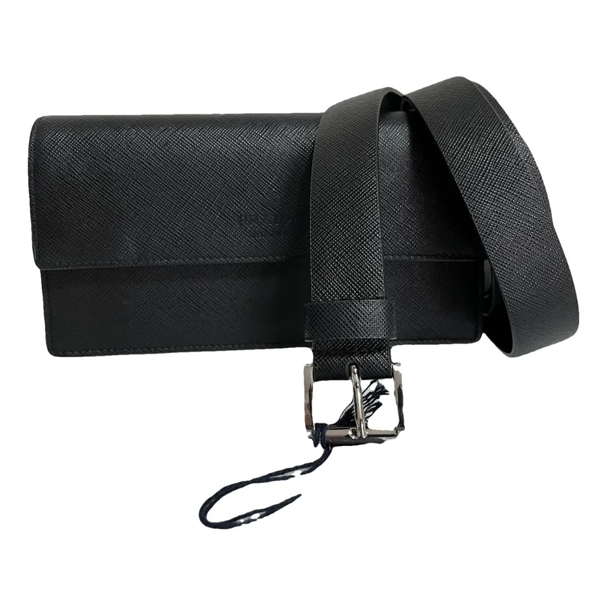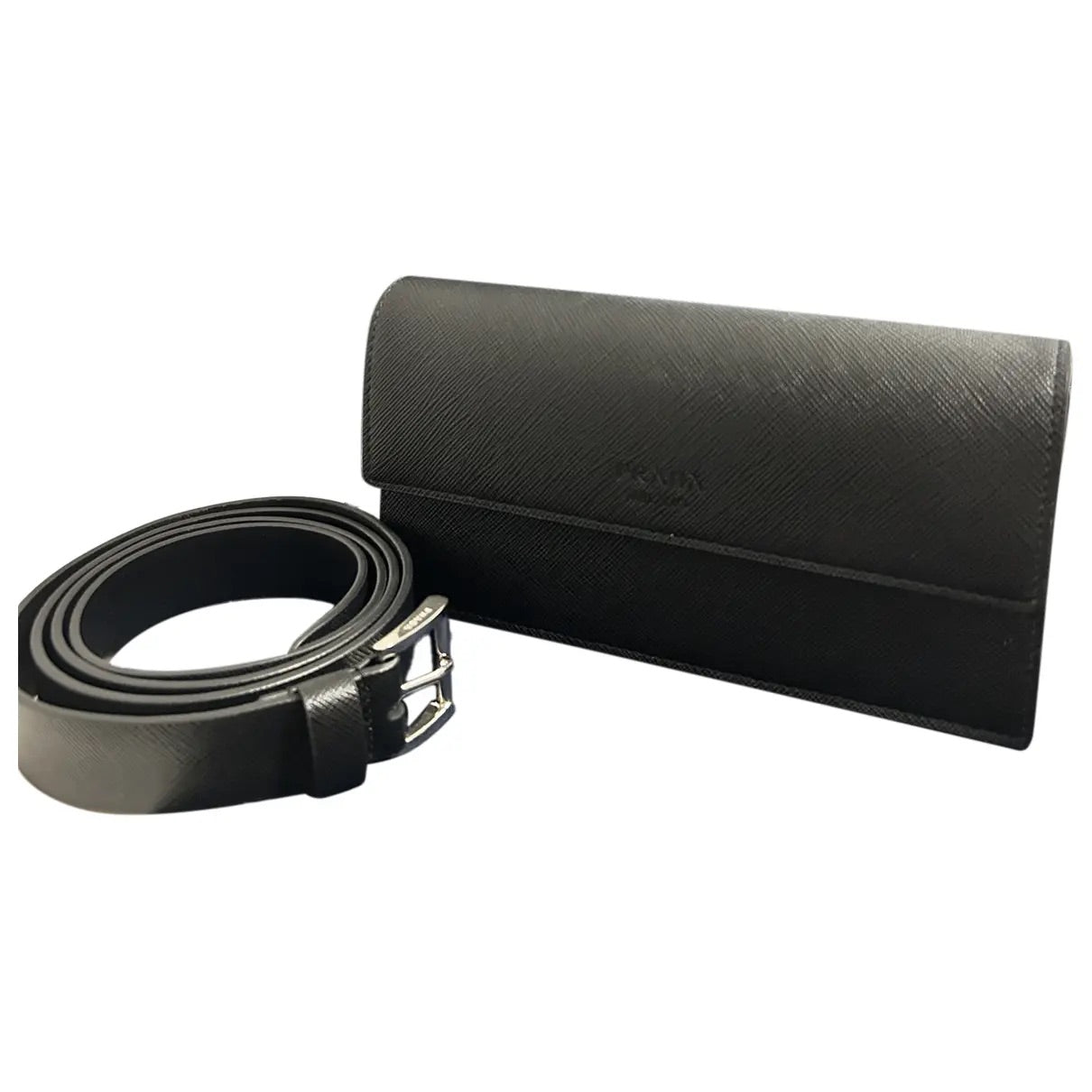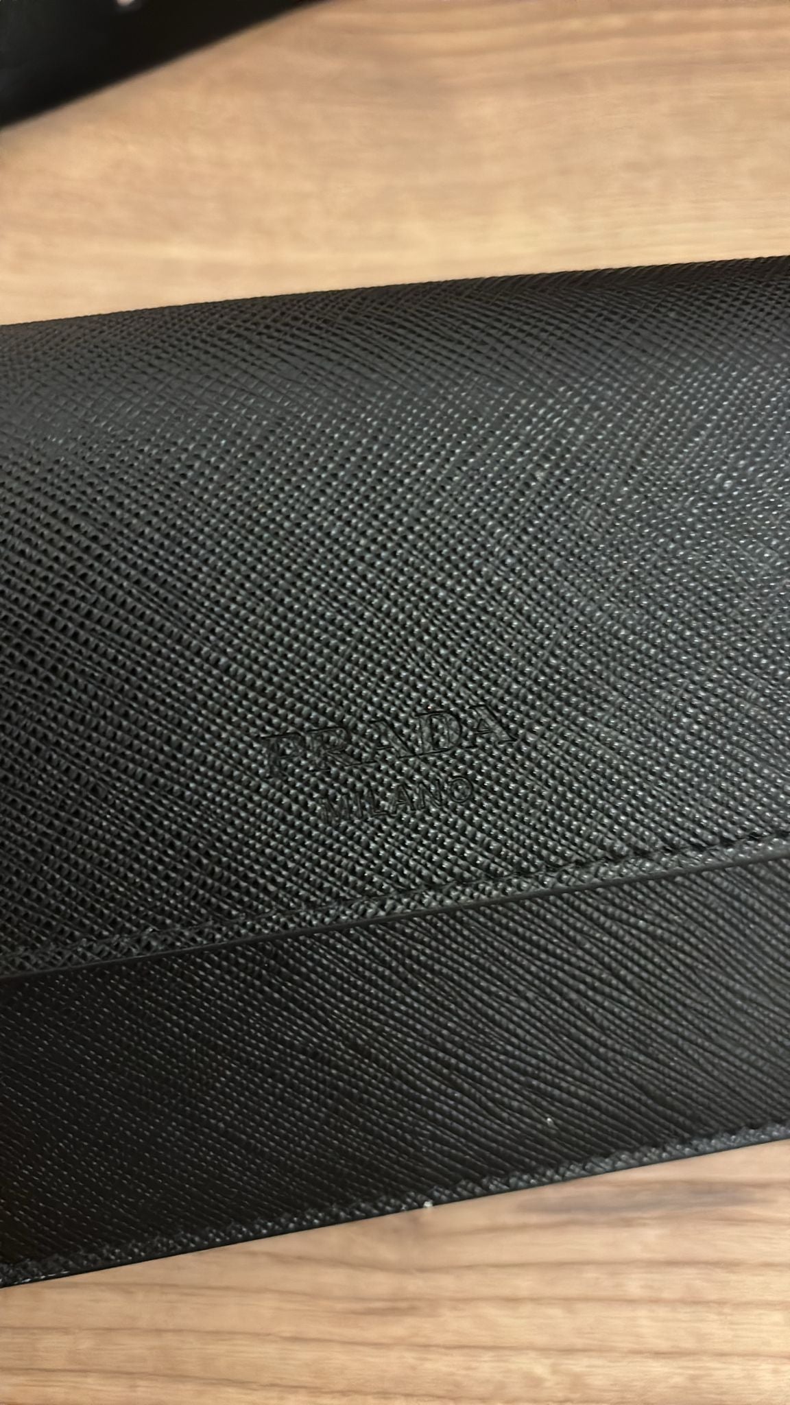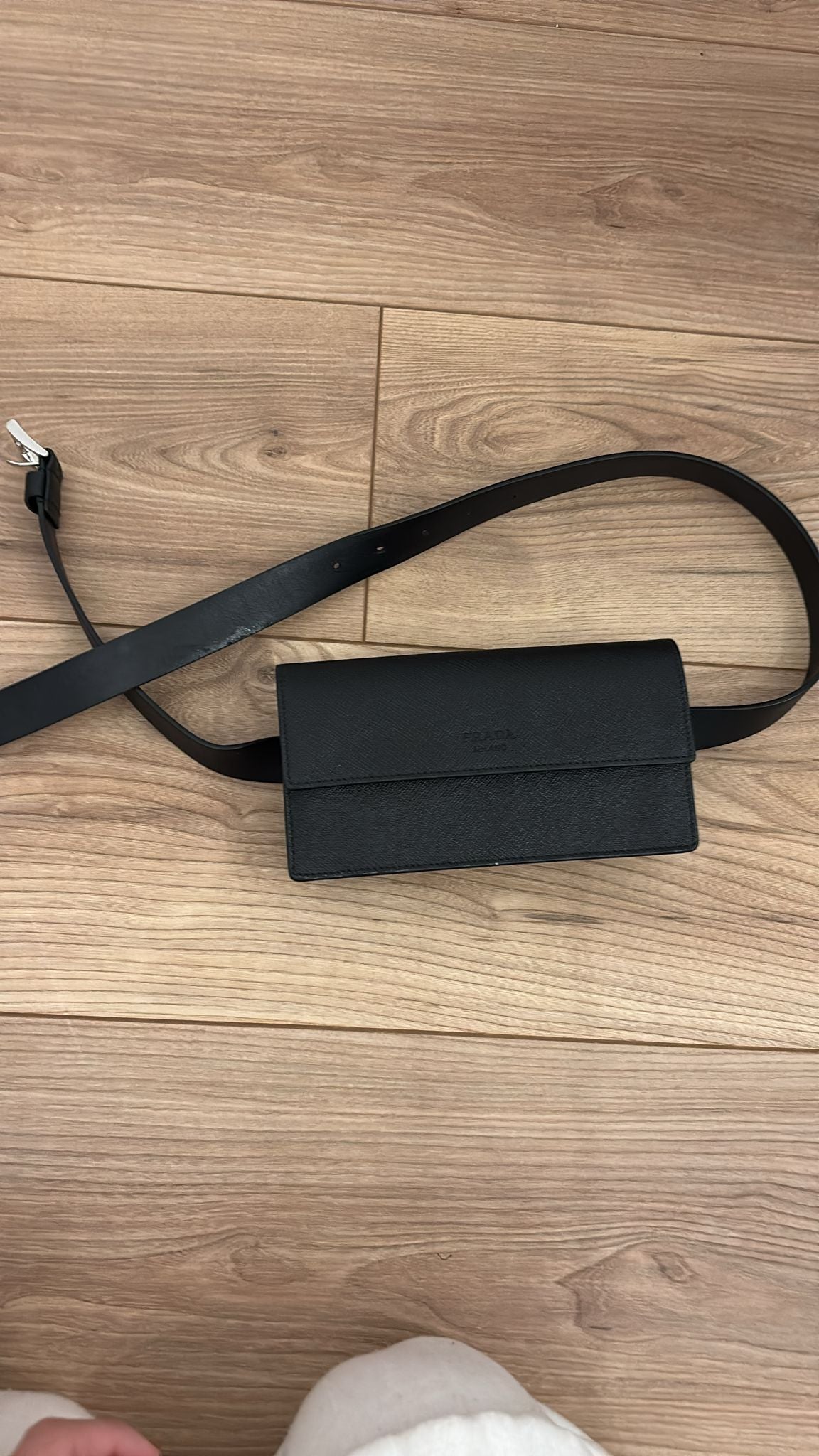 Prada black Saffiano leather belt pouch bag. Prada tone-on-tone signature on the front. dimensions. 19*10*4cm. interior with card holder and 2 compartments. excellent condition