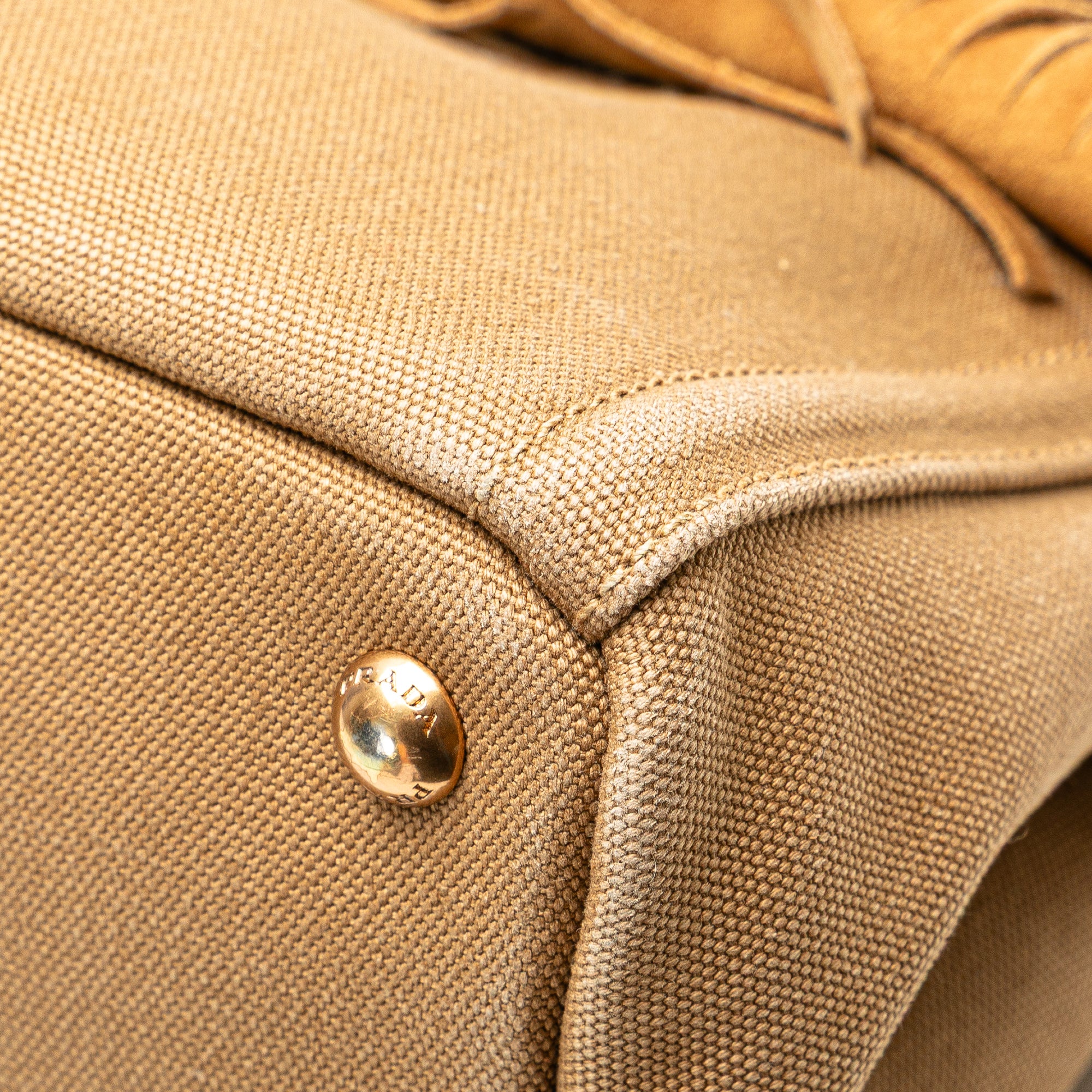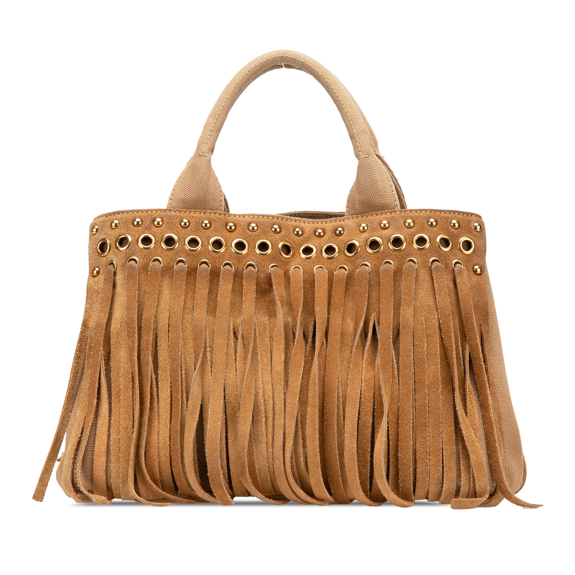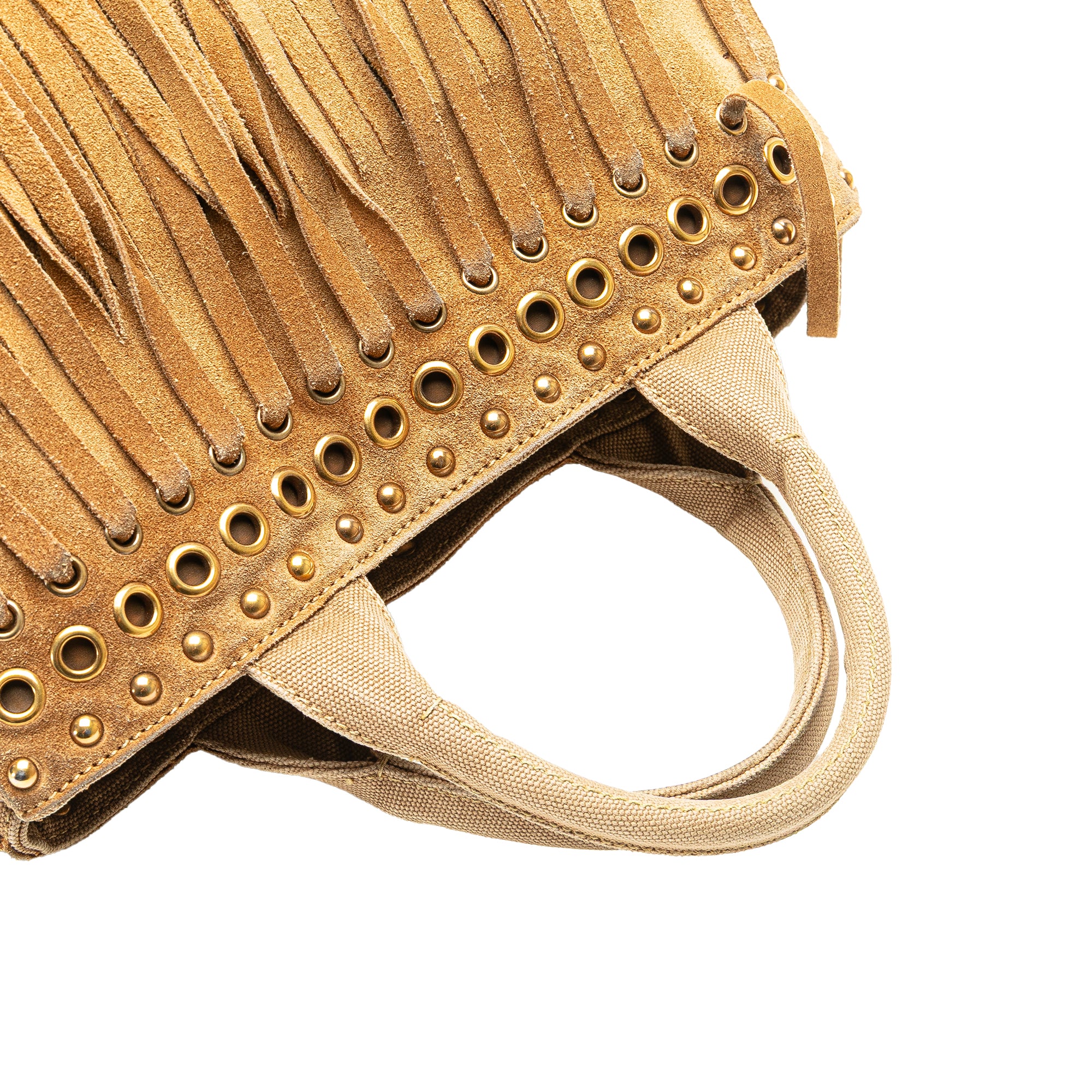 This handbag features a canvas body with suede fringes, grommet details, rolled handles, an open top, and interior zip and slip pockets. Retail Price: 990.00