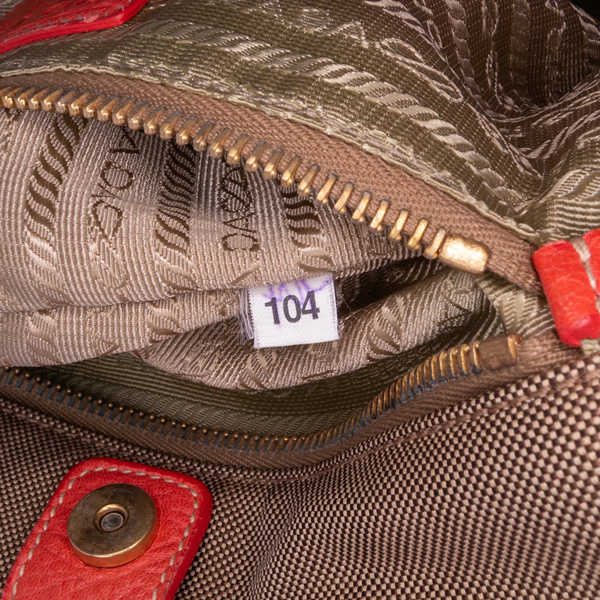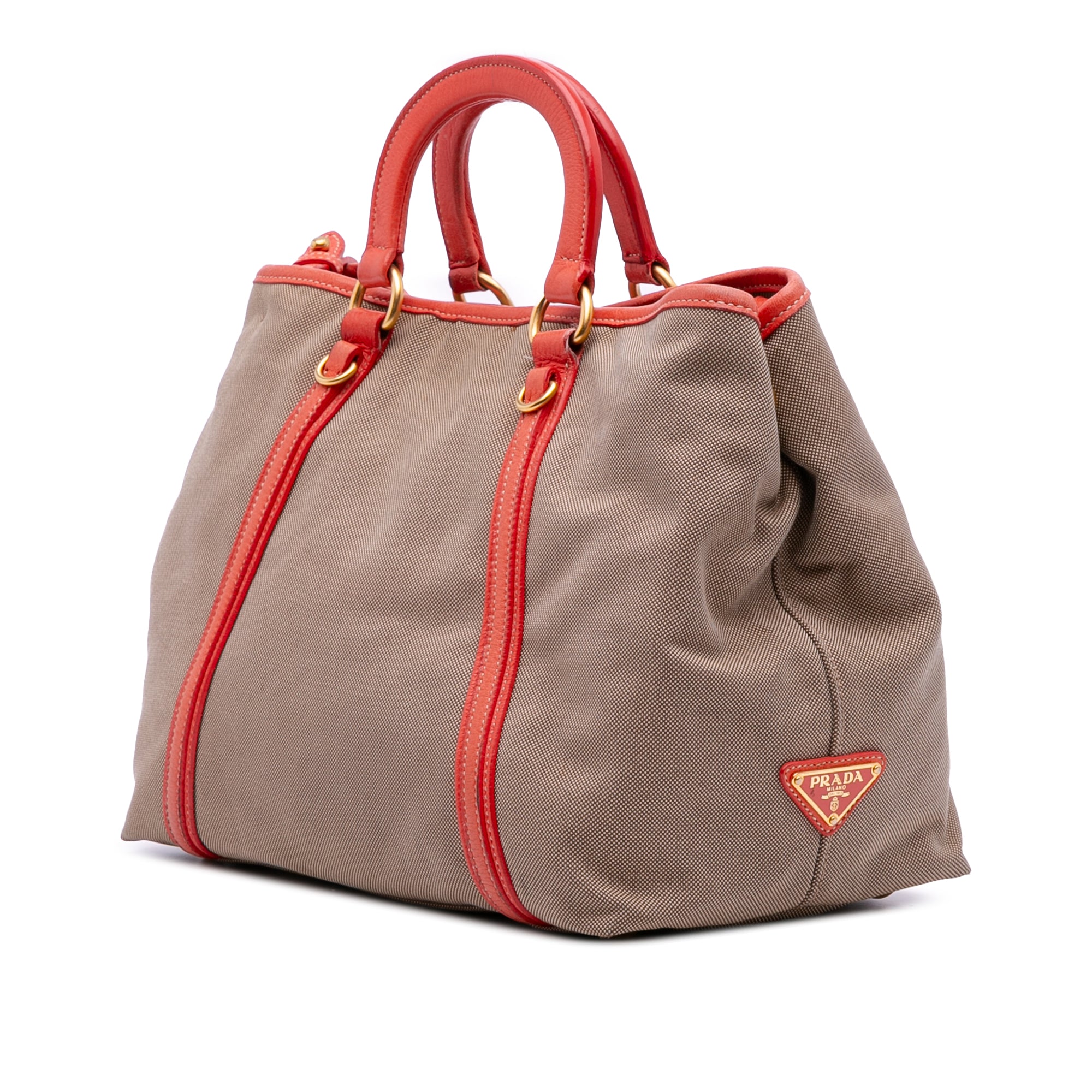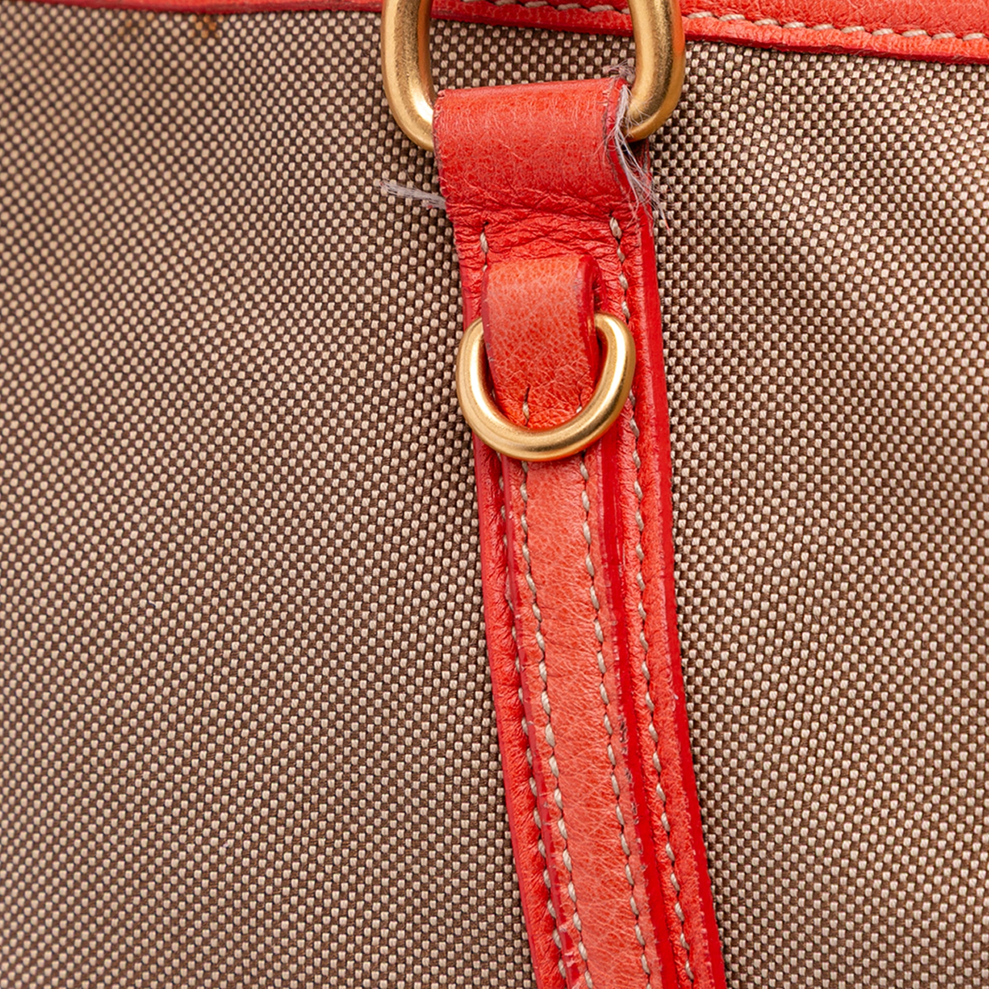 This satchel features a canvas body with leather trim, structured leather handles, a detachable flat leather strap, an open top with snap closure, and interior zip and slip pockets. Retail Price: 500.00