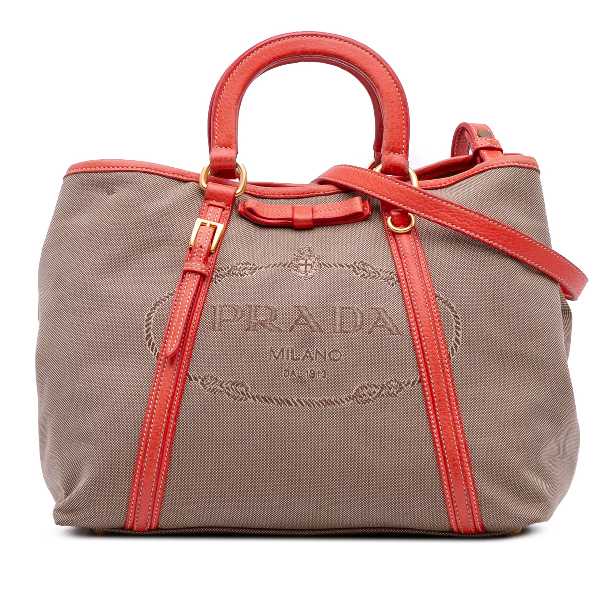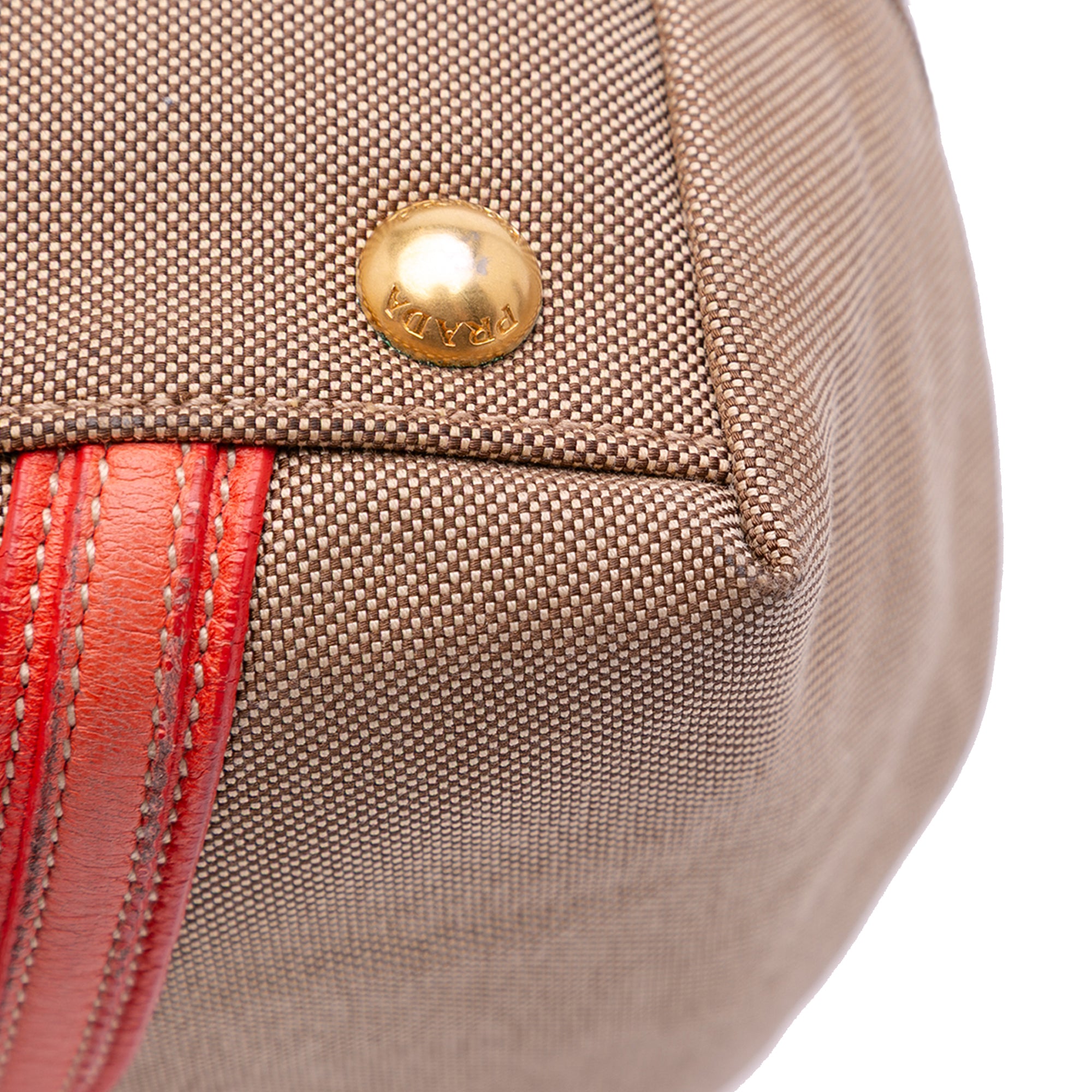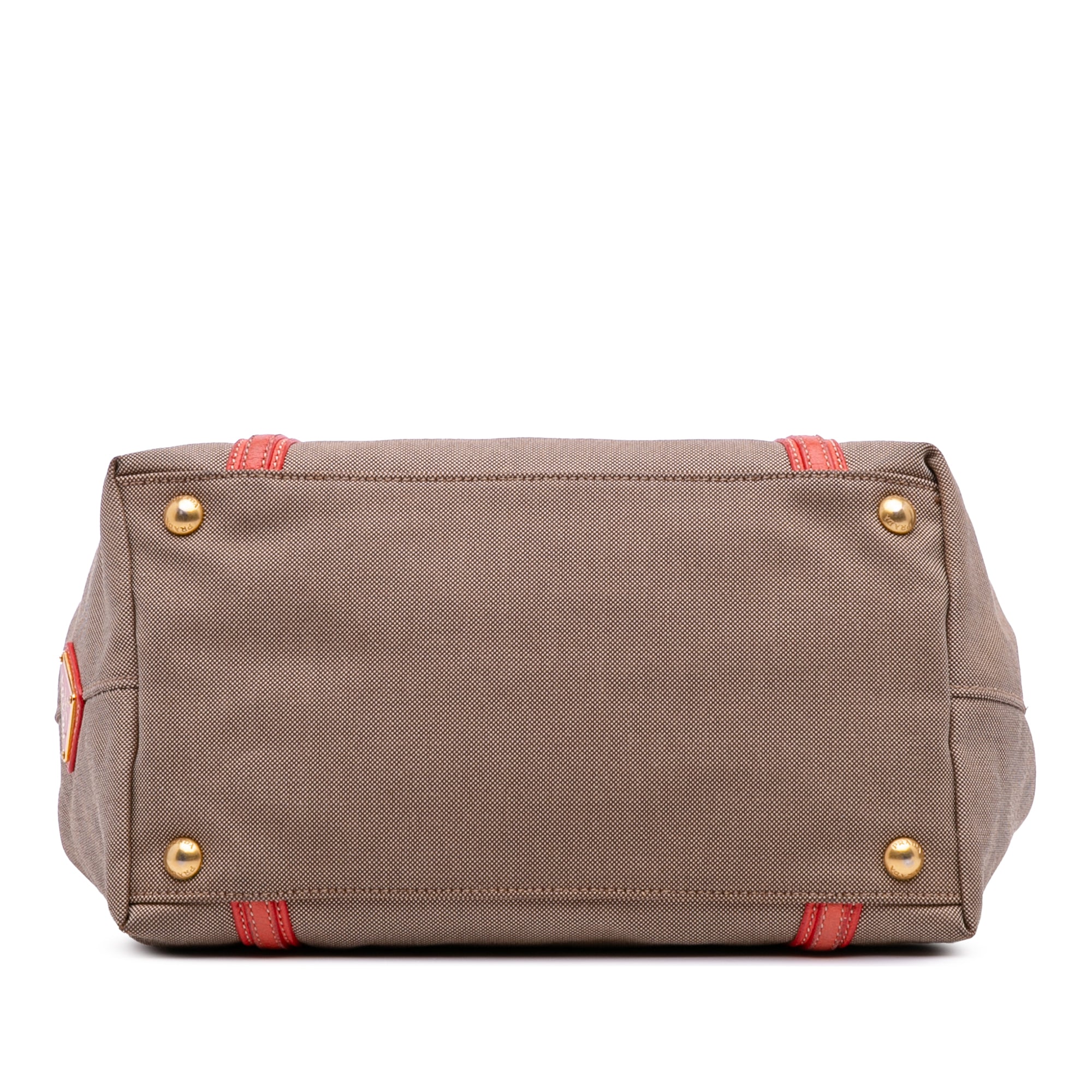 This satchel features a canvas body with leather trim, structured leather handles, a detachable flat leather strap, an open top with snap closure, and interior zip and slip pockets. Retail Price: 500.00