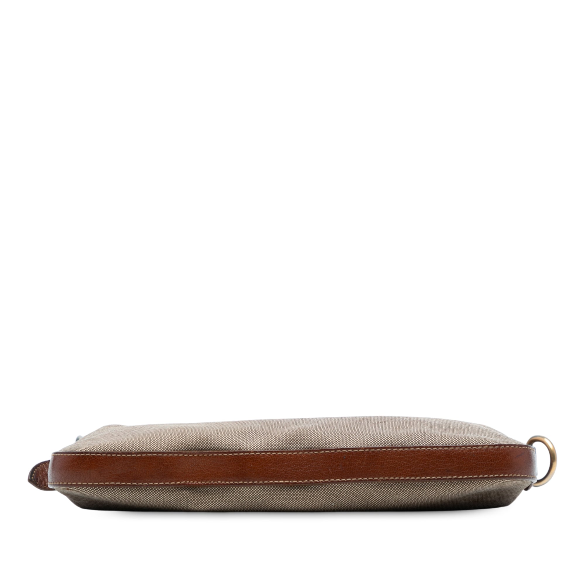 This crossbody bag features a canvas body with leather trim, an adjustable flat strap with leather shoulder pad, a top zip closure, and an interior zip pocket. Retail Price: 895.00
