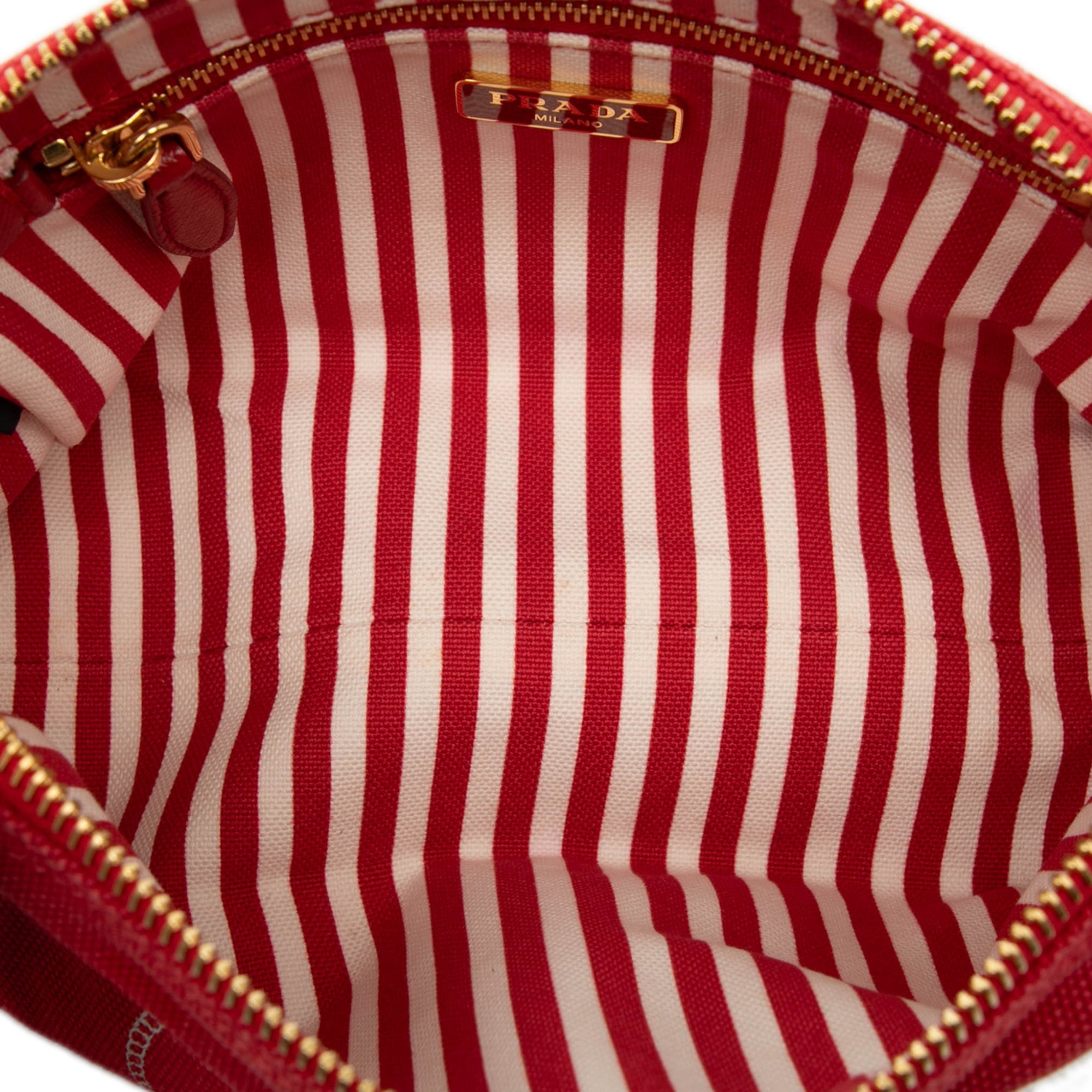 This pouch features a canvas body, a top zip closure, and an interior zip pocket. Retail Price: 555.00