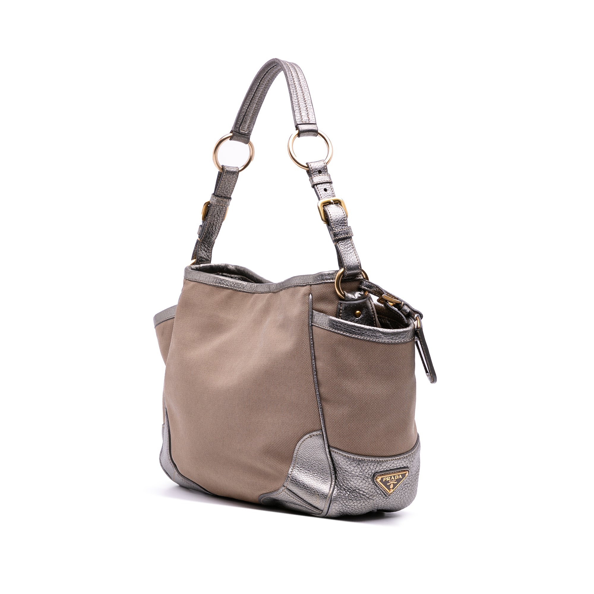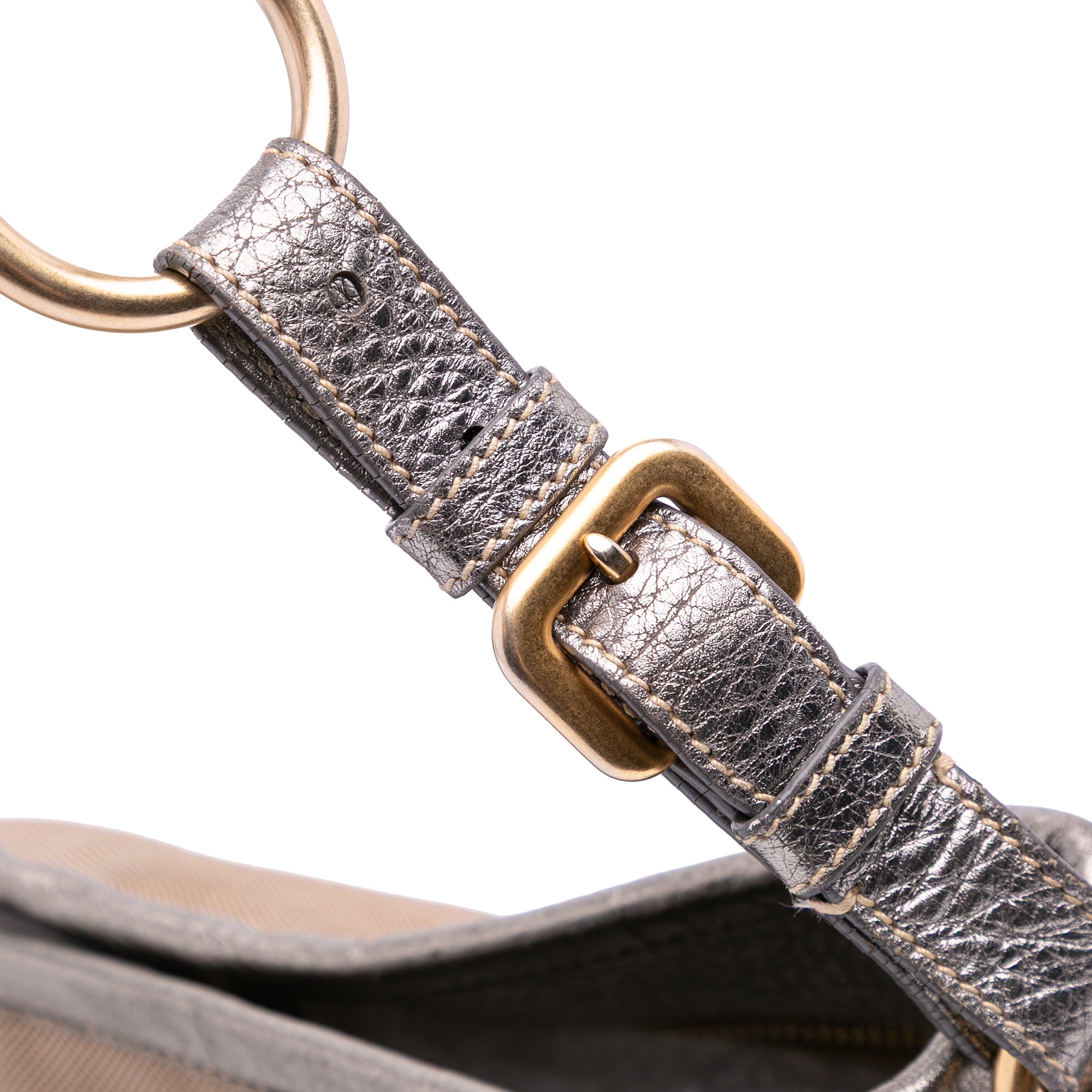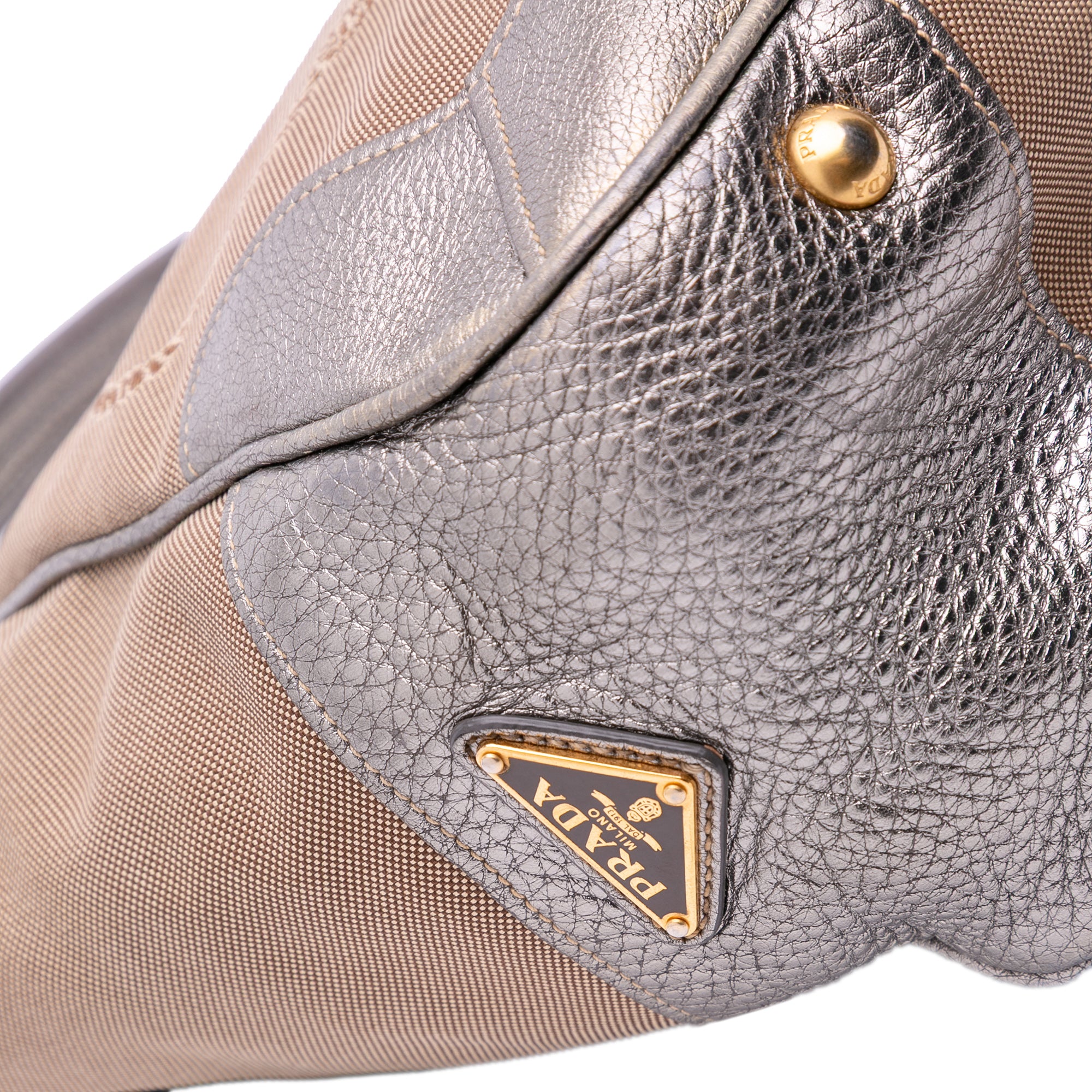 This tote bag features a canvas body with leather trim, a flat leather strap, an open top with magnetic snap closure, exterior side slip pockets and an interior zip pocket. Retail Price: 895.00