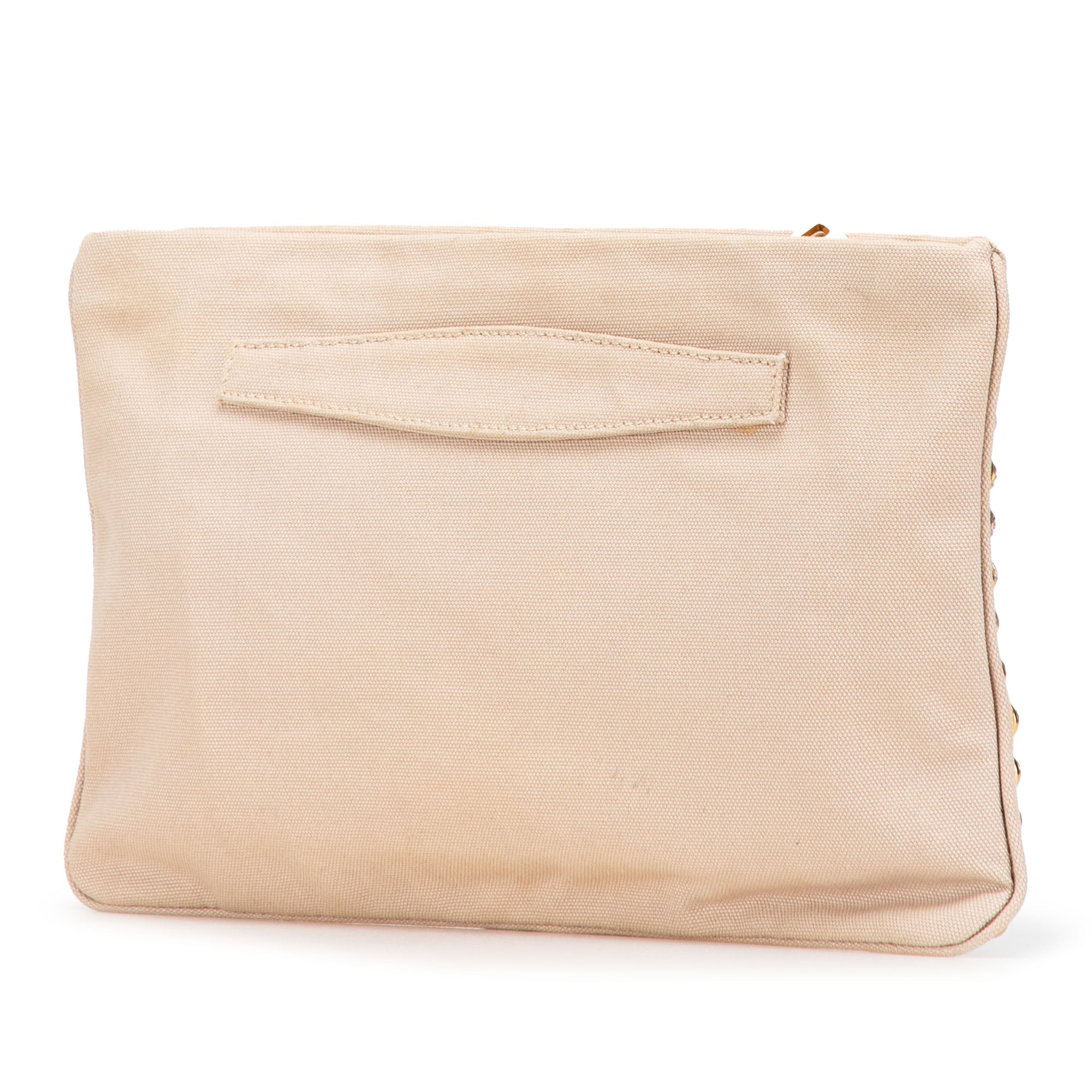 This clutch features a studded canvas body, a top zip closure, and interior zip and slip pockets. Inclusion: authenticity card. Retail Price: 750.00