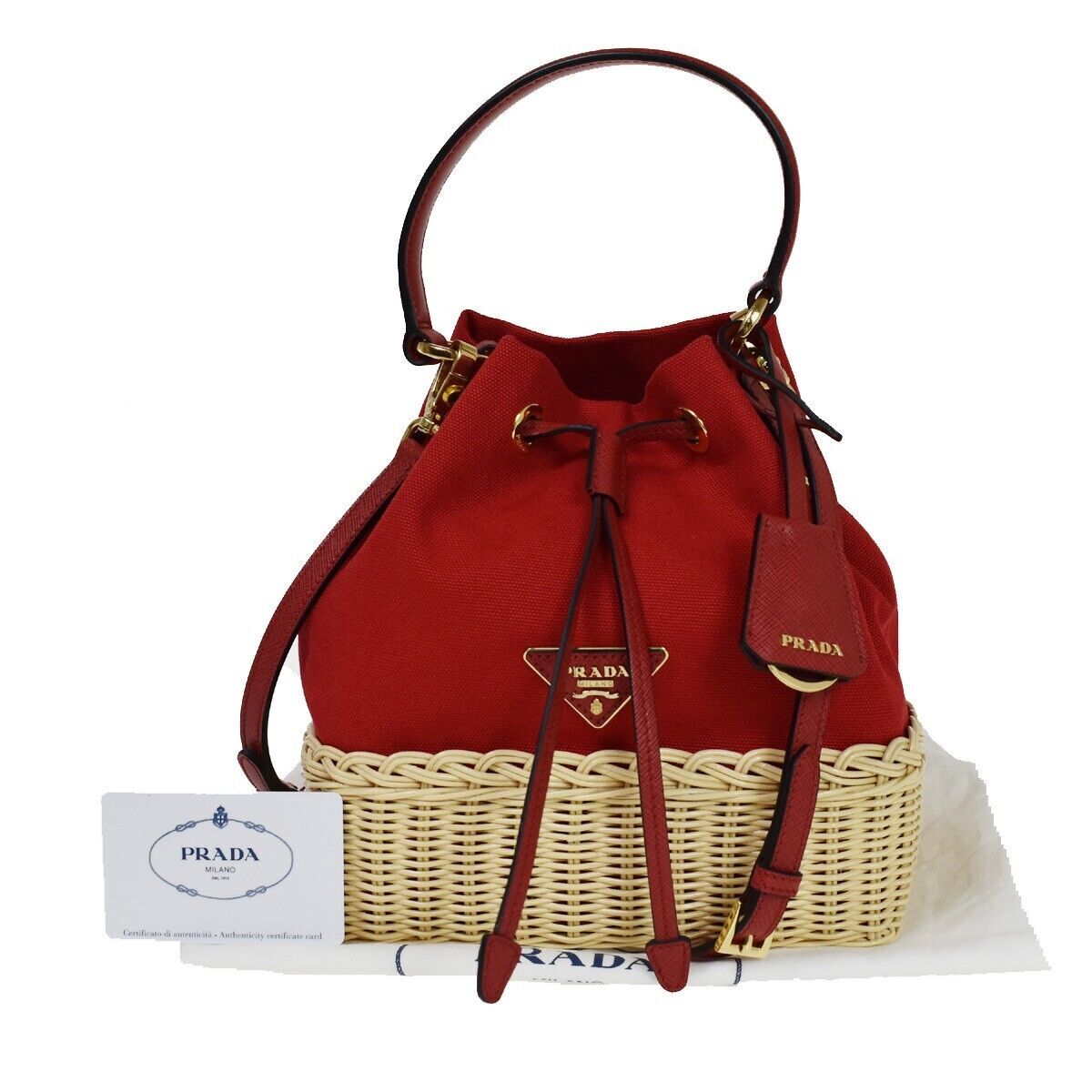 Brand : Prada Model : Drawstring Bucket bag Style : Canvas and Wicker Serial number : NA Inclusions : Guarranted Card,Dust bag,Clochette,Shoulder strap