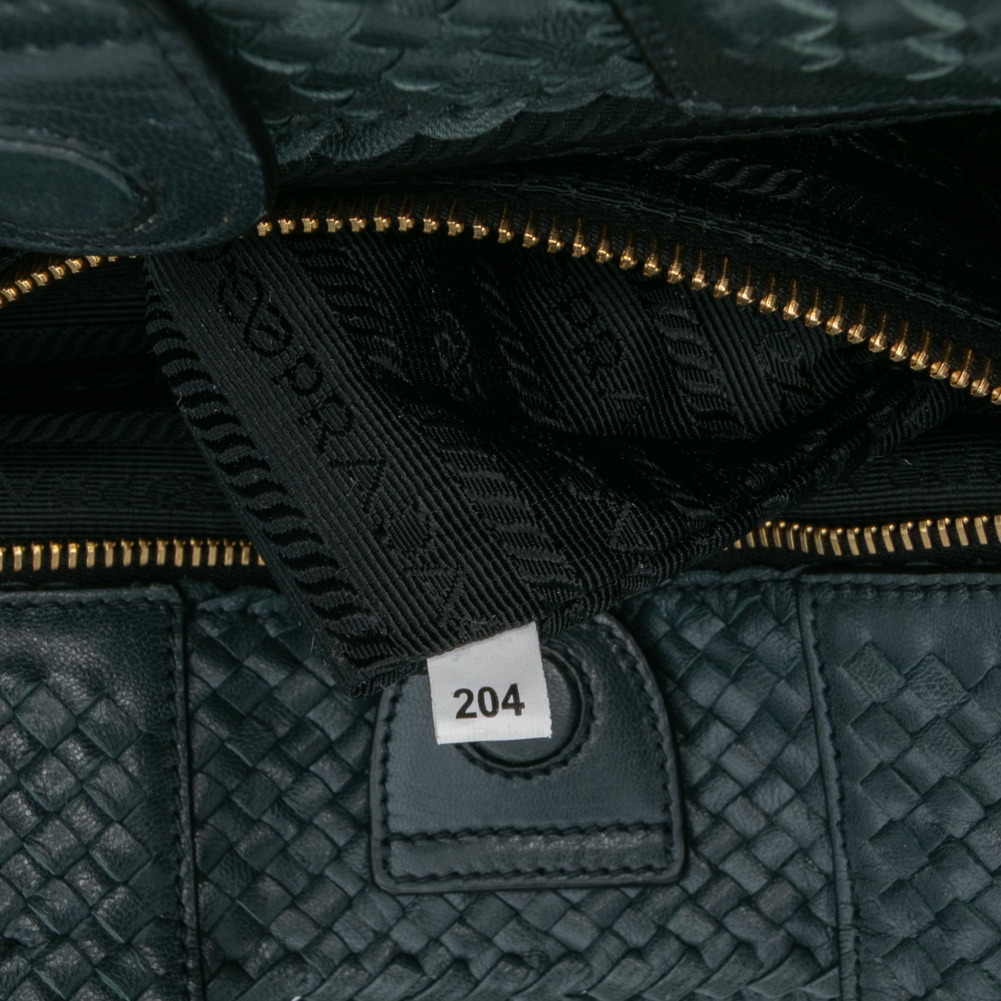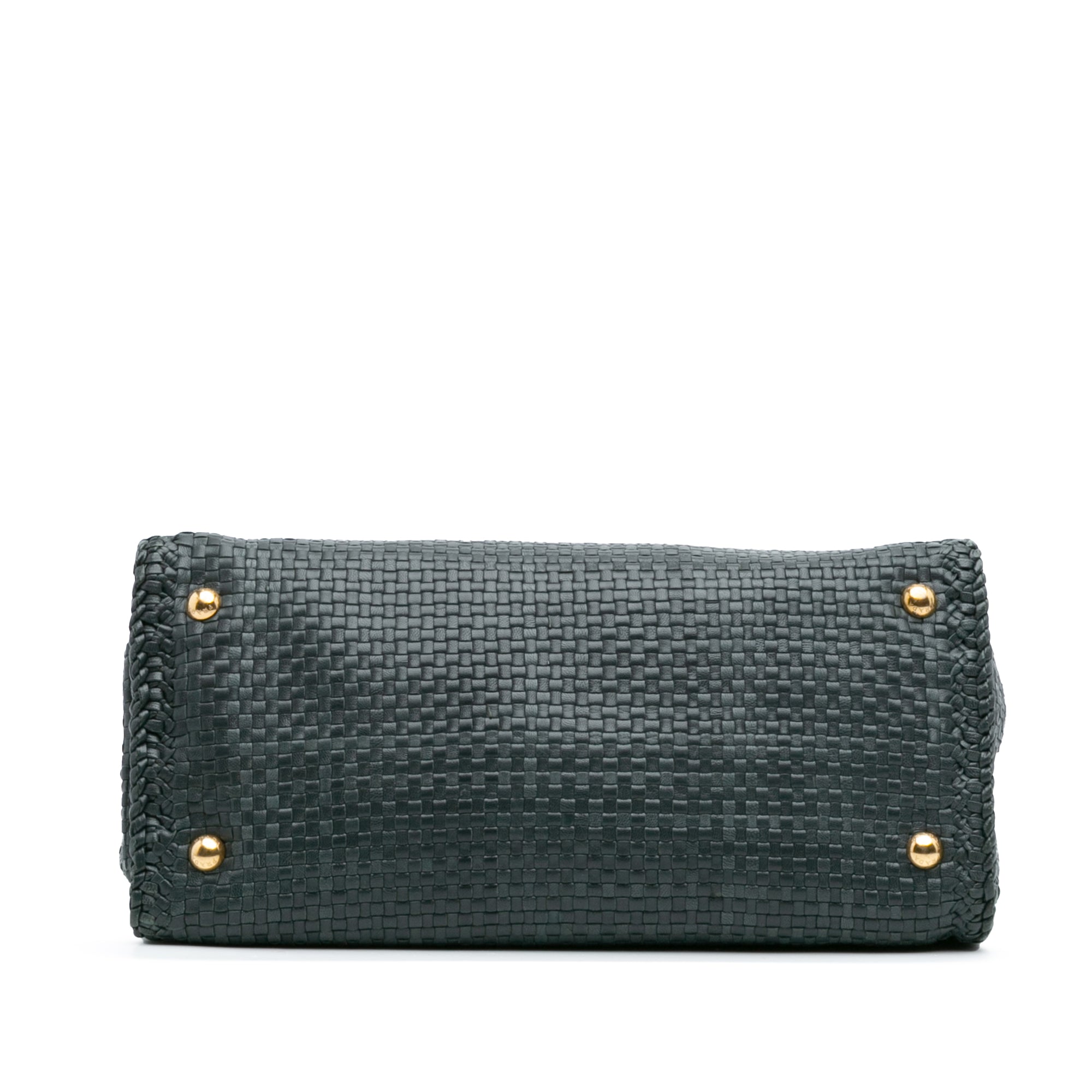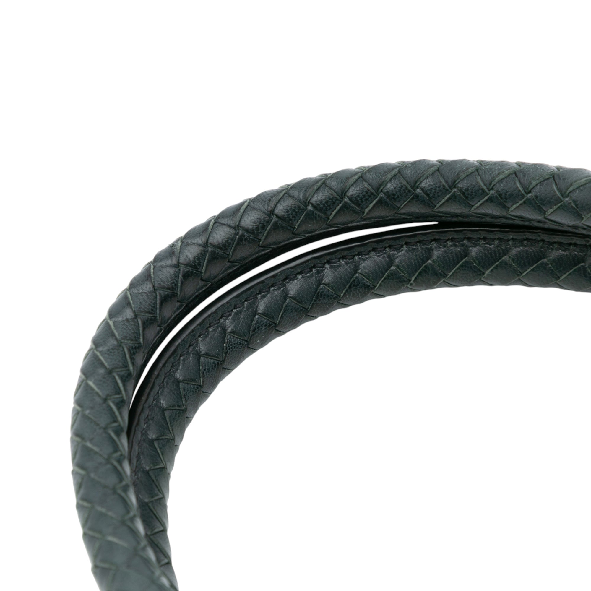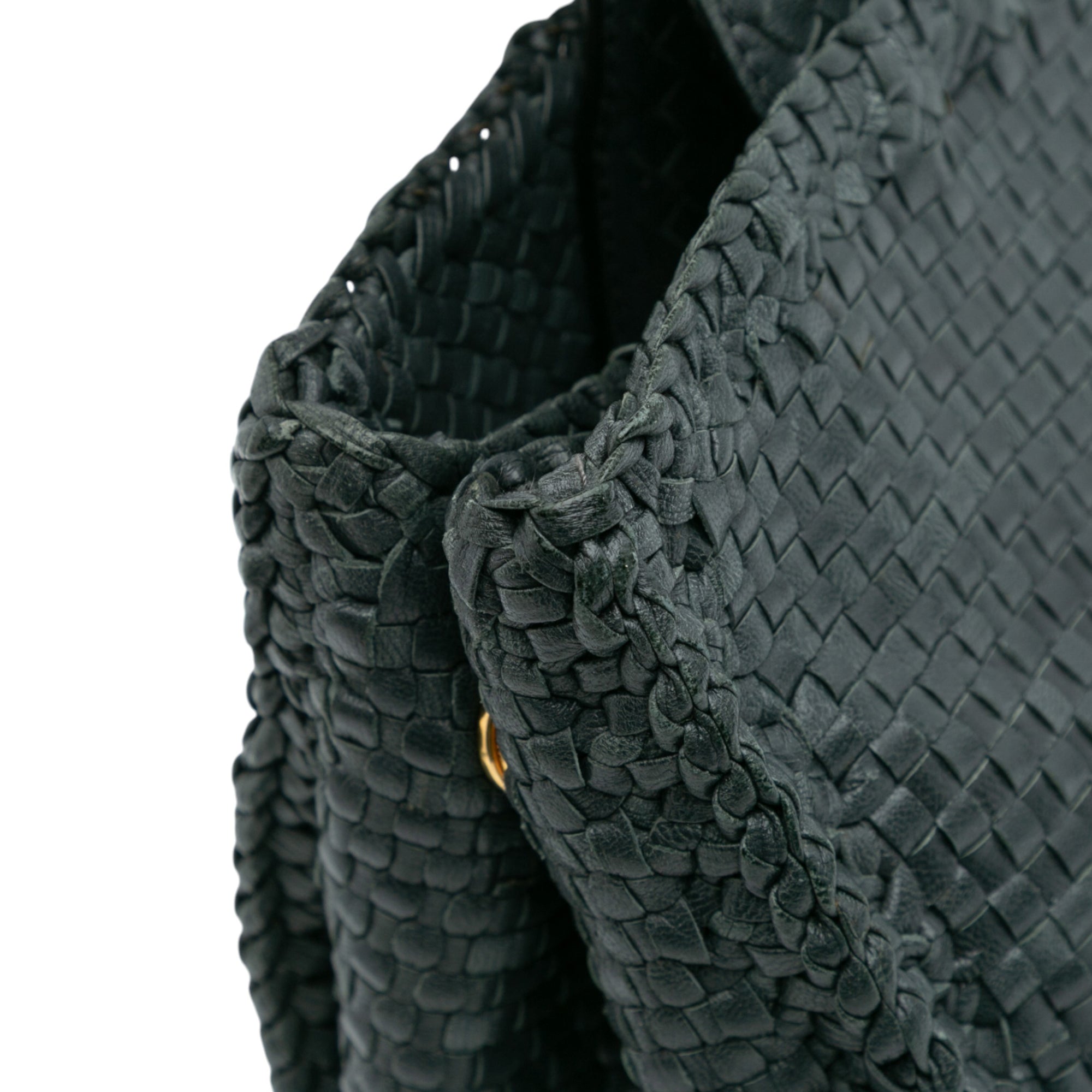 This satchel features a woven leather body, rolled leather handles, an adjustable and detachable flat leather strap, an open top with magnetic snap button closure, and interior zip and slip pockets. Inclusion: authenticity card. Retail Price: 1500.00