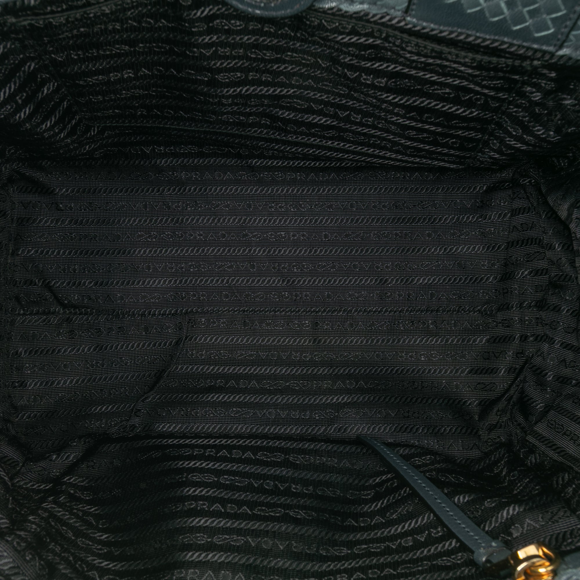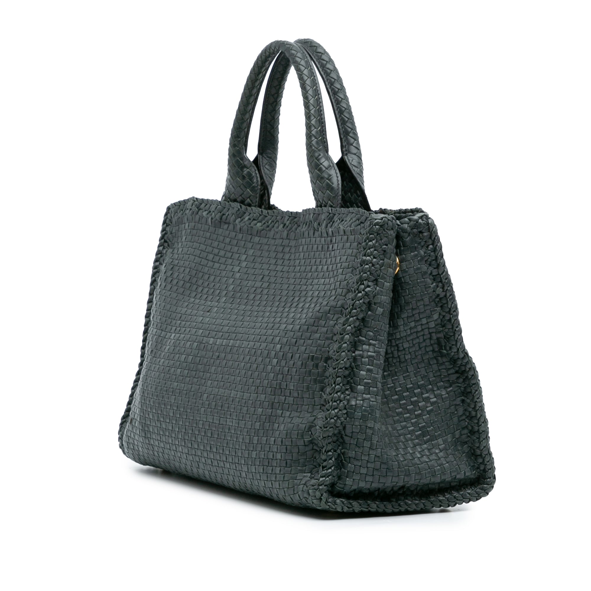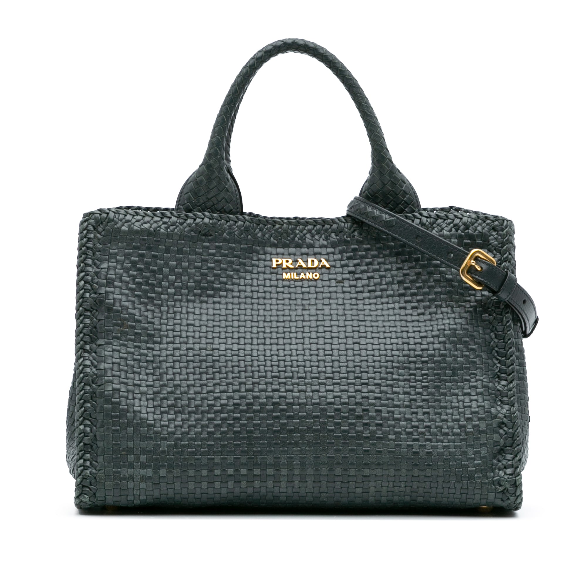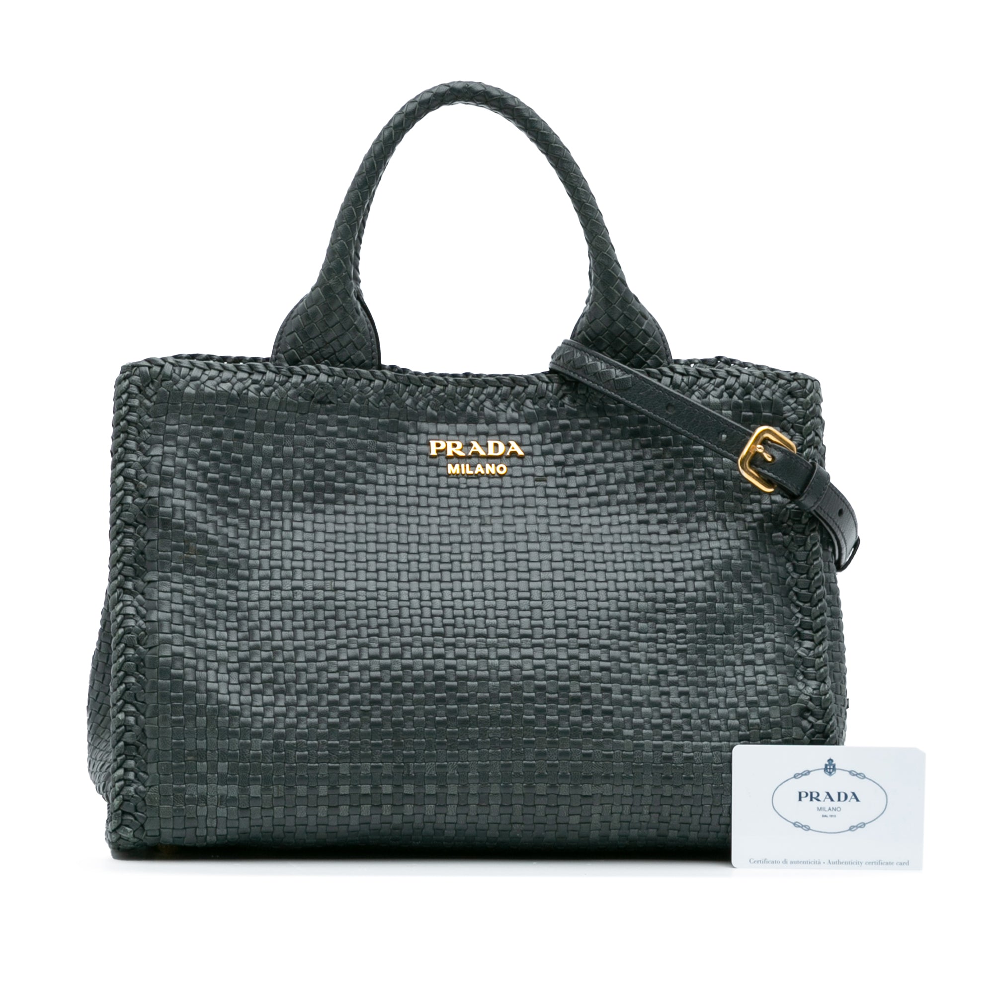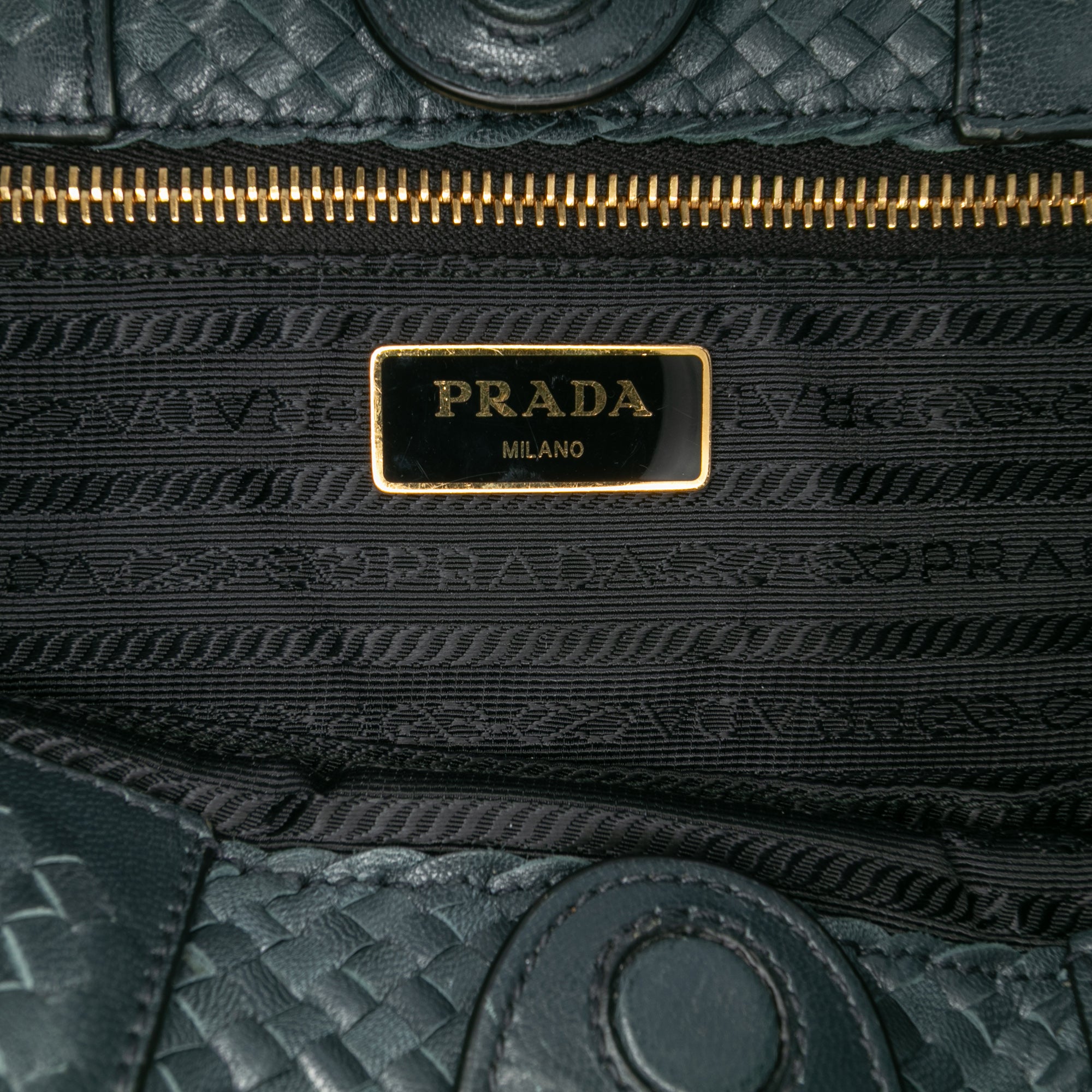This satchel features a woven leather body, rolled leather handles, an adjustable and detachable flat leather strap, an open top with magnetic snap button closure, and interior zip and slip pockets. Inclusion: authenticity card. Retail Price: 1500.00