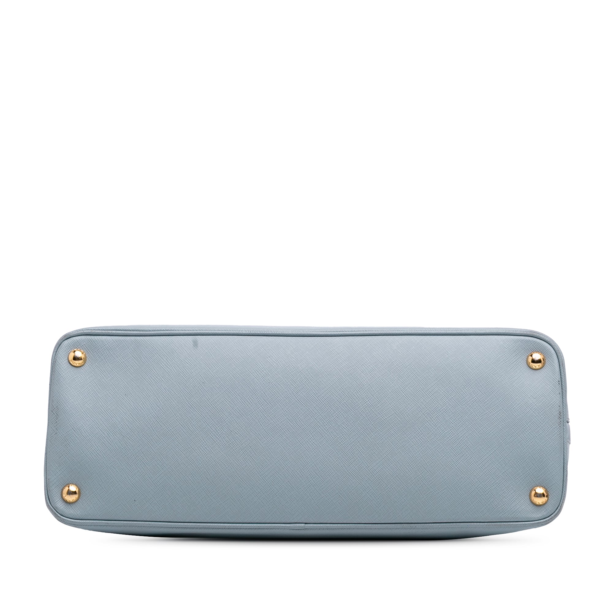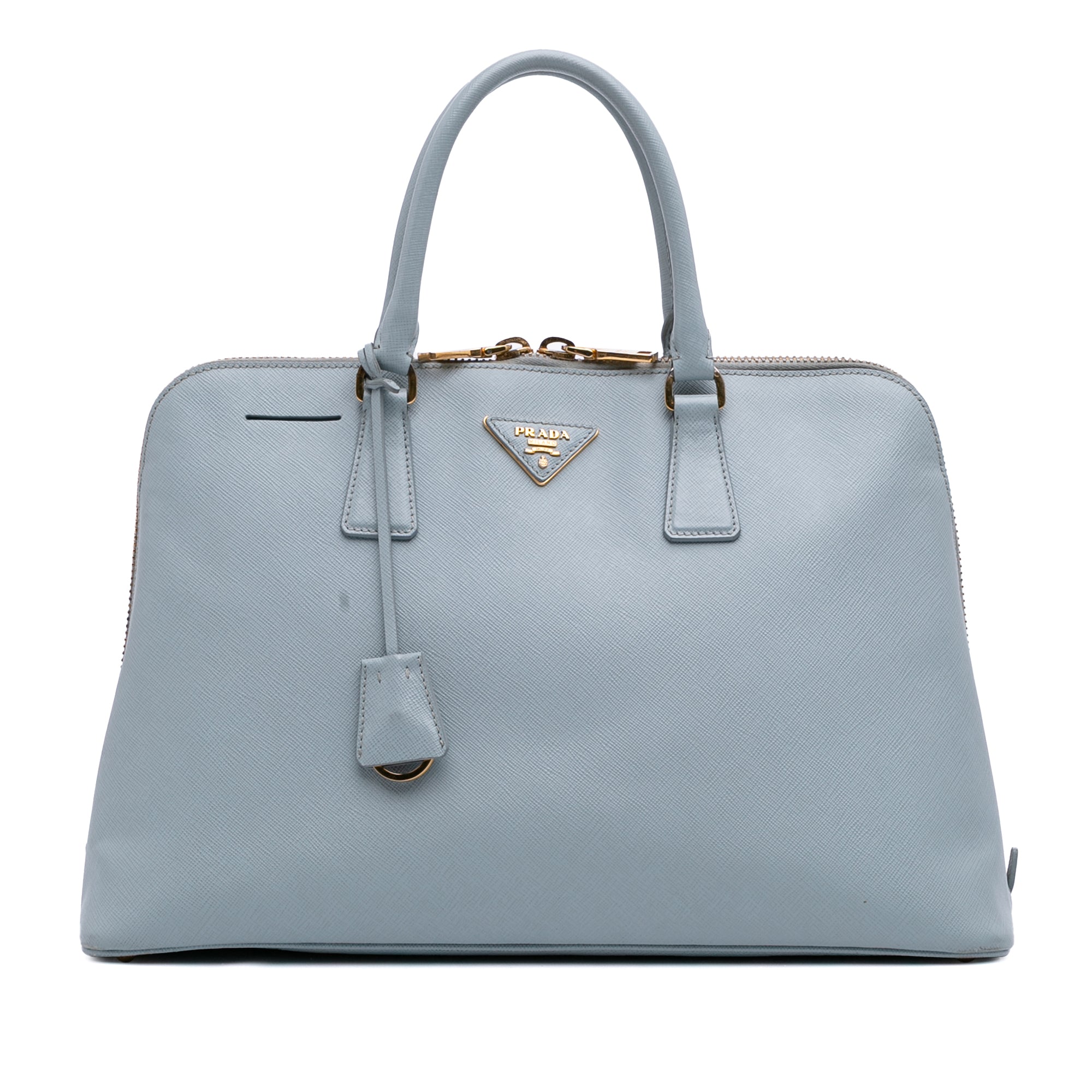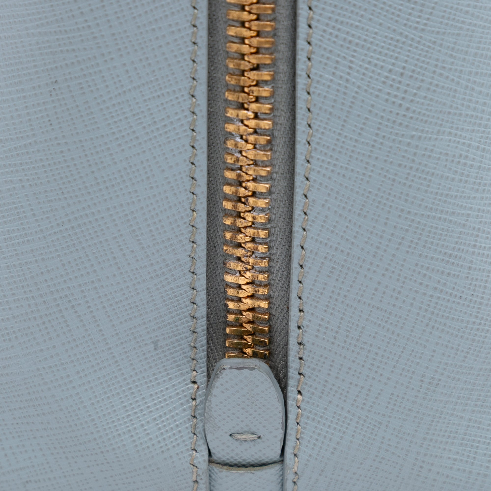 The Promenade features a saffiano leather body, rolled leather handles, a double zip around closure, an interior center zip compartment, and interior zip and slip pockets. Retail Price: 2200.00