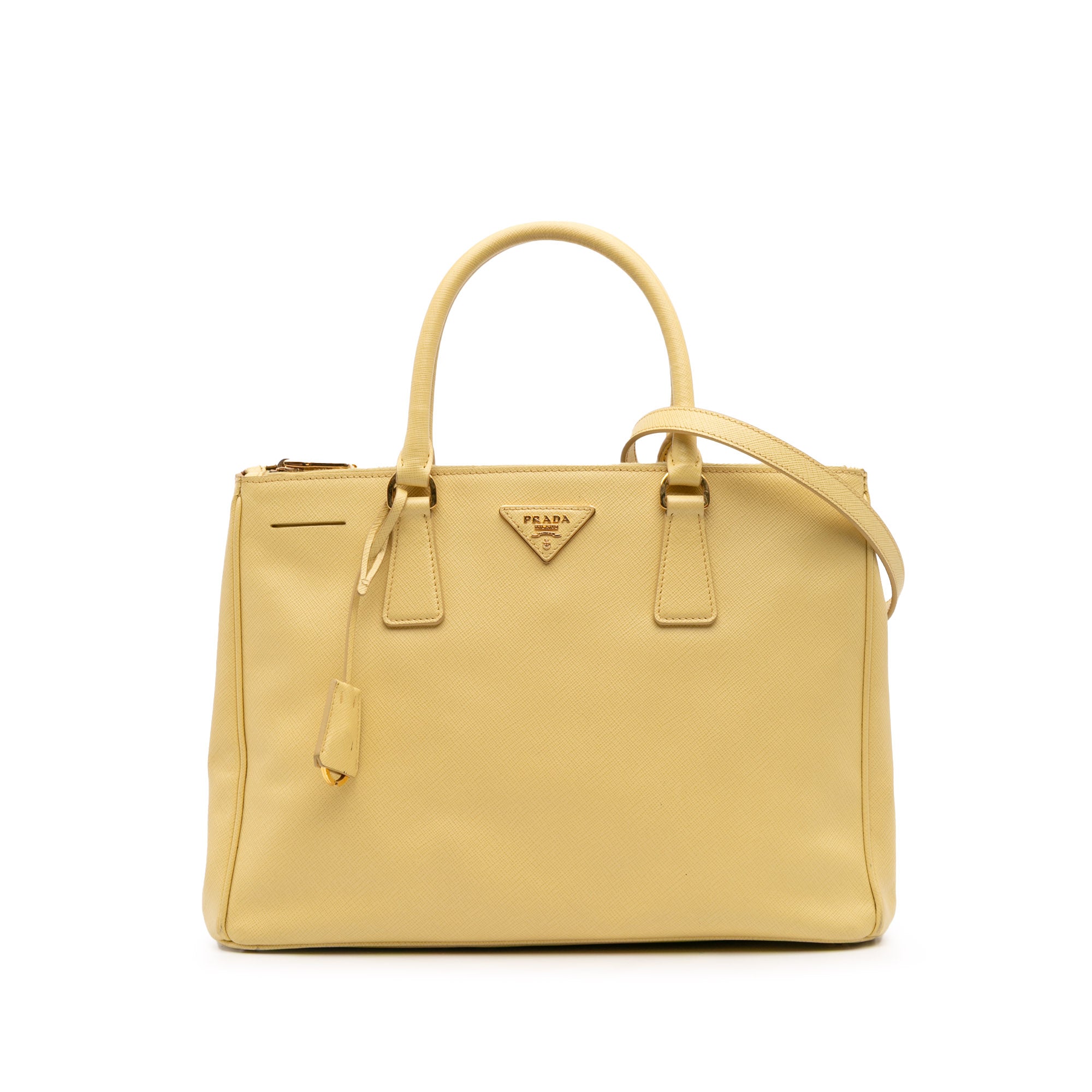 The Galleria features a saffiano leather body, rolled leather top handles, a detachable and adjustable flat leather shoulder strap, double top zip closures, and interior zip and slip pockets. Retail Price: 2390.00