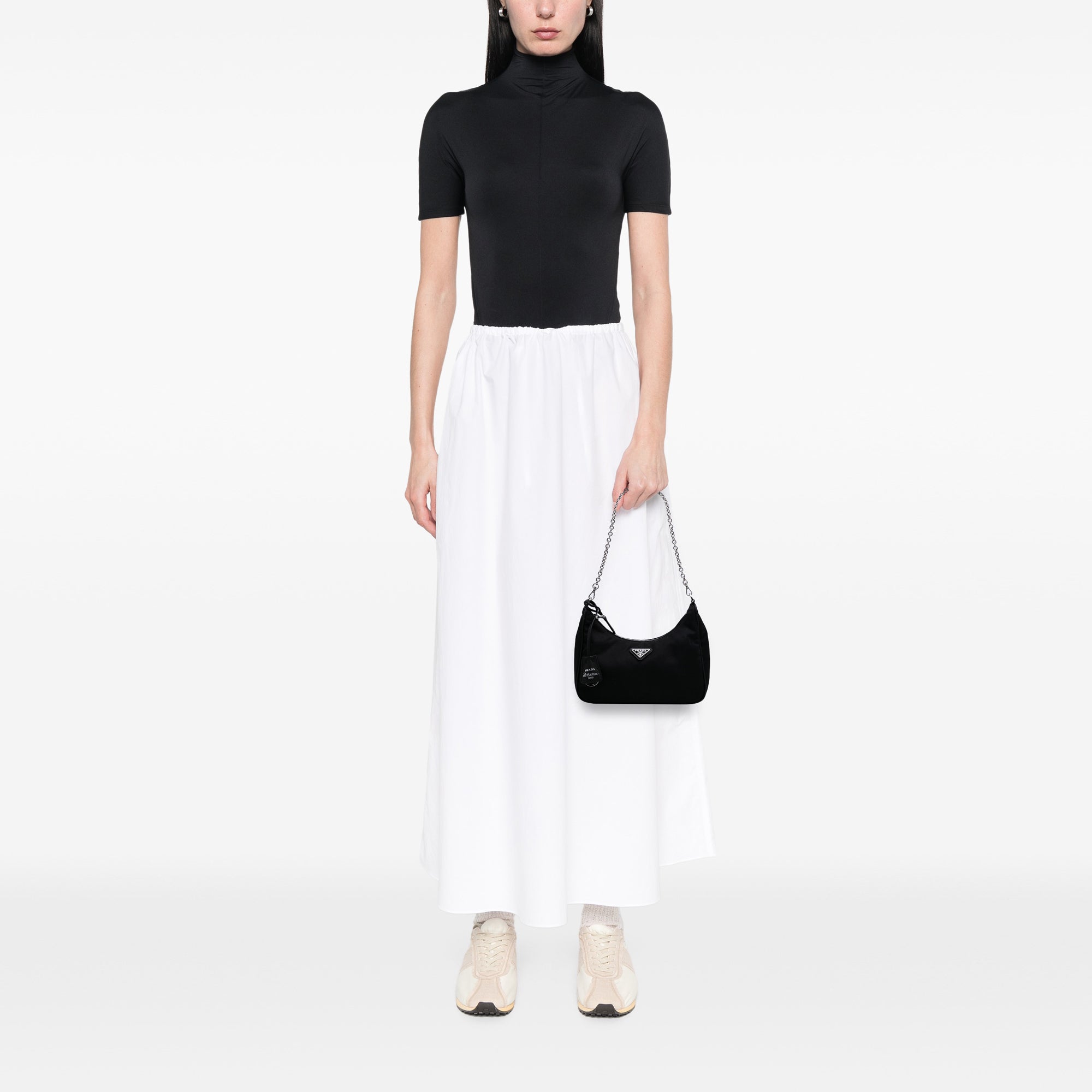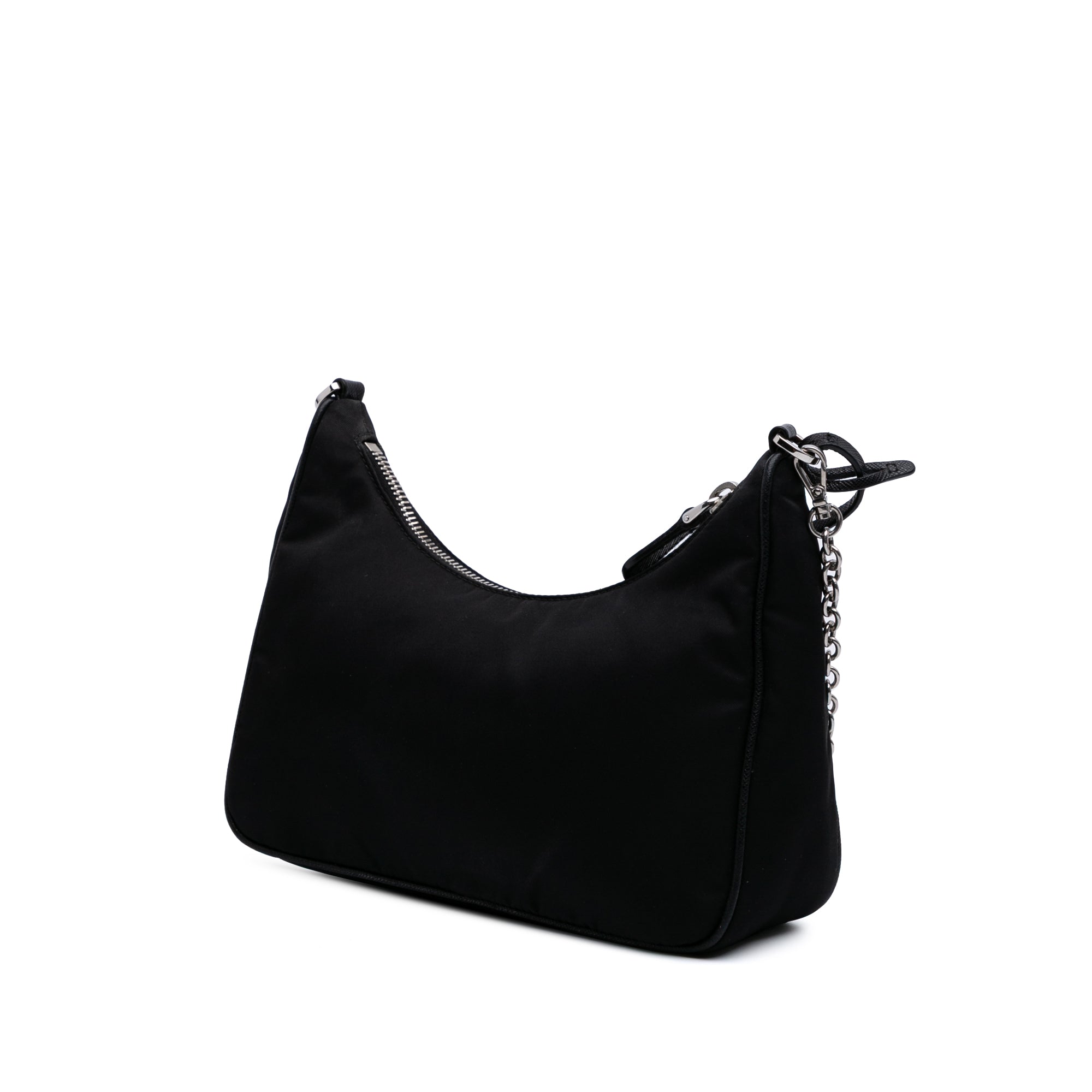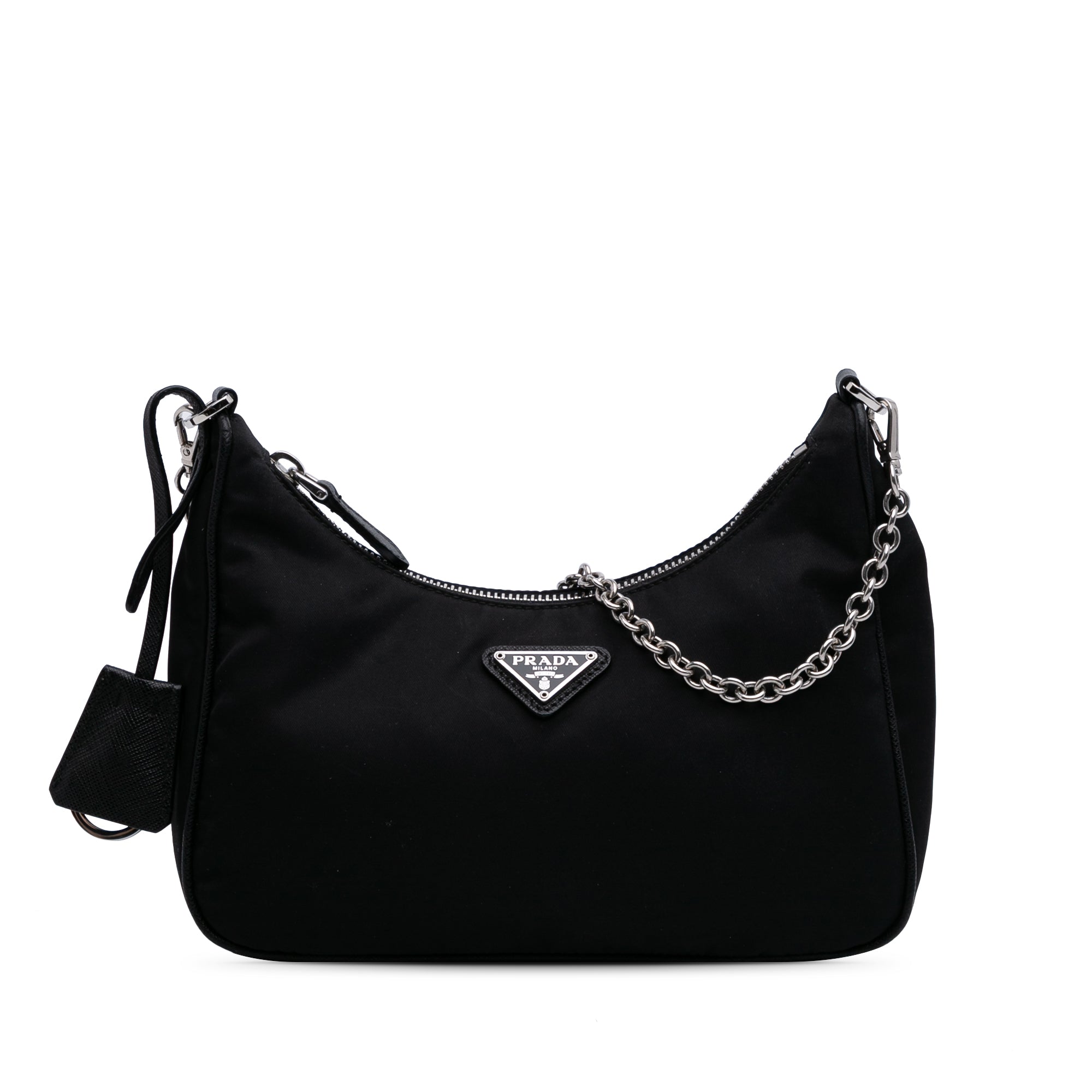 The Re-Edition 2005 satchel features a nylon body, a chain shoulder strap, and a top zip closure. Retail Price: 1600.00