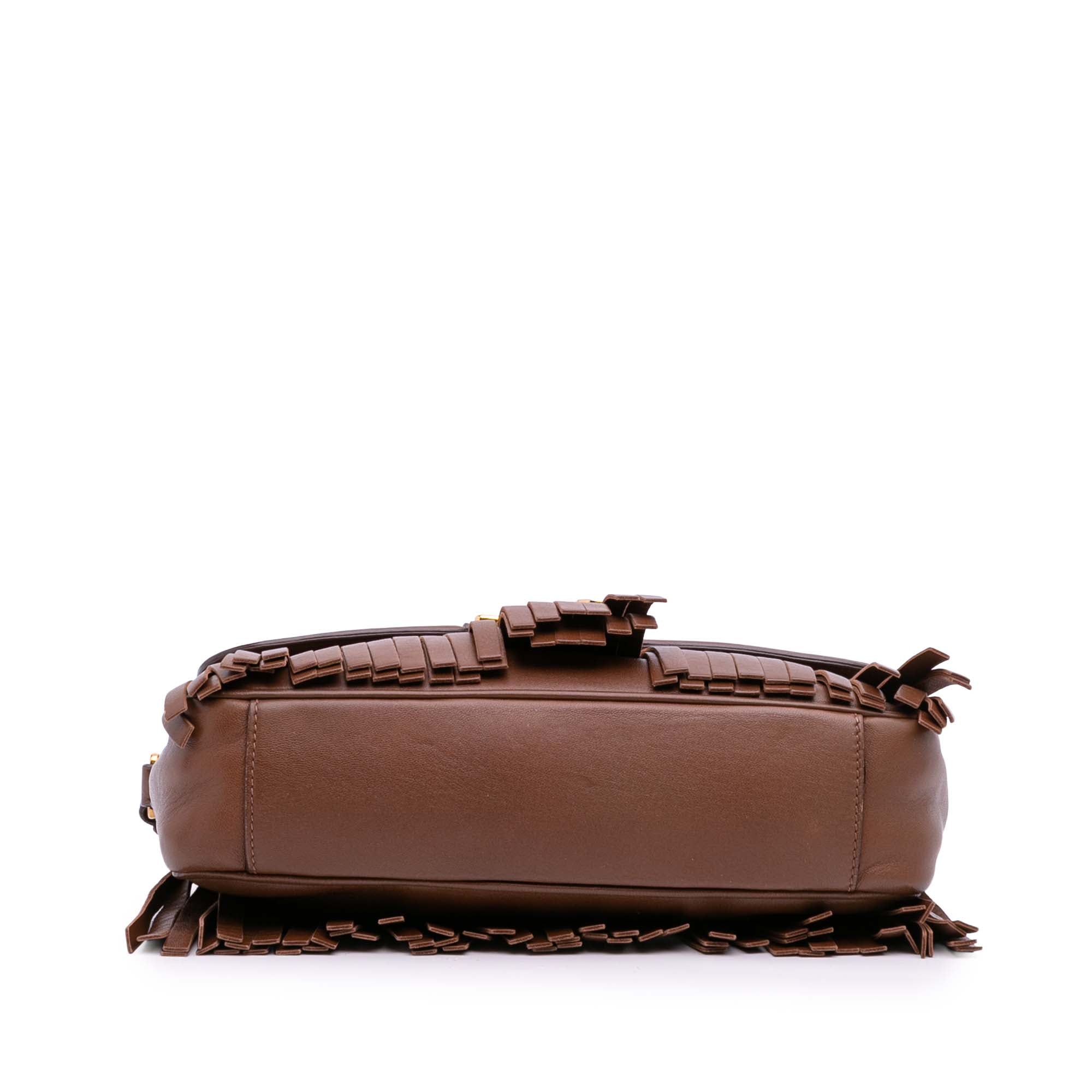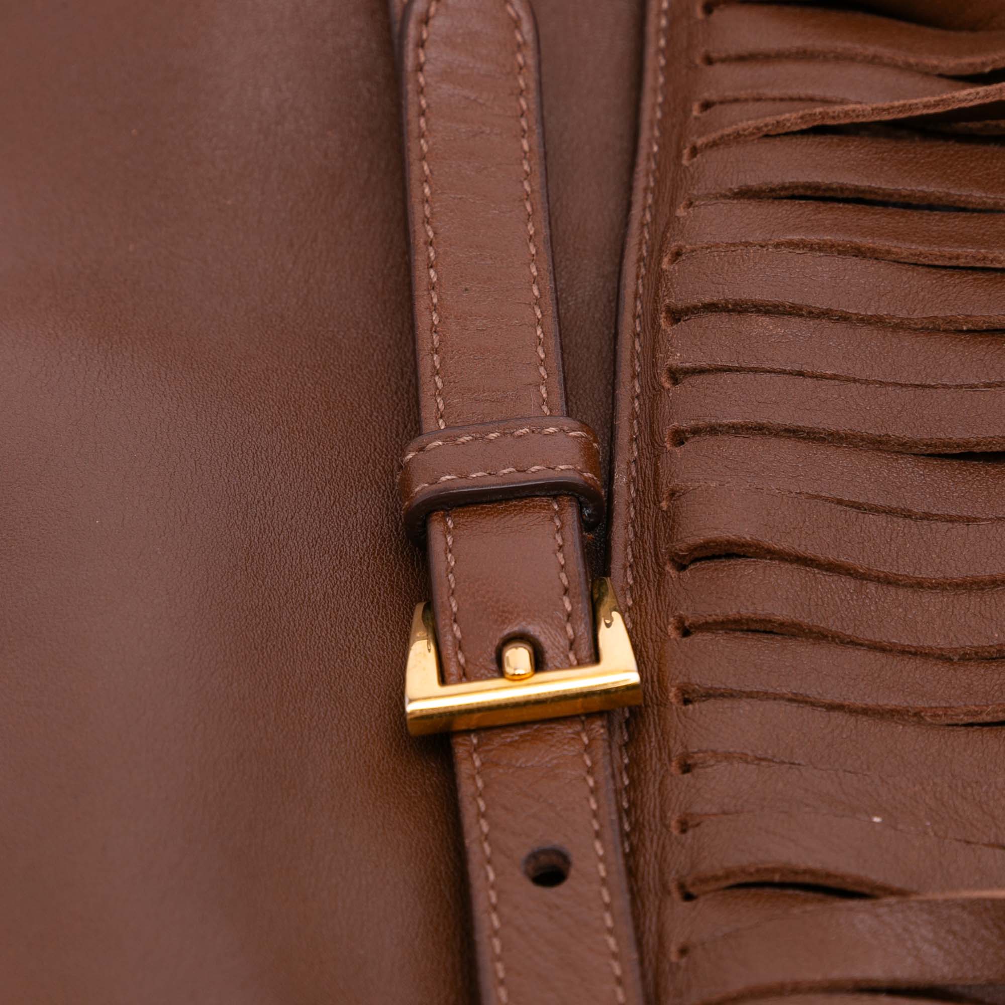 This crossbody bag features a fringe leather body, a flat leather strap, a top zip and front flap with push lock closure, and an interior zip pocket. Retail Price: 990.00