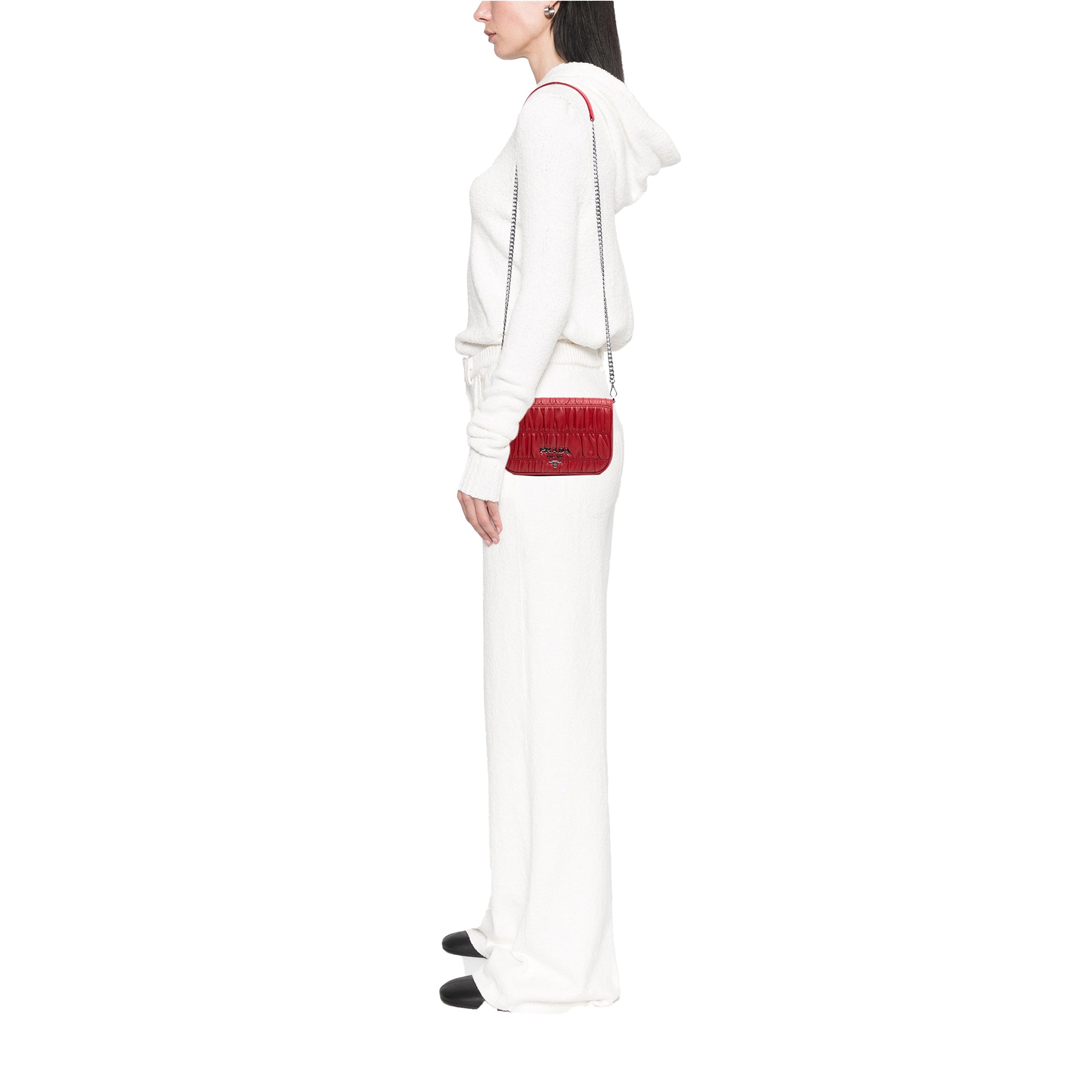 This crossbody bag features a gathered leather body, a curb chain link strap with leather guard, a front flap with magnetic button closure, and an interior slip pocket. Retail Price: 1325.00
