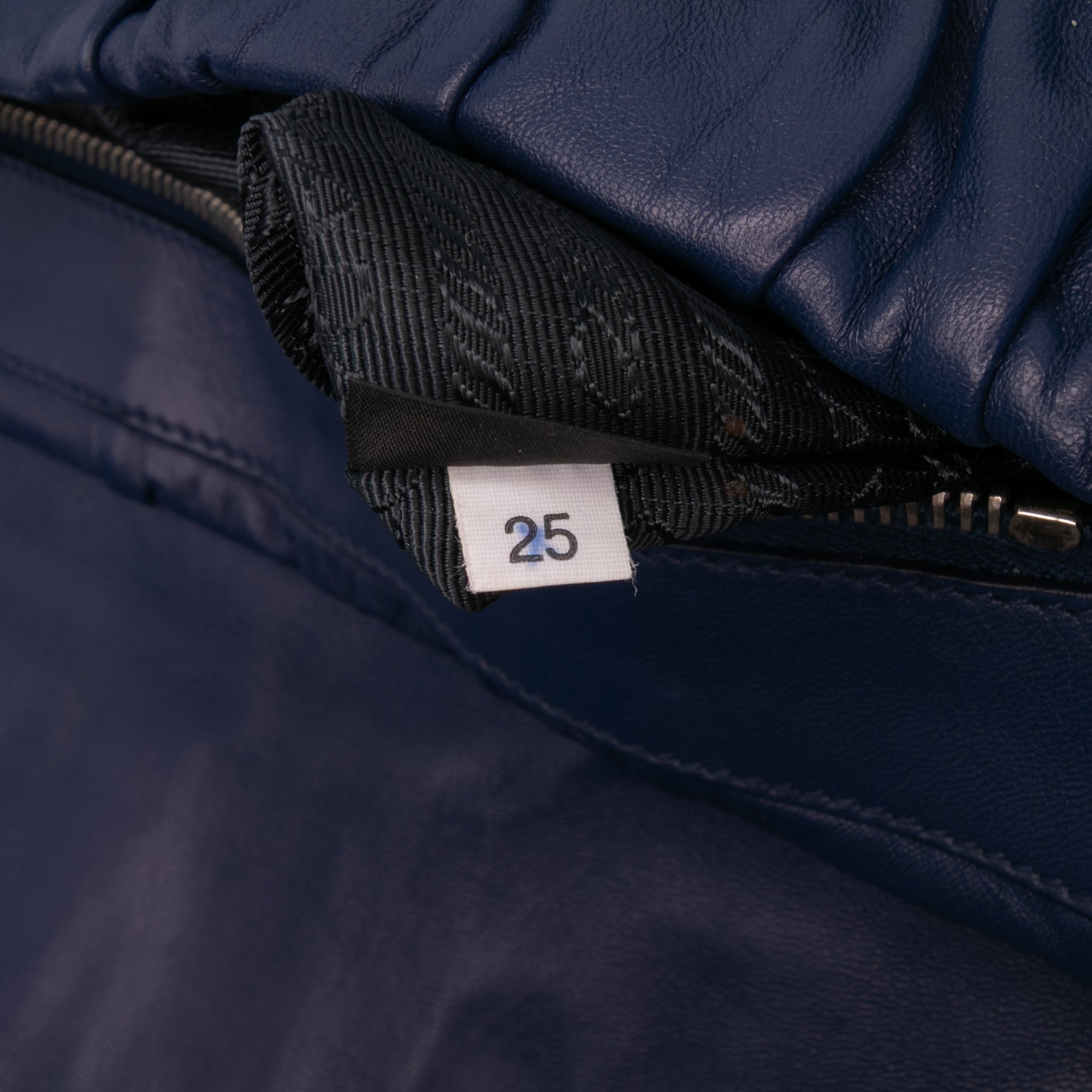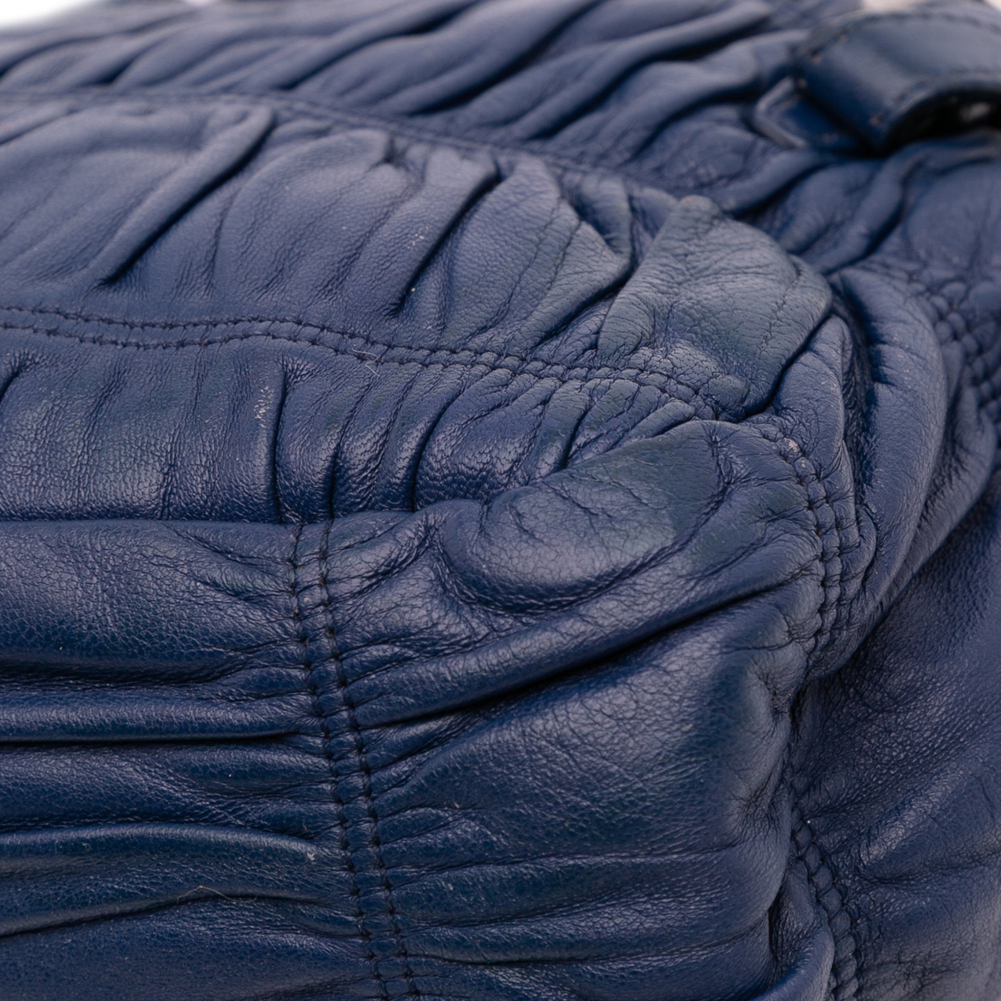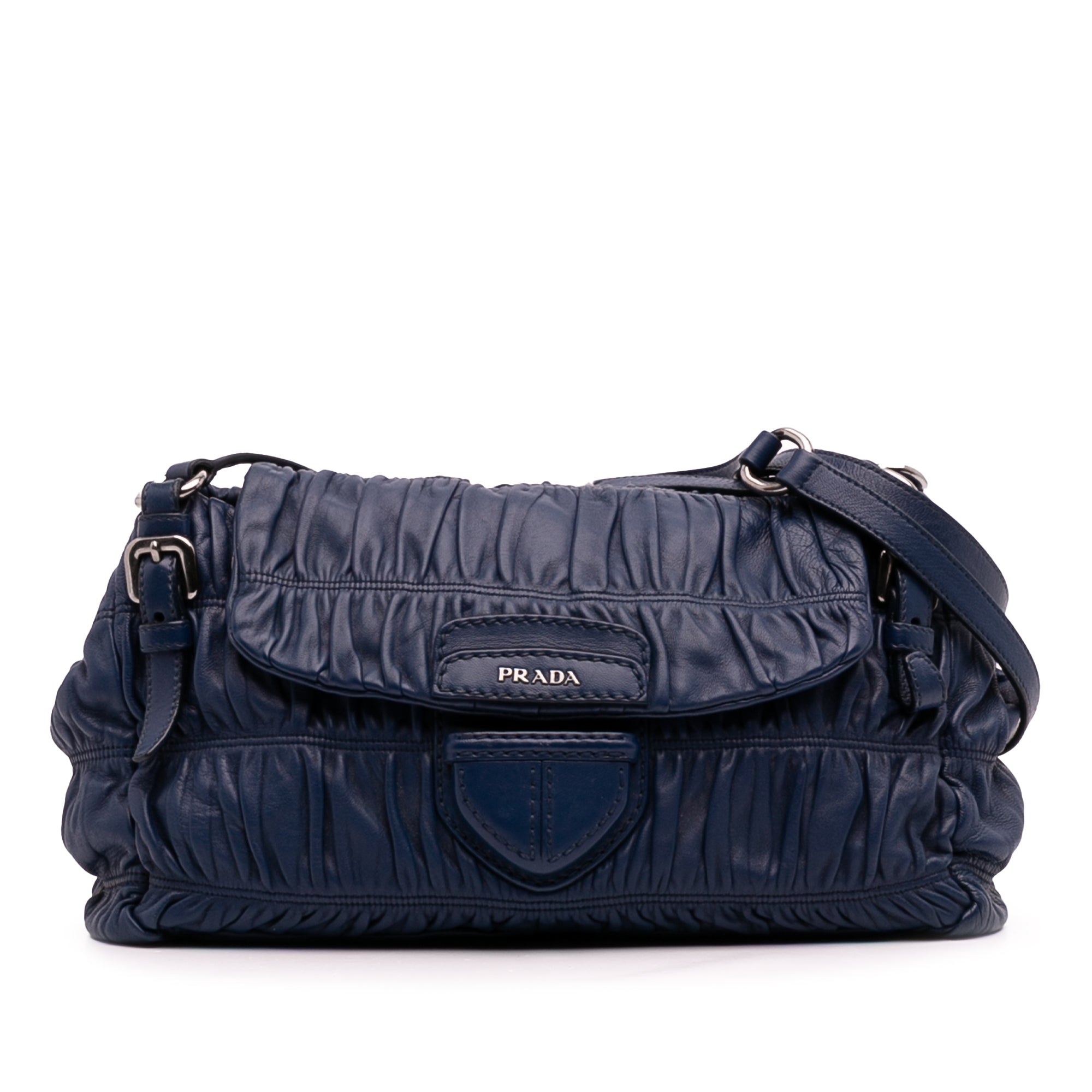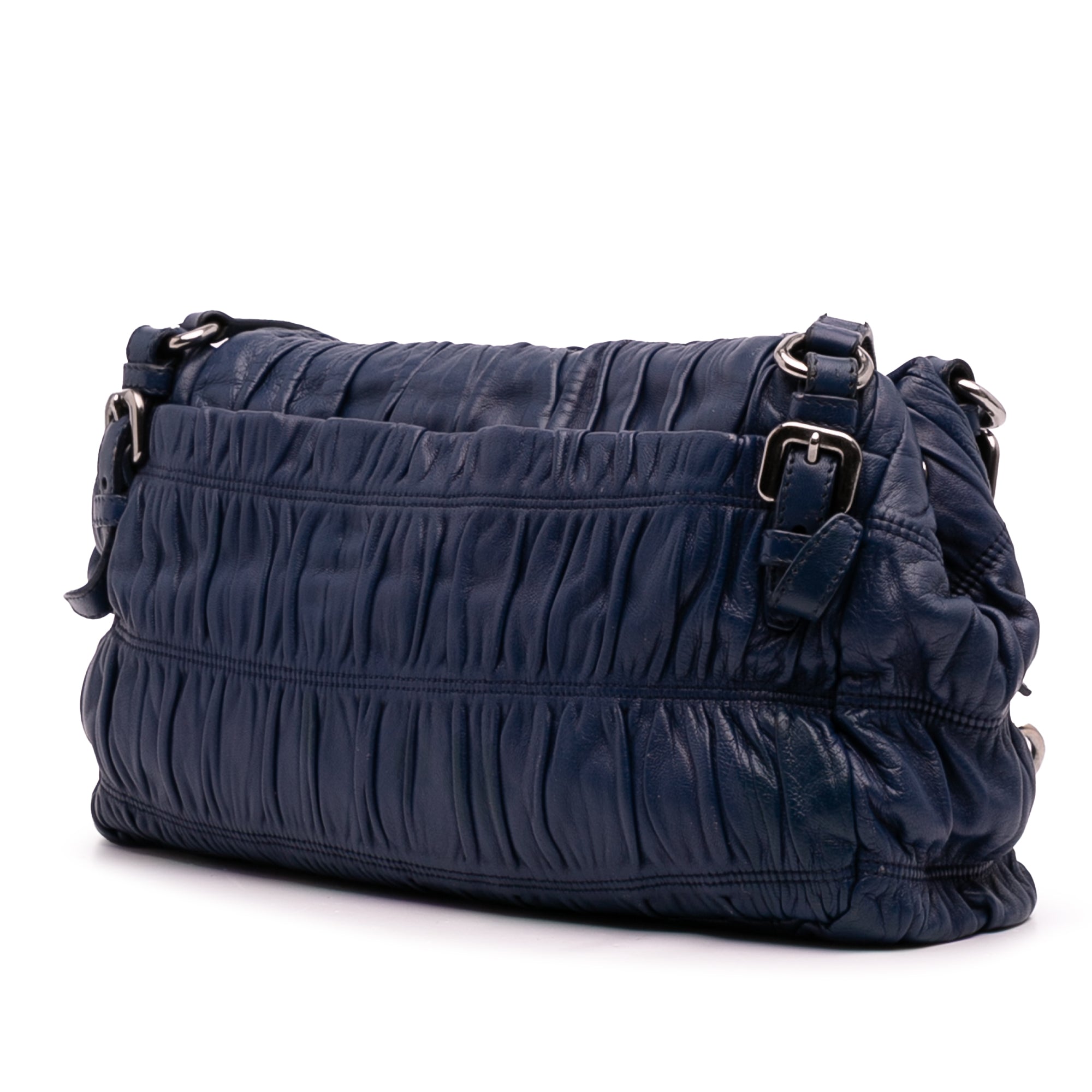 This shoulder bag features a gathered nappa leather body, flat leather straps, a front flap with push lock closure, an exterior back slip pocket, and interior zip and slip pockets. Retail Price: 2195.00