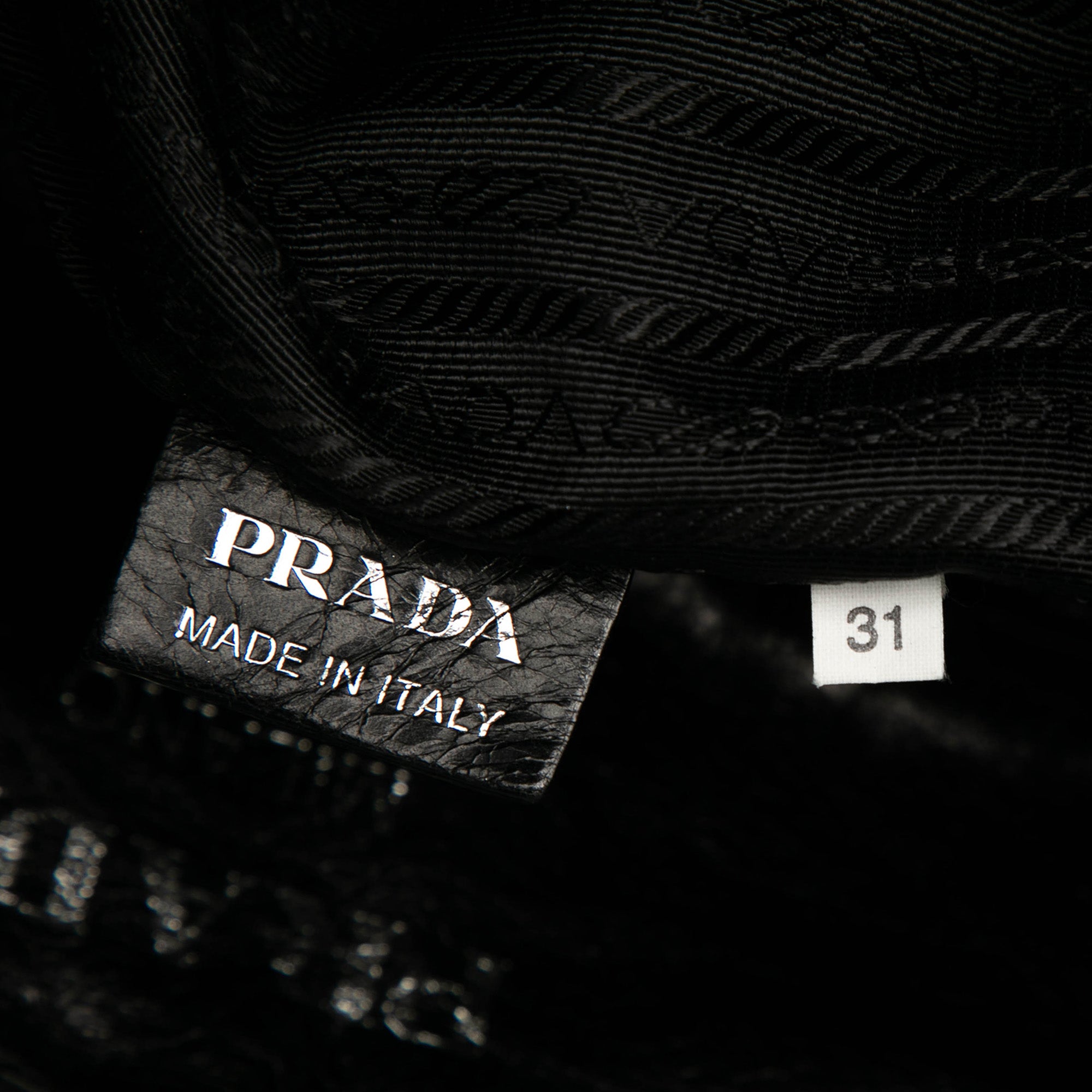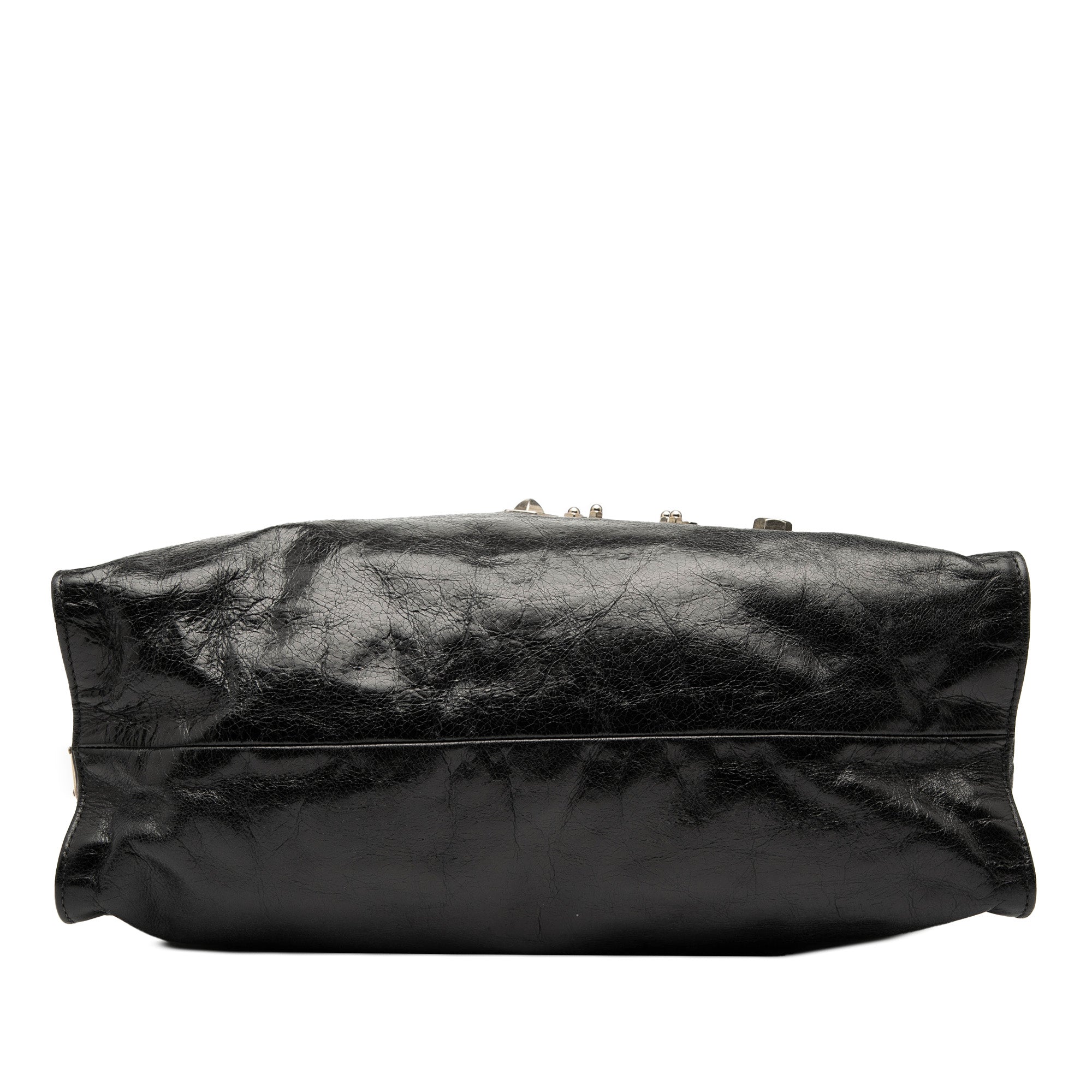 This tote bag features a leather body with a skull patch, flat leather straps, an open top with snap closure, and an interior zip pocket. Retail Price: 950.00