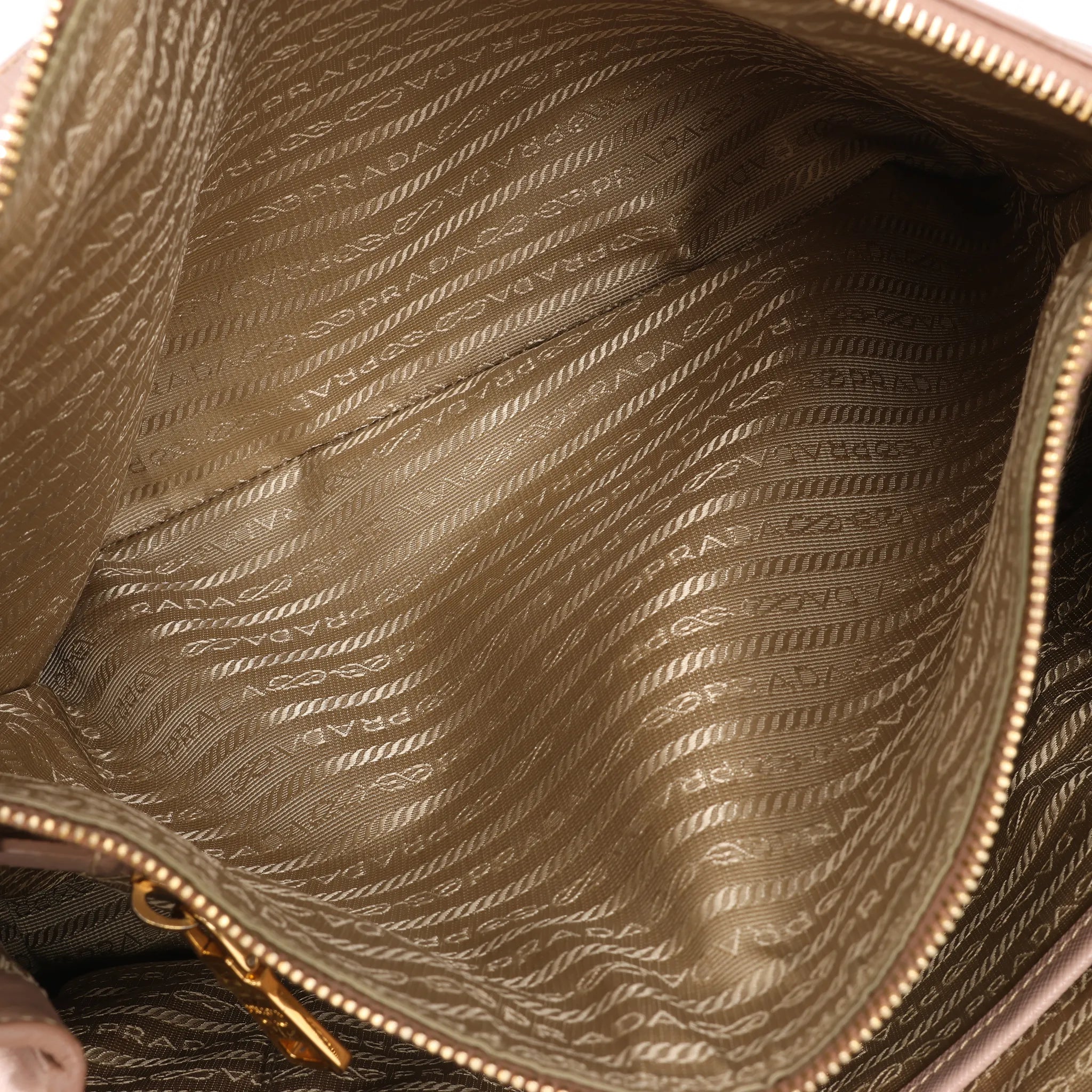 The Prada Galleria 2Way Handbag in pink Saffiano Lux leather exudes timeless elegance with its structured shape, gold-tone hardware, and versatile carry options - crafted for refined everyday style.