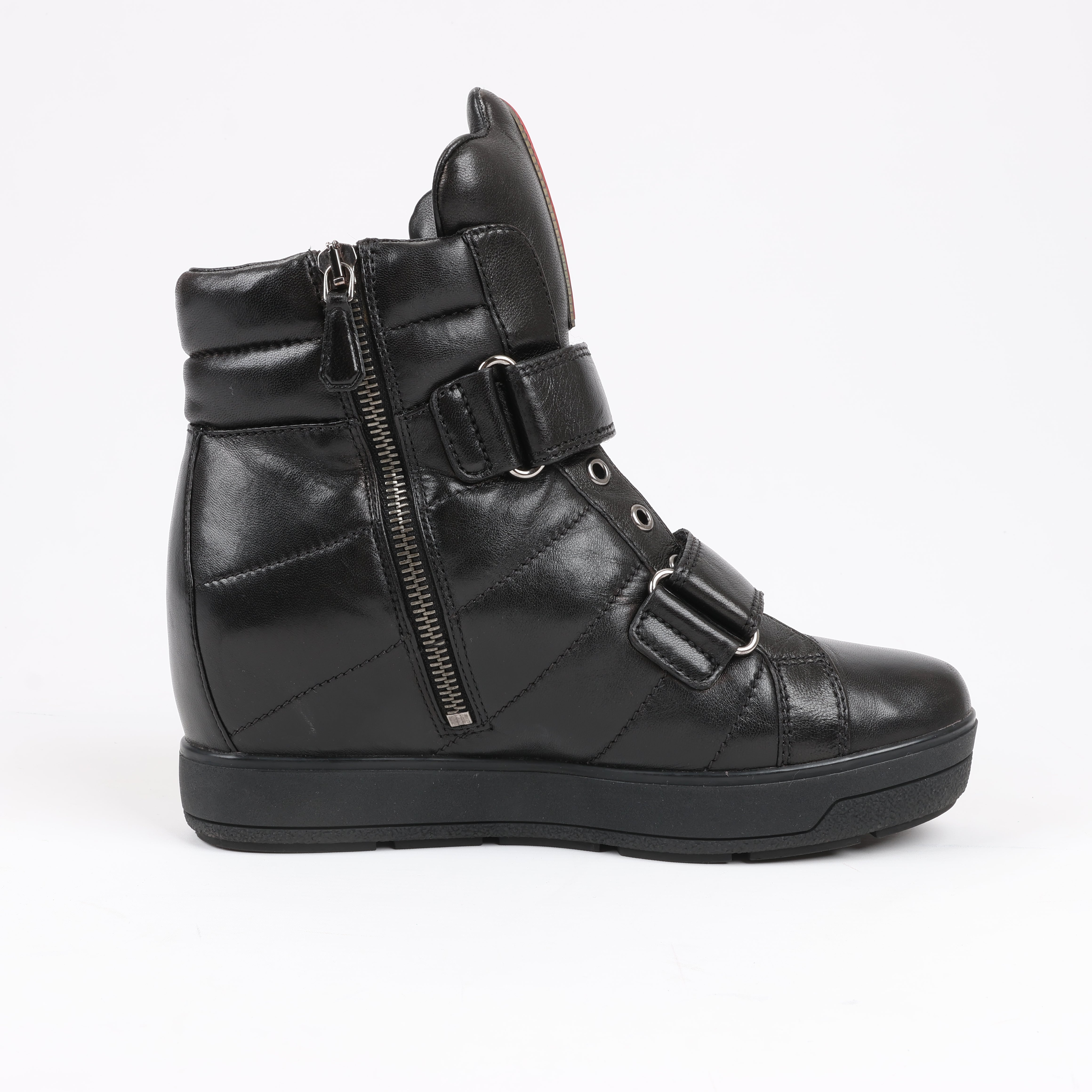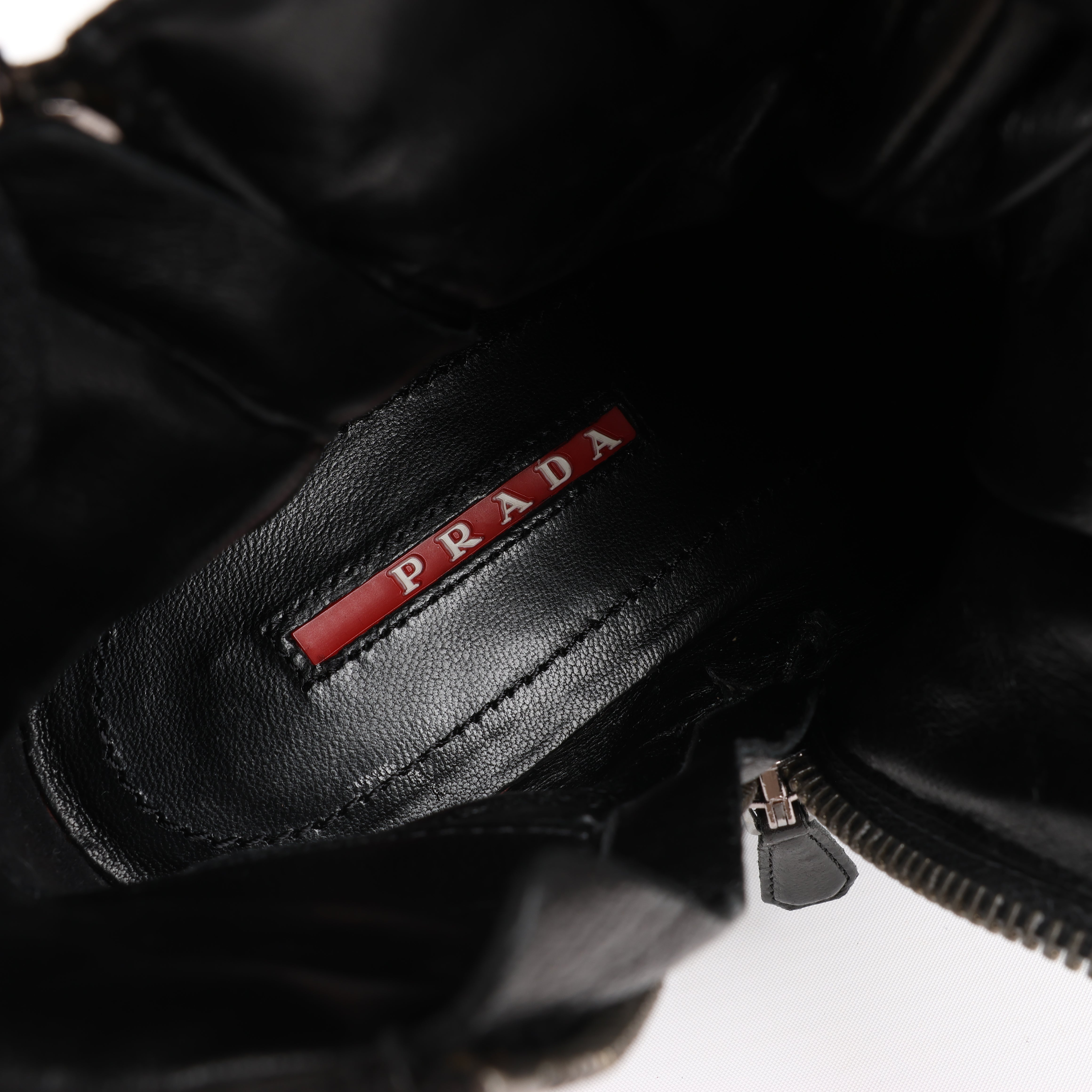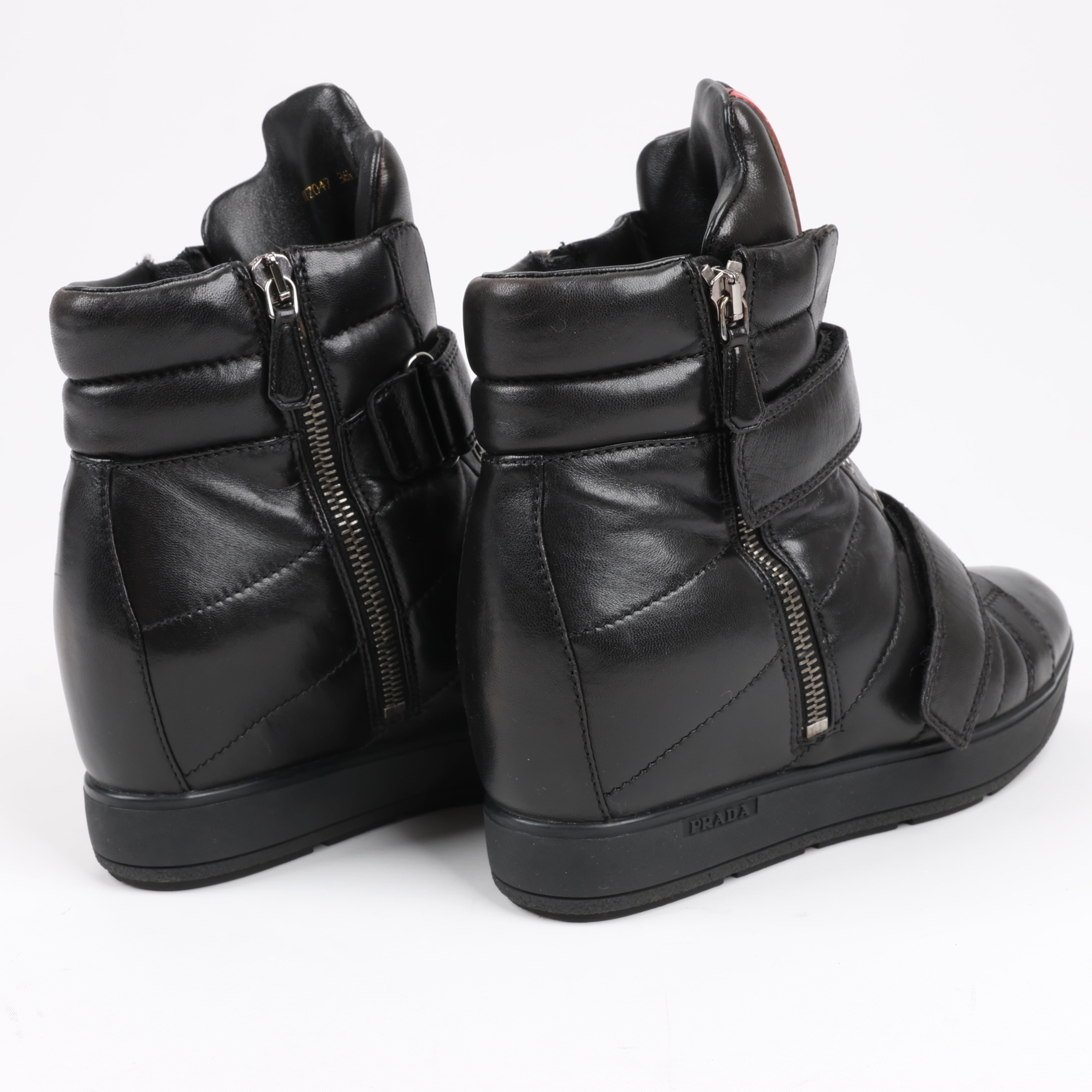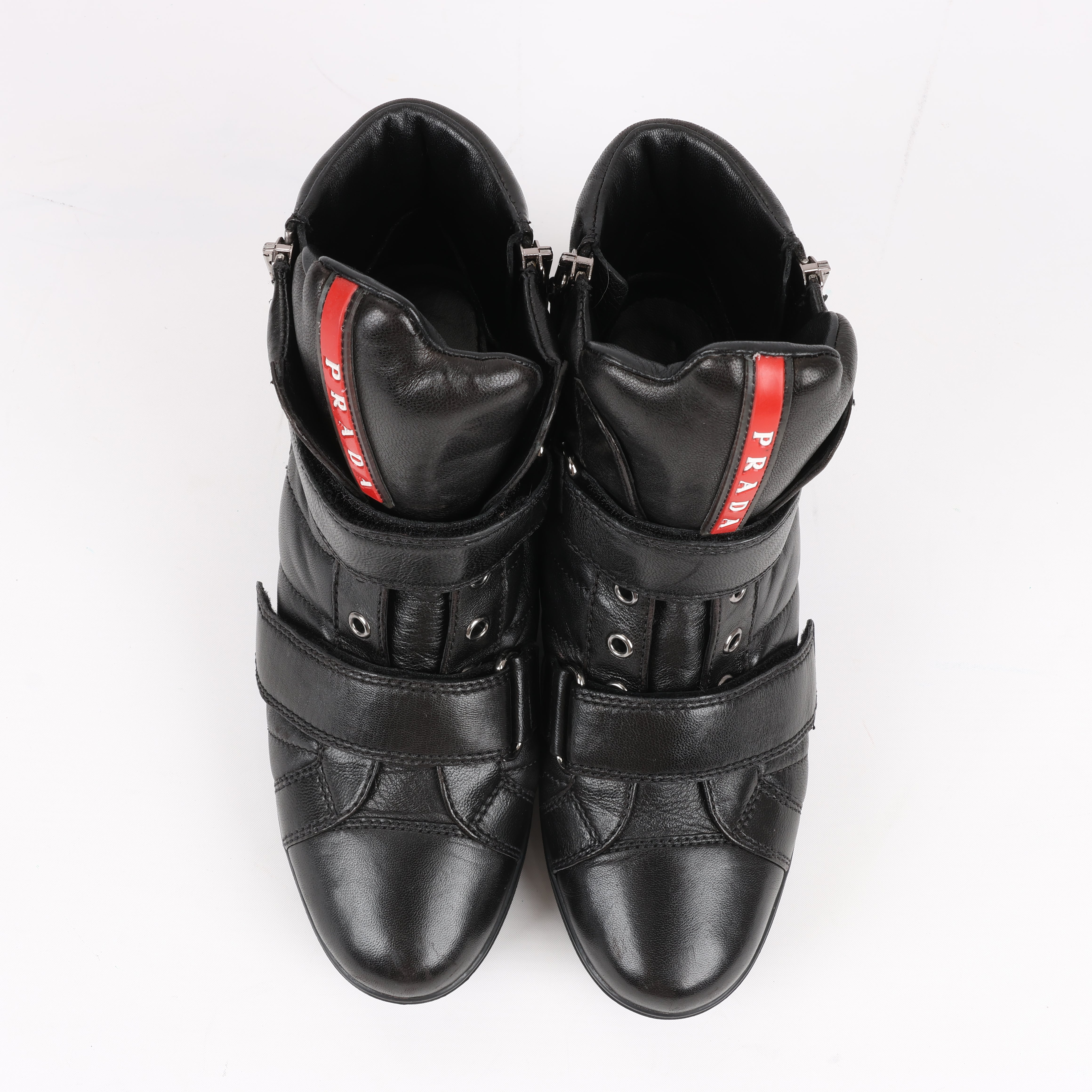Prada Sport leather high-top sneakers in black, size 36.5 EU. Featuring a sleek design with Velcro straps, padded ankle support, and the signature red Prada logo detail, these sneakers offer a perfect blend of luxury, comfort, and urban edge.