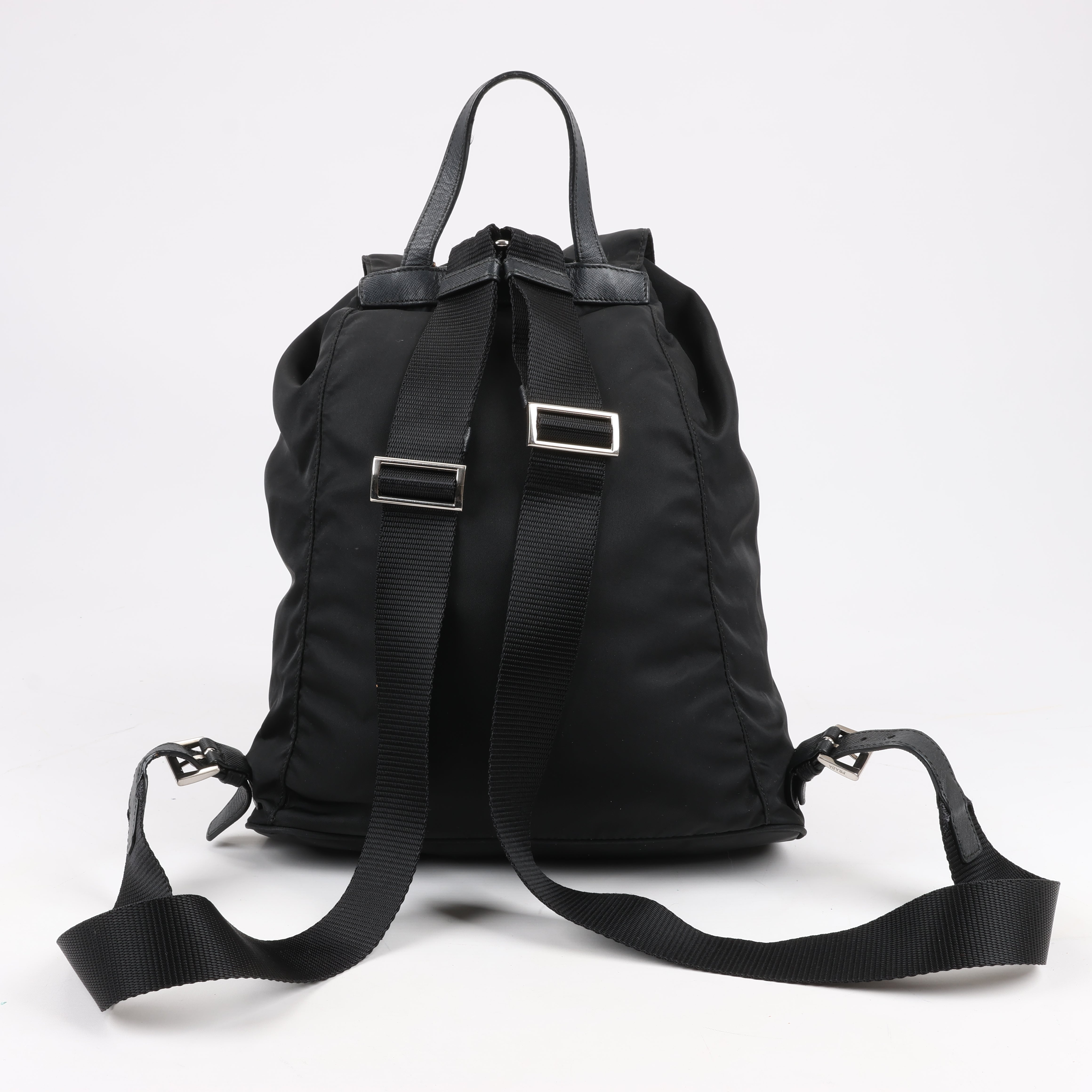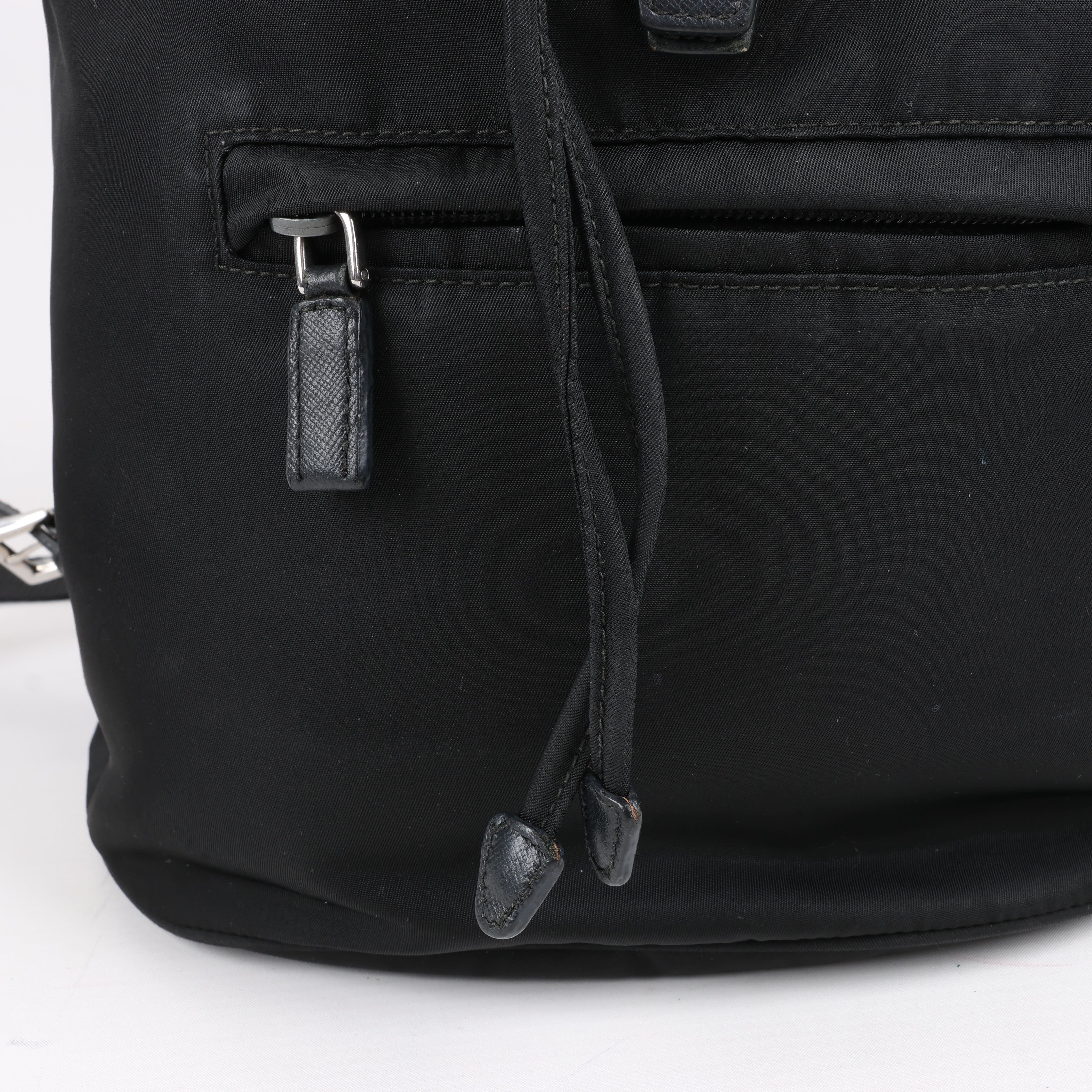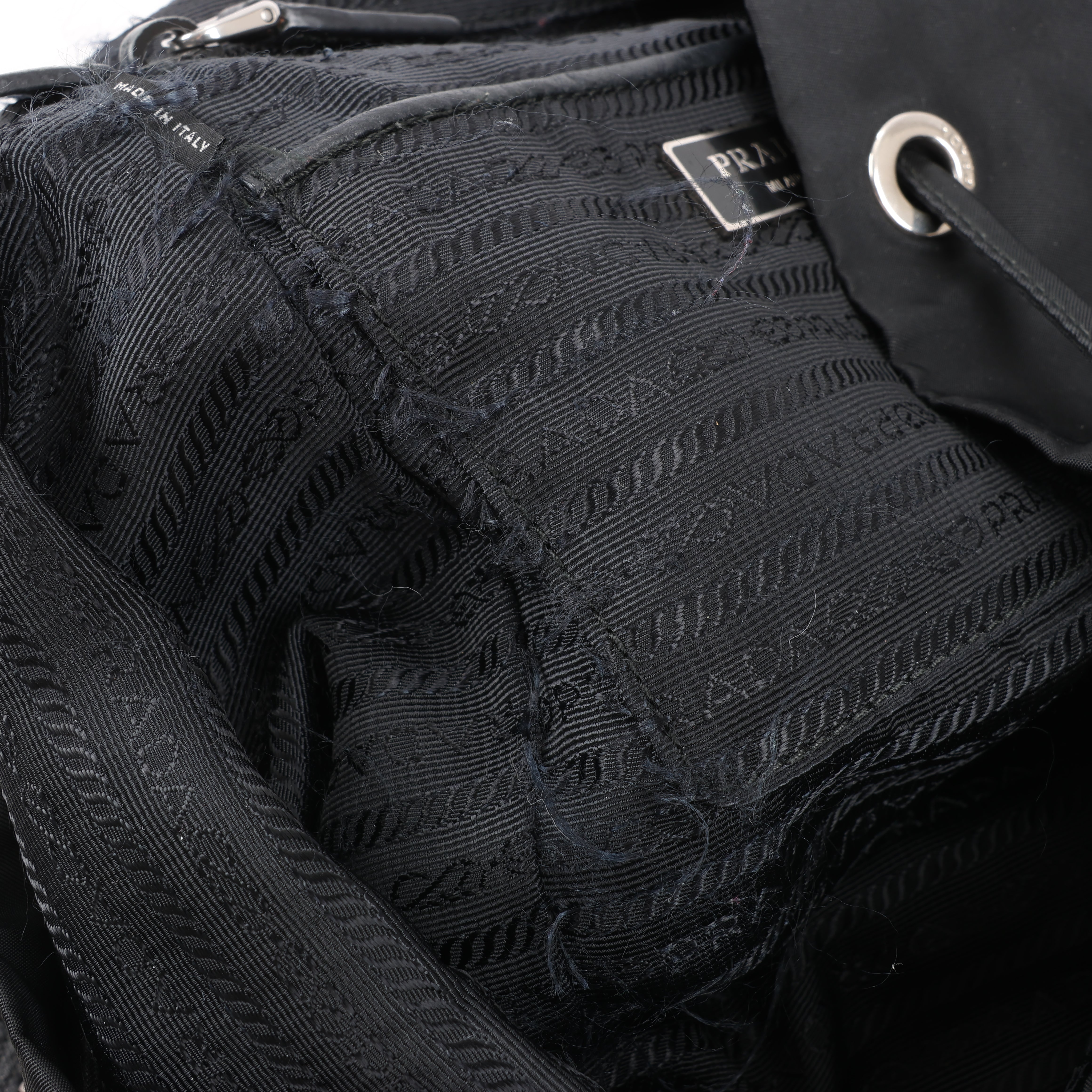 The Prada Tessuto Fabric x Leather Backpack in black is the perfect blend of luxury and functionality. Crafted from durable nylon with leather accents, it features a drawstring closure, buckle flap, and iconic triangle logo. A stylish essential for everyday adventures.