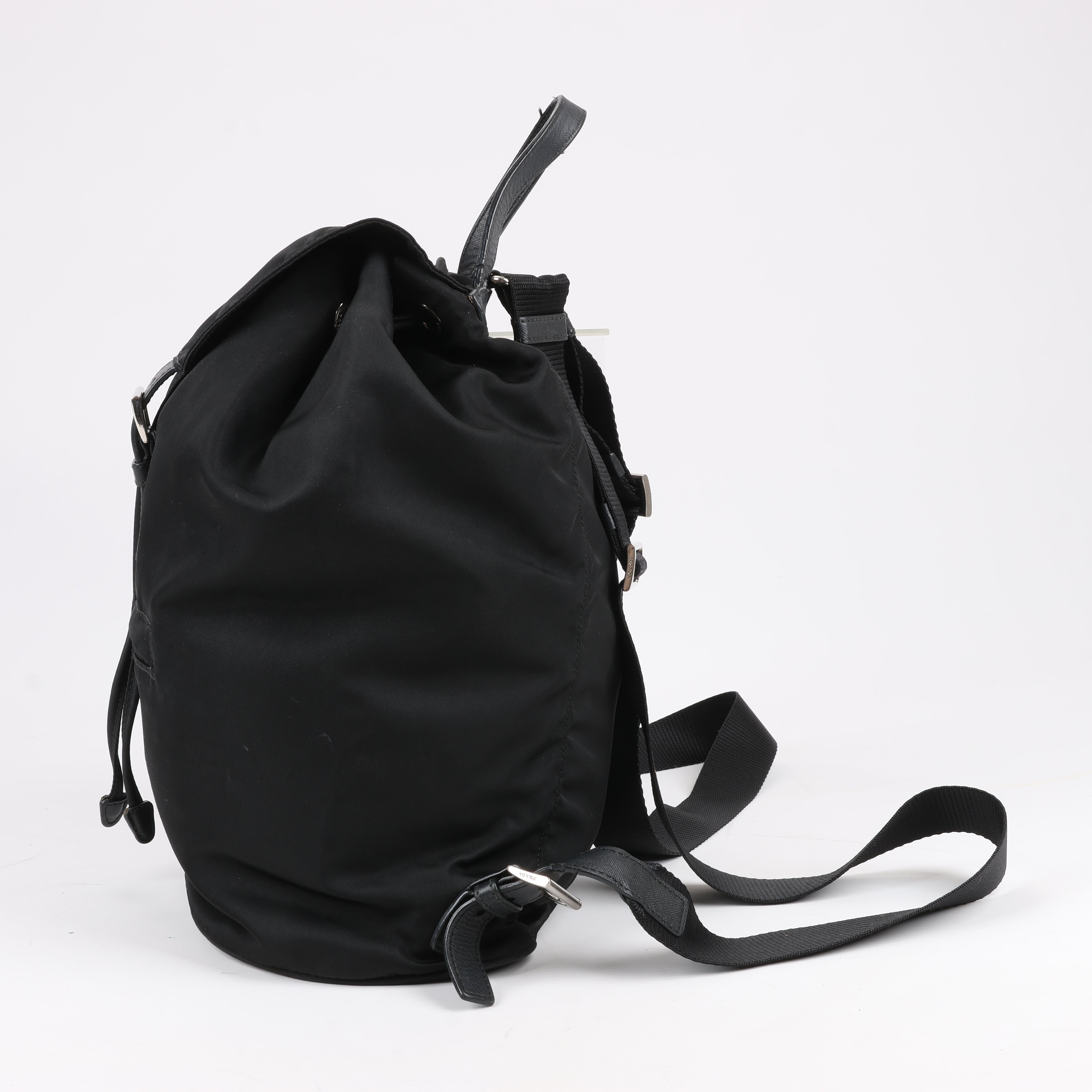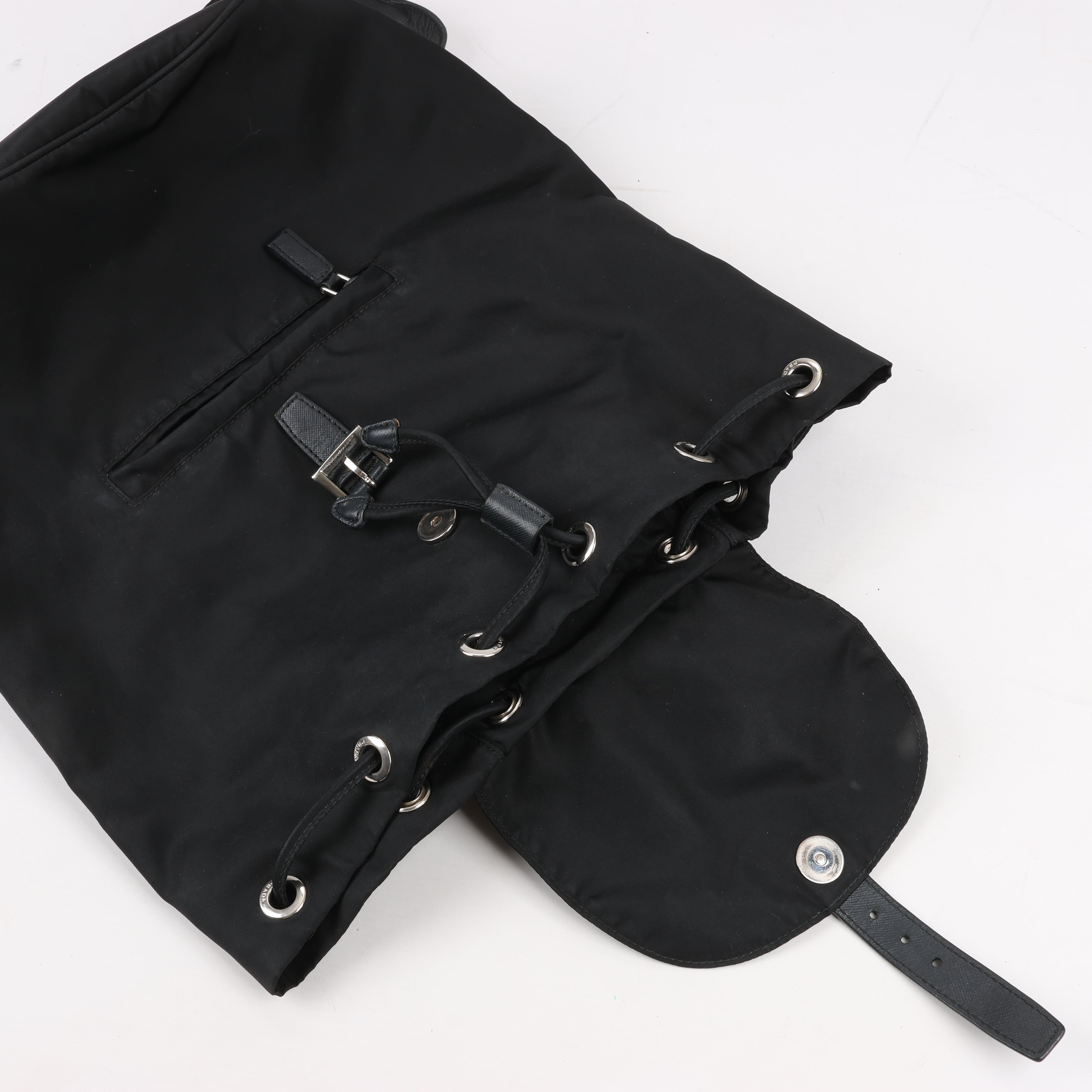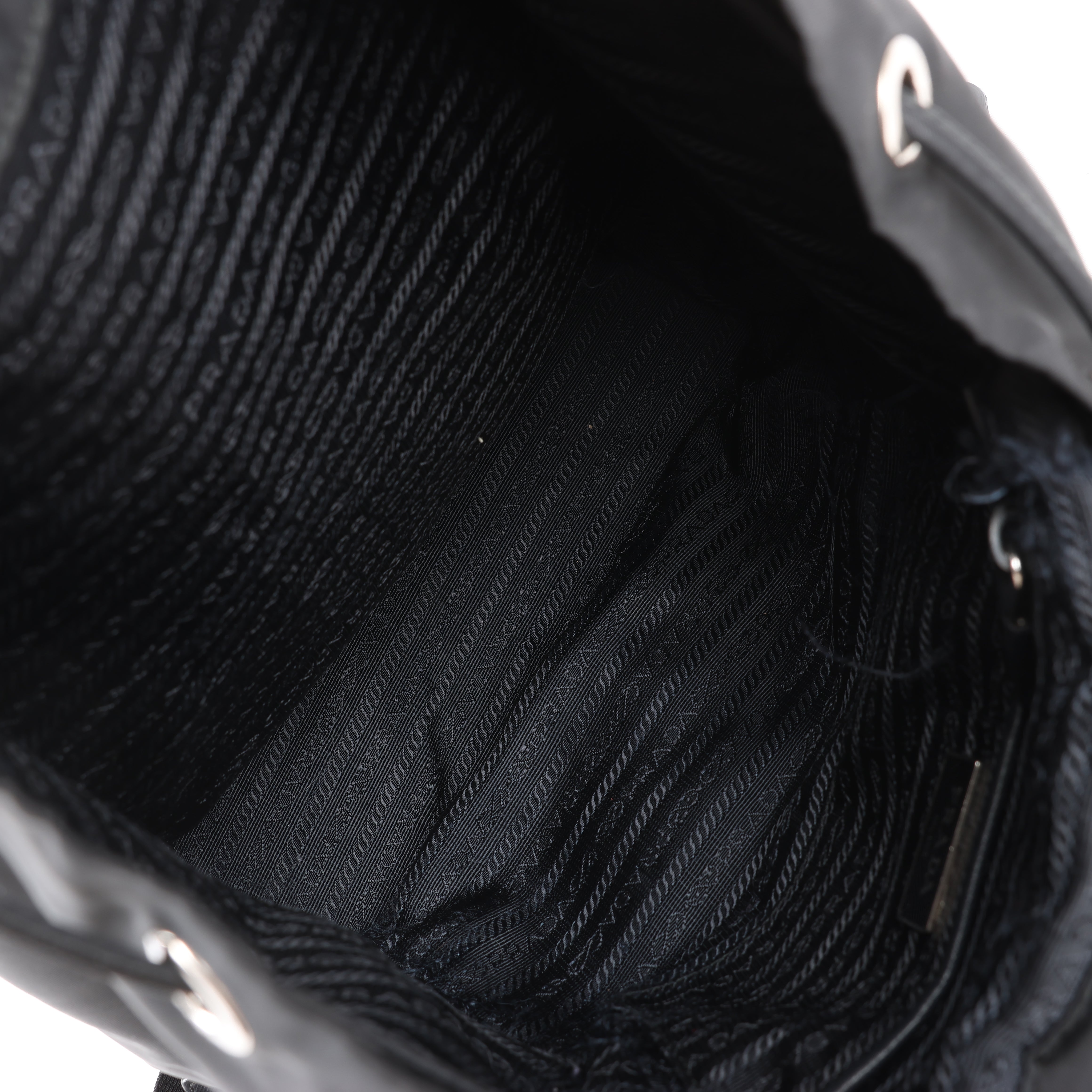The Prada Tessuto Fabric x Leather Backpack in black is the perfect blend of luxury and functionality. Crafted from durable nylon with leather accents, it features a drawstring closure, buckle flap, and iconic triangle logo. A stylish essential for everyday adventures.