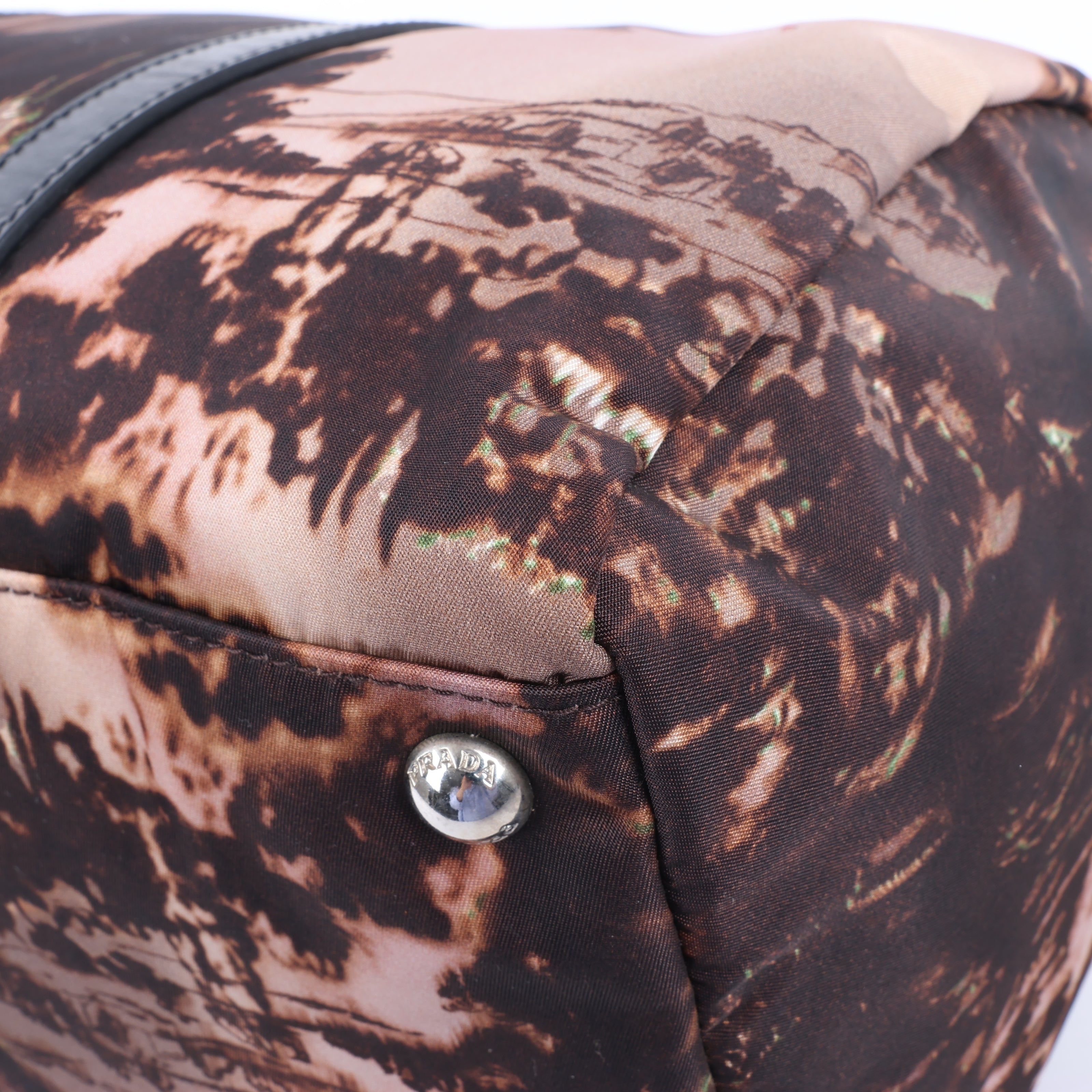 Prada Tessuto Stampato BL0922 in black and purple nylon with leather trim, featuring a striking landscape print and 2-way carry design. A bold fusion of artistic flair and functional luxury.