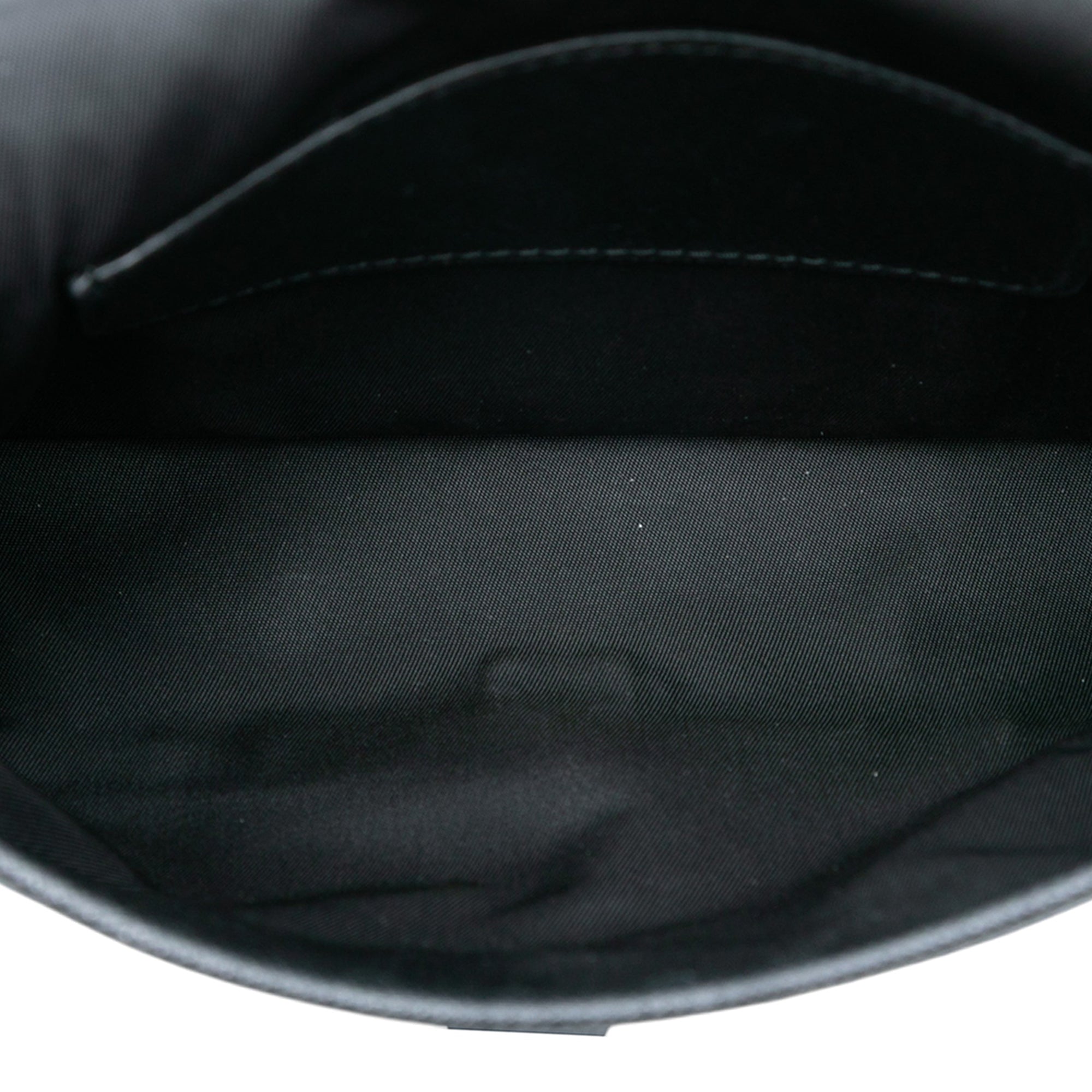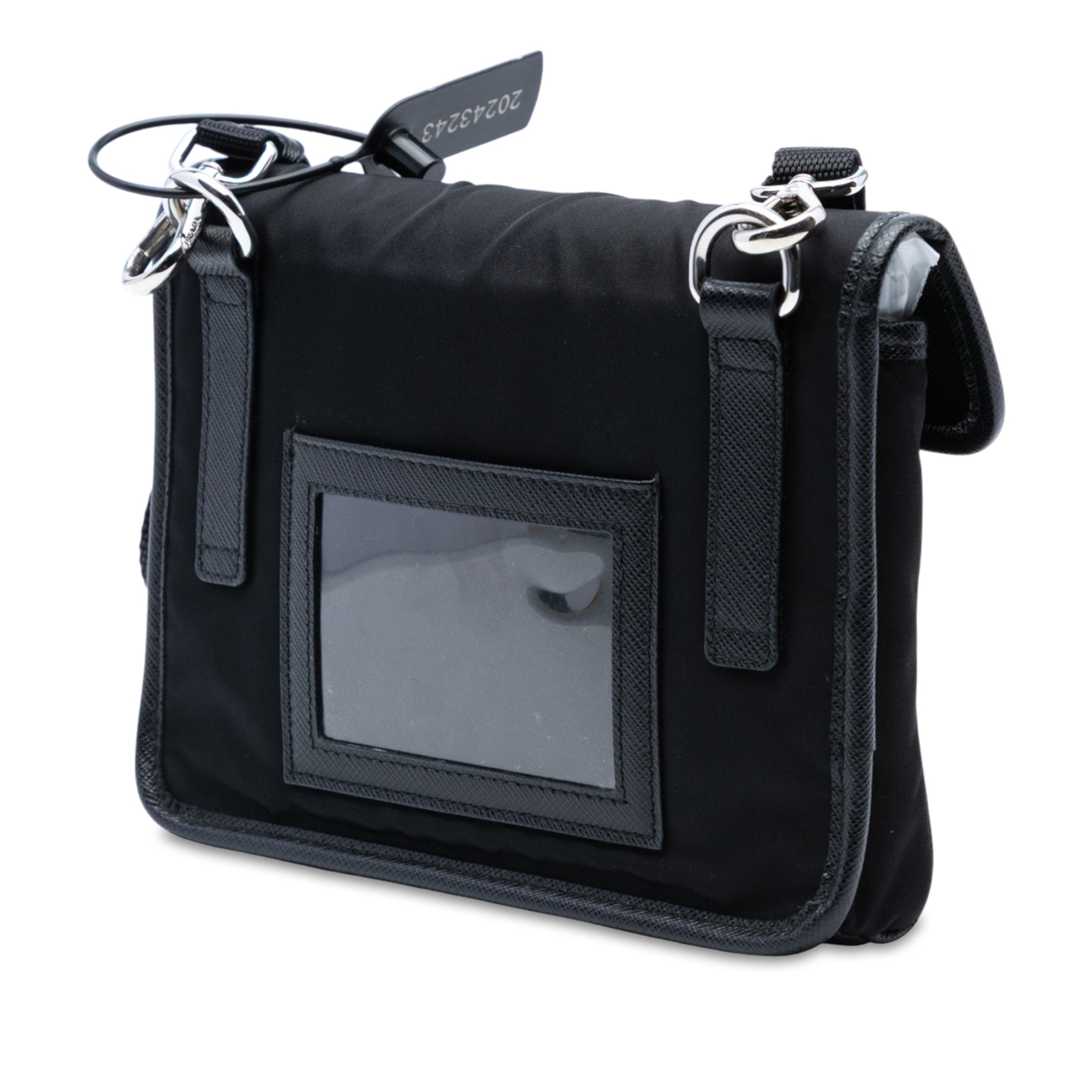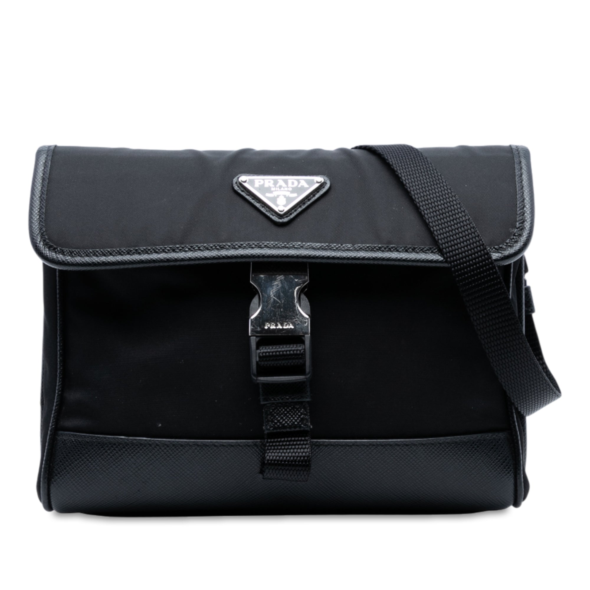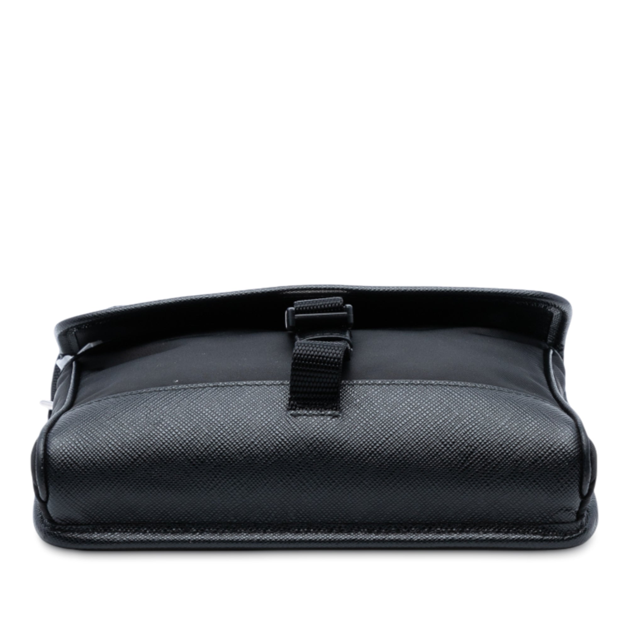 This crossbody bag features a nylon body with Saffiano leather trim, flat shoulder strap, a front flap with buckle closure, an exterior back slip pocket, and an interior slip pocket. Retail Price: 1675.00