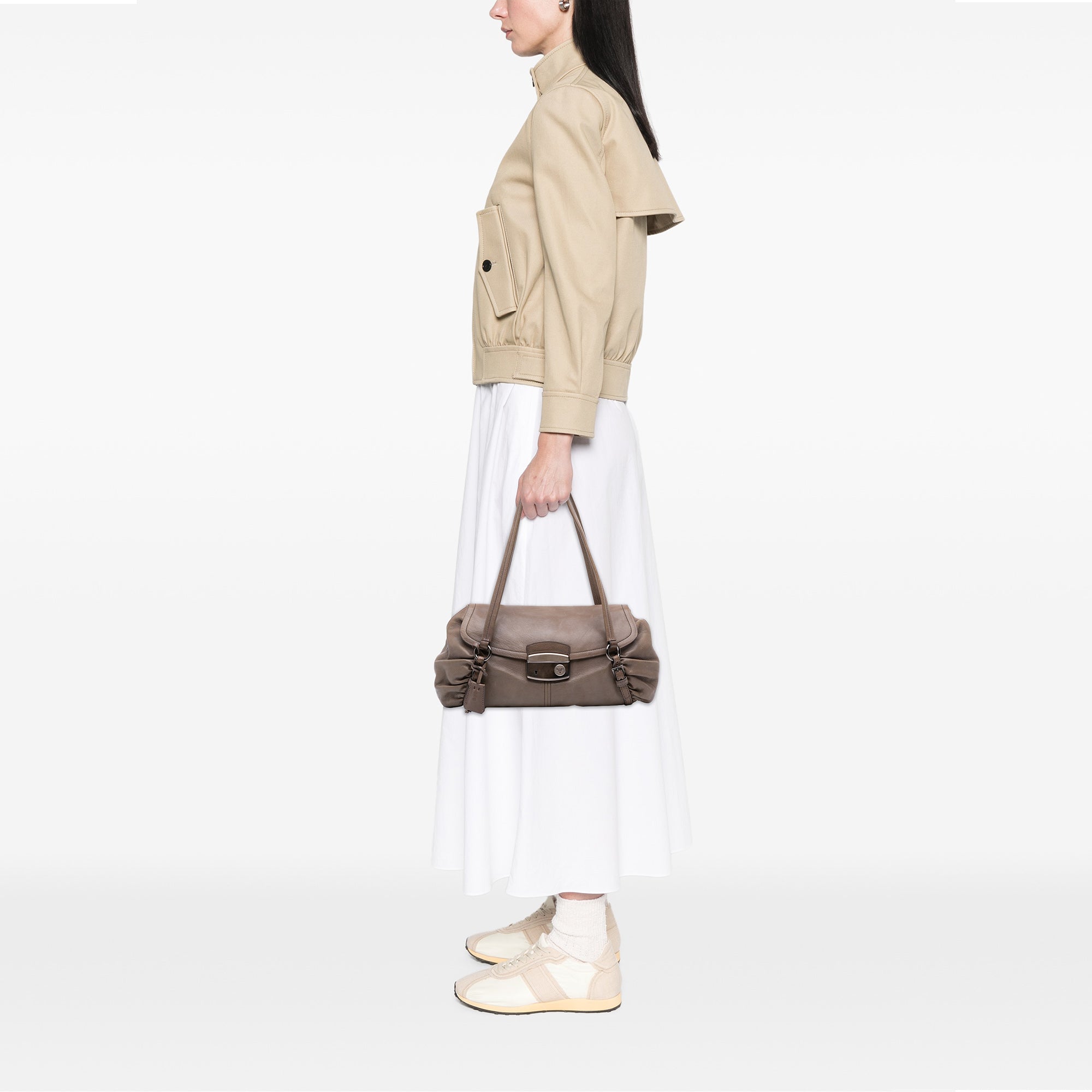 This shoulder bag features a leather body, flat leather handles, a front flap with a push lock closure, and an interior zip pocket. Retail Price: 1195.00