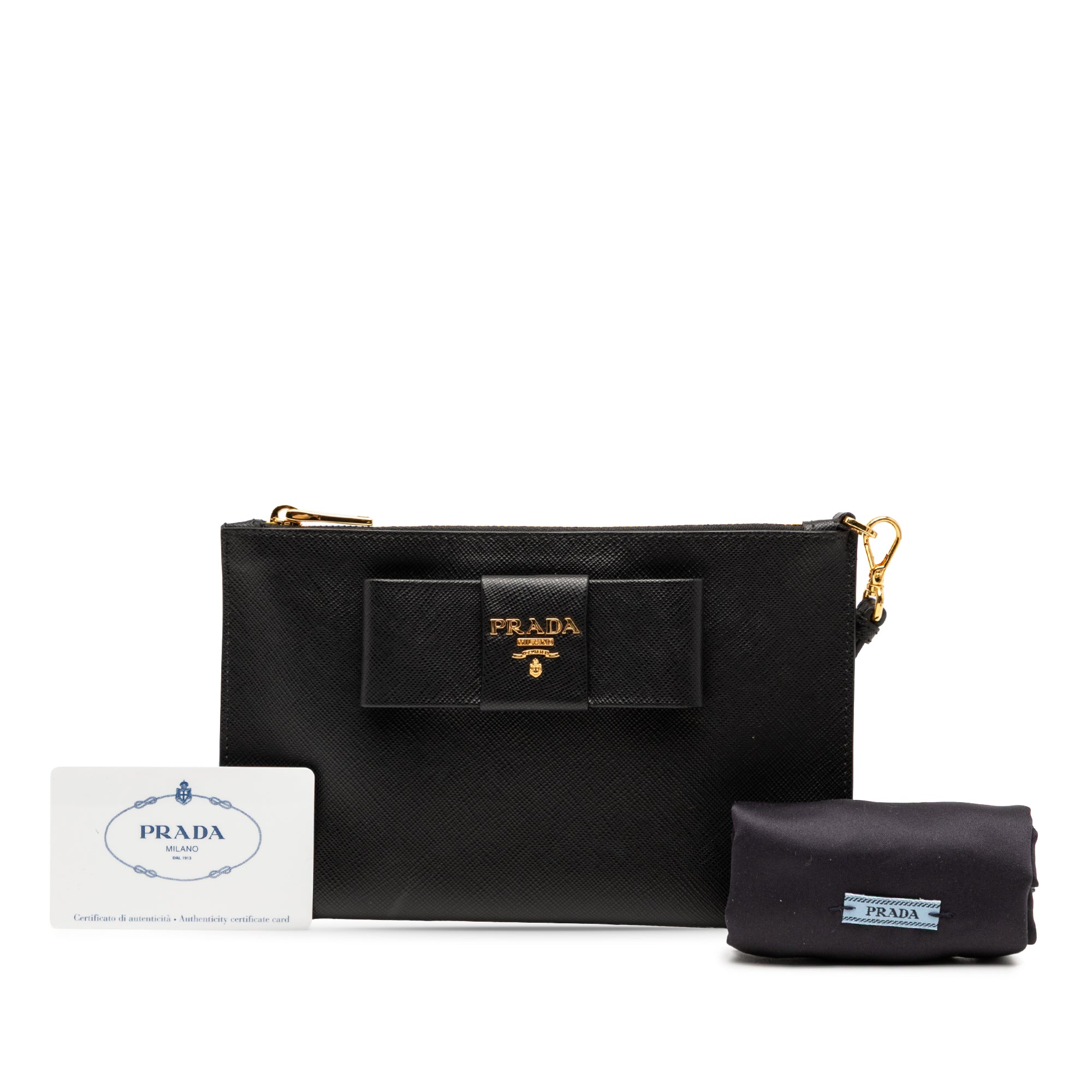 This clutch features a saffiano leather with front bow detail, a detachable flat leather wrist strap, a top zip closure, and interior slip pockets. Inclusion: Dust bag, authenticity card. Retail Price: 650.00