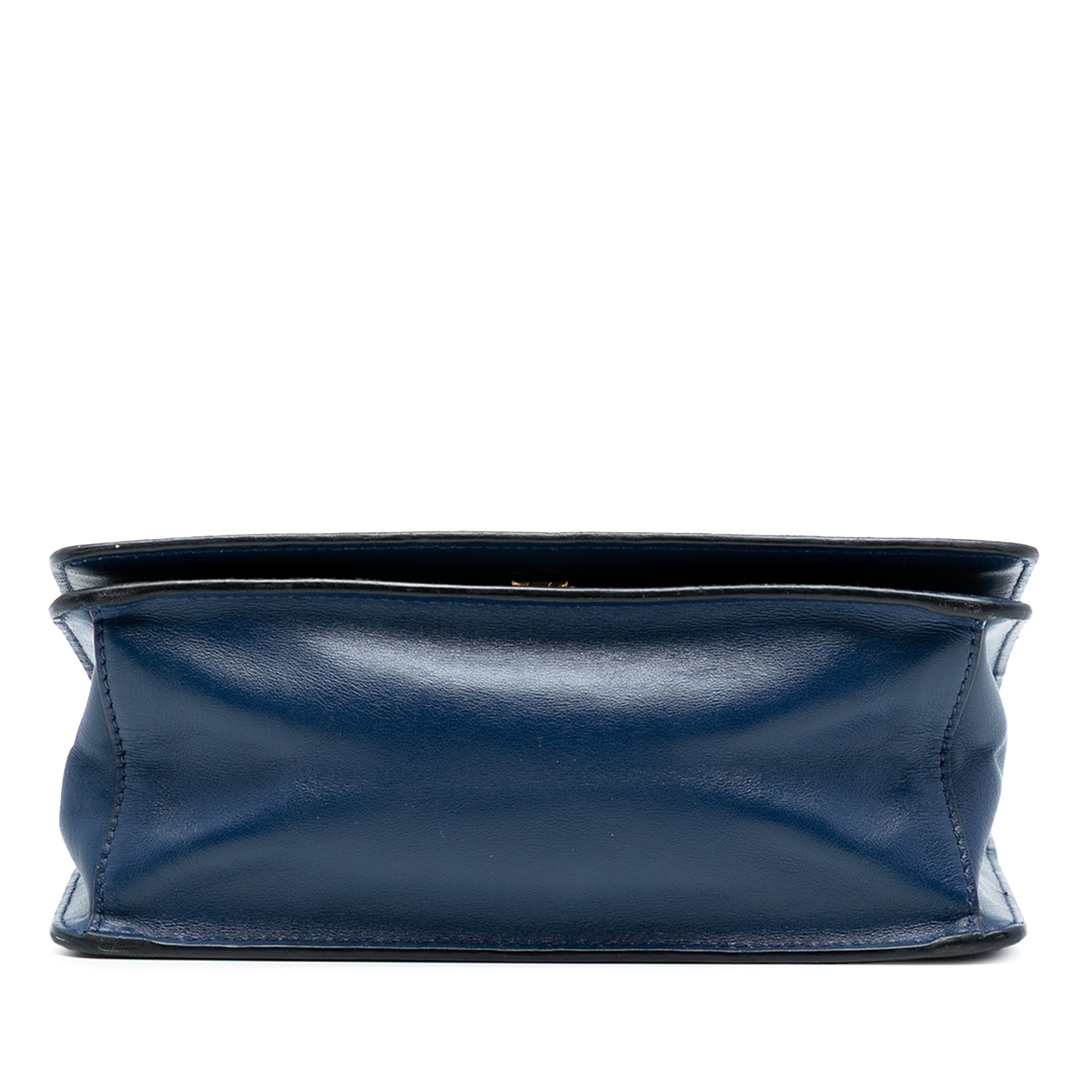 This crossbody bag features a saffiano leather body, a chain link strap with leather shoulder guard, a front flap with snap button closure, and an interior slip pocket. Retail Price: 1950.00