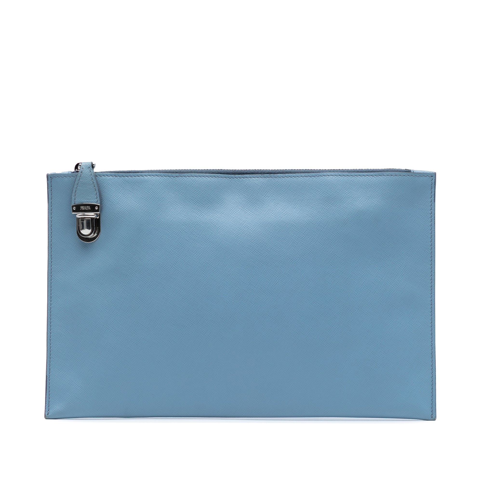This clutch bag features a saffiano leather body, top zip closure with metal lock closure, and interior zip and slip pockets. Retail Price: 800.00