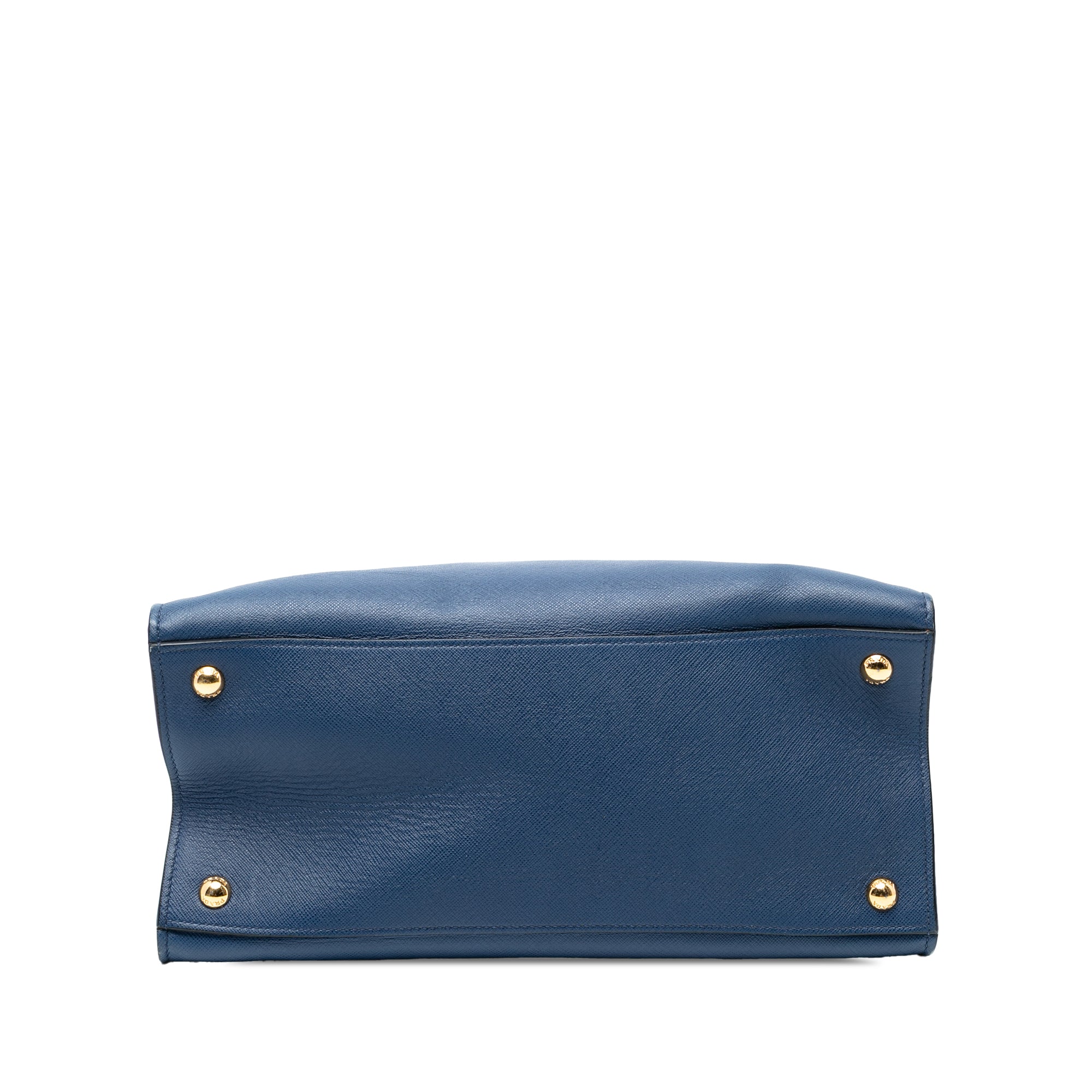 This satchel features a saffiano leather body, flat leather handles, a detachable strap, open compartments with magnetic snap closure, a top zip compartment, and interior zip and slip pockets. Retail Price: 2250.00