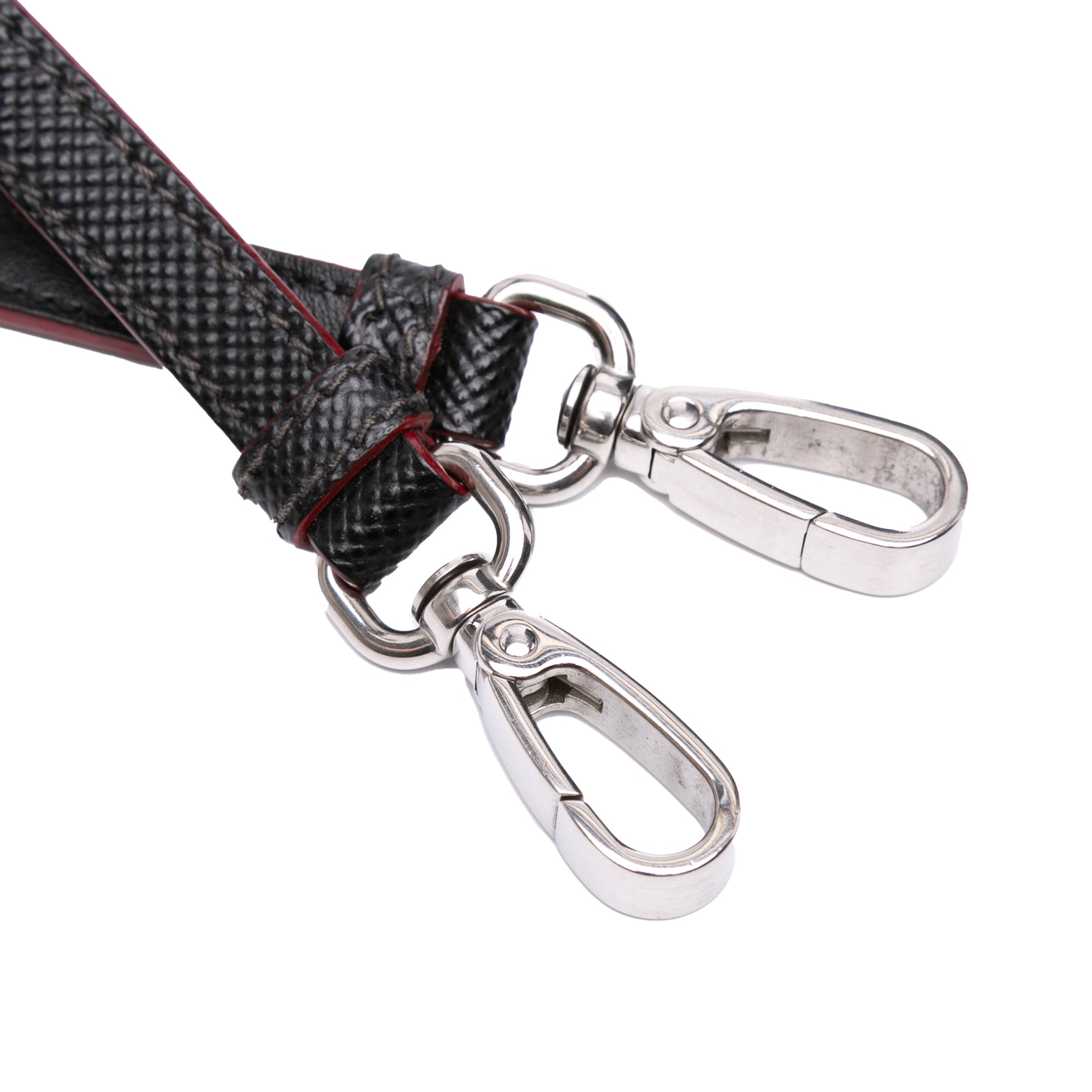 This bucket bag features a nylon body with saffiano leather trim, a flat leather handle, a detachable flat leather strap, a top drawstring closure, and an interior slip pocket. Retail Price: 2350.00