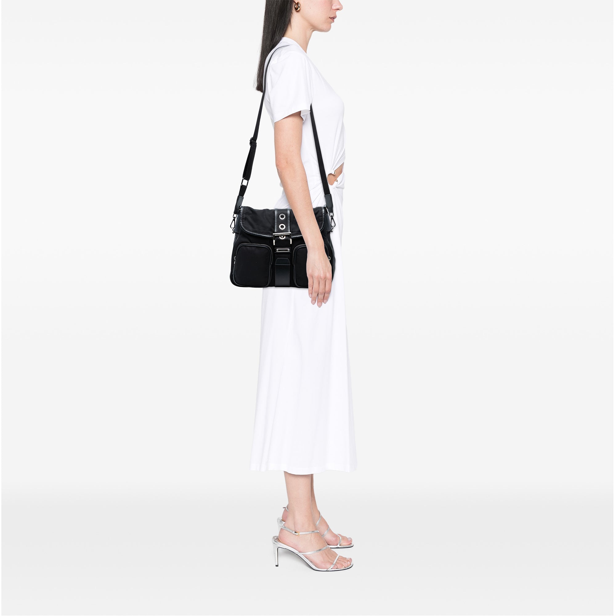 This crossbody bag features a nylon body with saffiano leather trim, a detachable and adjustable flat strap, a front flap with buckle closure, exterior front zip pockets, and interior zip pocket. Retail Price: 1300.00